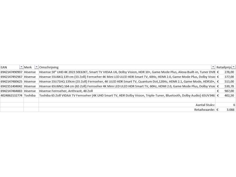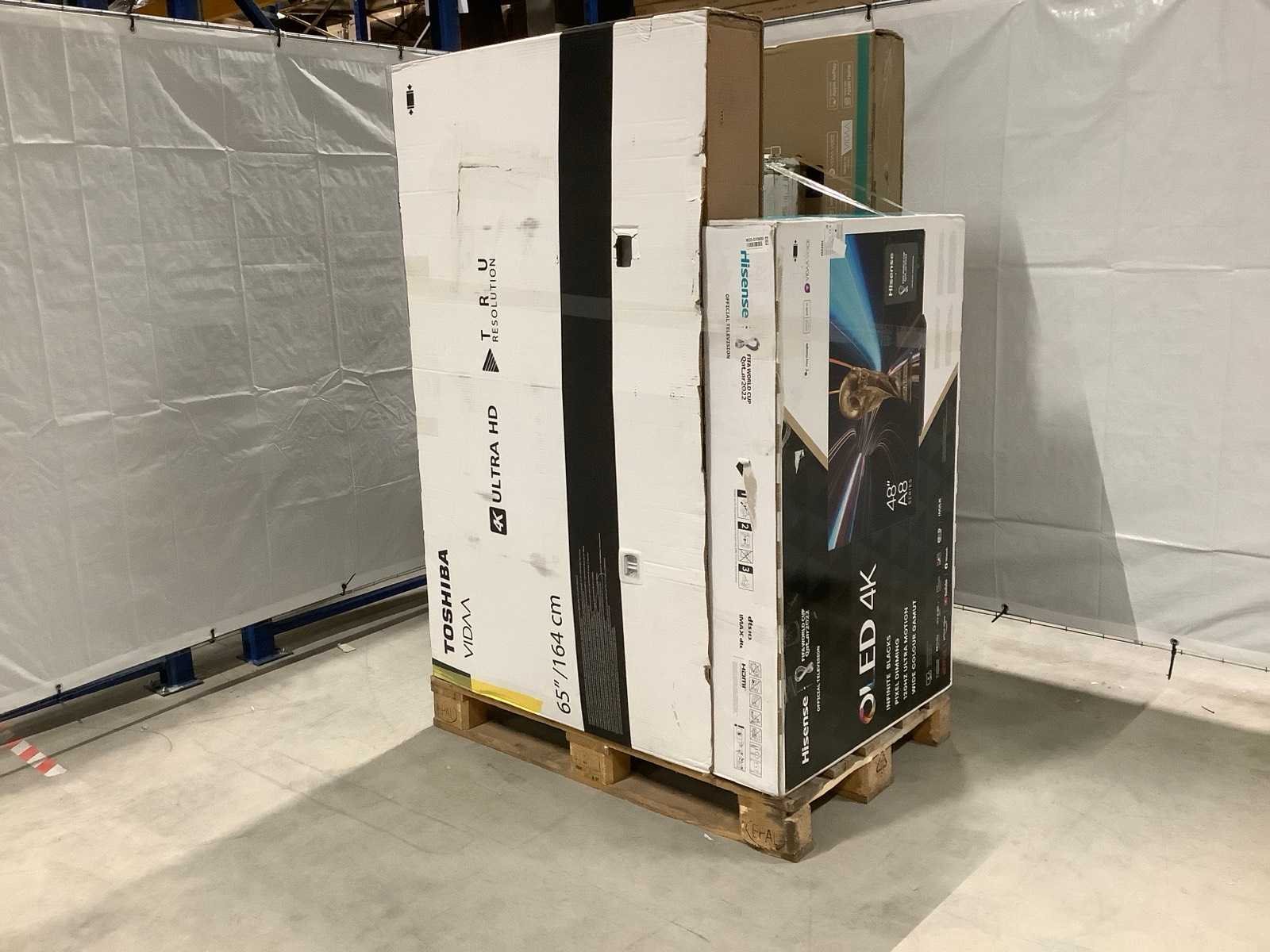 Dit betreft een partij televisies retourgoederen van een grote online retailer. De partij bestaat uit diverse diverse maten televisies. Aantal stuks: 6. Retailwaarde: €3088,- De televisies zijn niet werkend en zijn te gebruiken voor onderdelen. Kom op de kijkdag om te om zo een goed beeld te krijgen van de reden van retour. Zie foto's voor lijst met inhoud. Bezorgtermijn 14 dagen Merk: Pallet Retourgoederen - Televisies