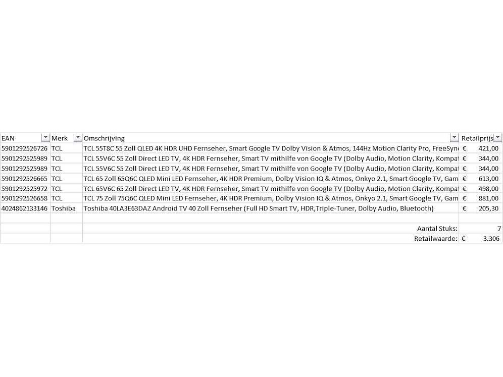 Dit betreft een partij televisies retourgoederen van een grote online retailer. De partij bestaat uit diverse diverse maten televisies. Aantal stuks: 7. Retailwaarde: €3306,- De televisies zijn niet werkend en zijn te gebruiken voor onderdelen. Kom op de kijkdag om te om zo een goed beeld te krijgen van de reden van retour. Zie foto's voor lijst met inhoud. Bezorgtermijn 14 dagen Merk: Pallet Retourgoederen - Televisies
