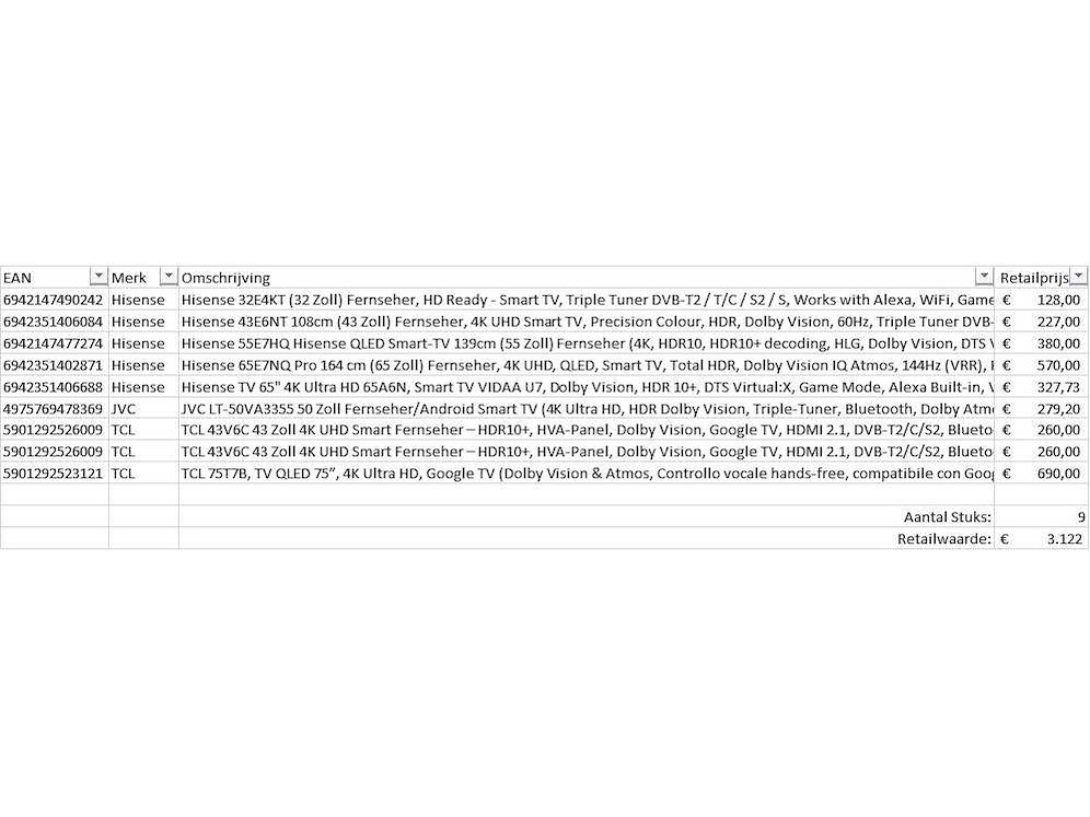 Dit betreft een partij televisies retourgoederen van een grote online retailer. De partij bestaat uit diverse diverse maten televisies. Aantal stuks: 9. Retailwaarde: €3122,- De televisies zijn niet werkend en zijn te gebruiken voor onderdelen. Kom op de kijkdag om te om zo een goed beeld te krijgen van de reden van retour. Zie foto's voor lijst met inhoud. Bezorgtermijn 14 dagen Merk: Pallet Retourgoederen - Televisies