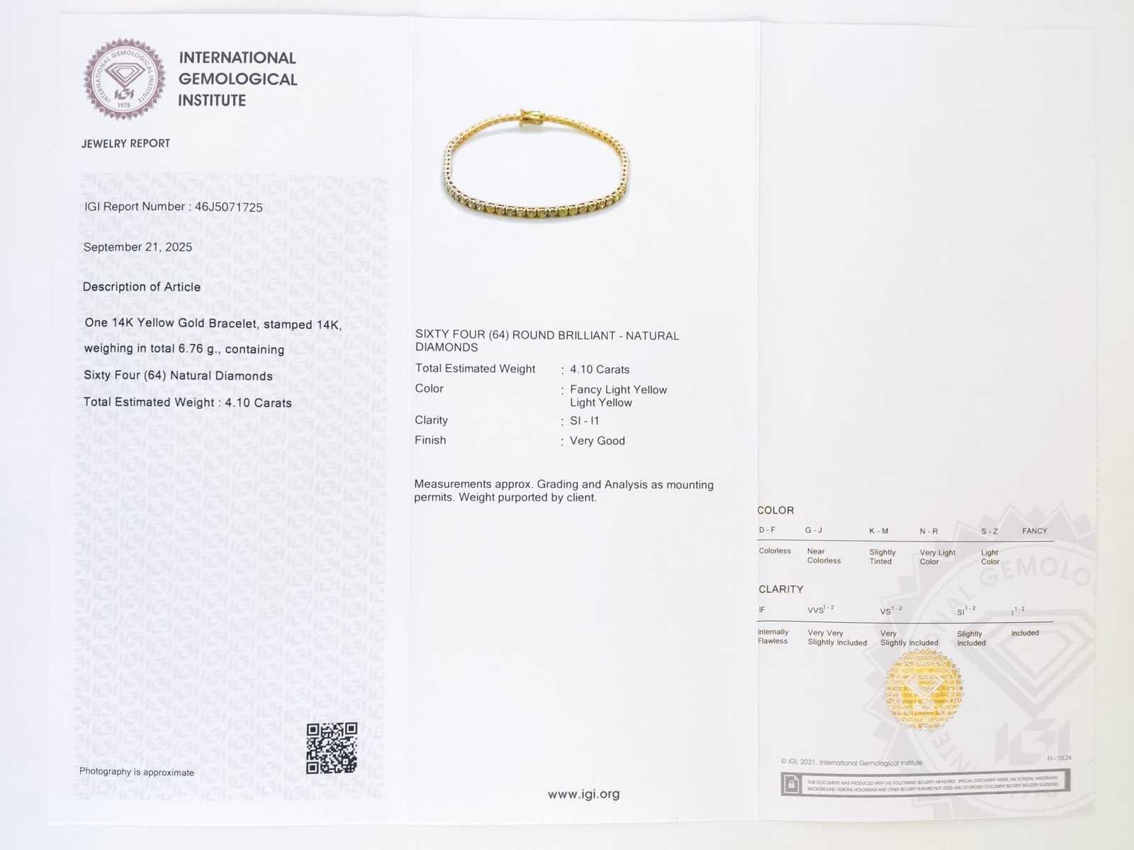 Ongebruikt Slijpvorm: Rond Briljant Carat: 4,10 crt Duidelijkheid: SI-I1 Bezichtiging op afspraak Materiaal: Geel goud Slijpkwaliteit diamant: Briljant Gewicht edelsteen: 4,10 Slijpvorm edelsteen: Briljant Lengte: 18cm Totaal gewicht: 6.76g Lage schatting: 8000€ Hoge schatting: 9400€