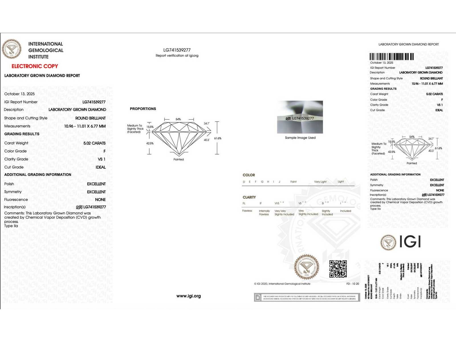 Ongebruikt Vorm: Rond Briljant Gewicht: 5,02 crt Kleur: F Duidelijkheid: VS1 Pools: Uitstekend Symmetrie: Uitstekend 18K wit goud Met IGI-certificaat Bezichtiging op afspraak Product type: 18karaat wit goud Slijpvorm diamant: Rond Briljant Ringmaat: 54 Certificaat: International Gemological institute (IGI) Kleur: F Materiaal: 18 karaat wit goud Lage schatting: 9700€