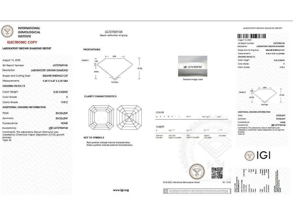 Vorm: Vierkante smaragd Carat: 5,22 Kleur: E Helderheid: VVS2 Ringmaat: 56 (EU) / 16 (IT) / 7 ½ (VS) Bezichtiging op afspraak Materiaal: Witgoud Ringmaat : 56 Certificaat: ja Lage schatting: 11600€