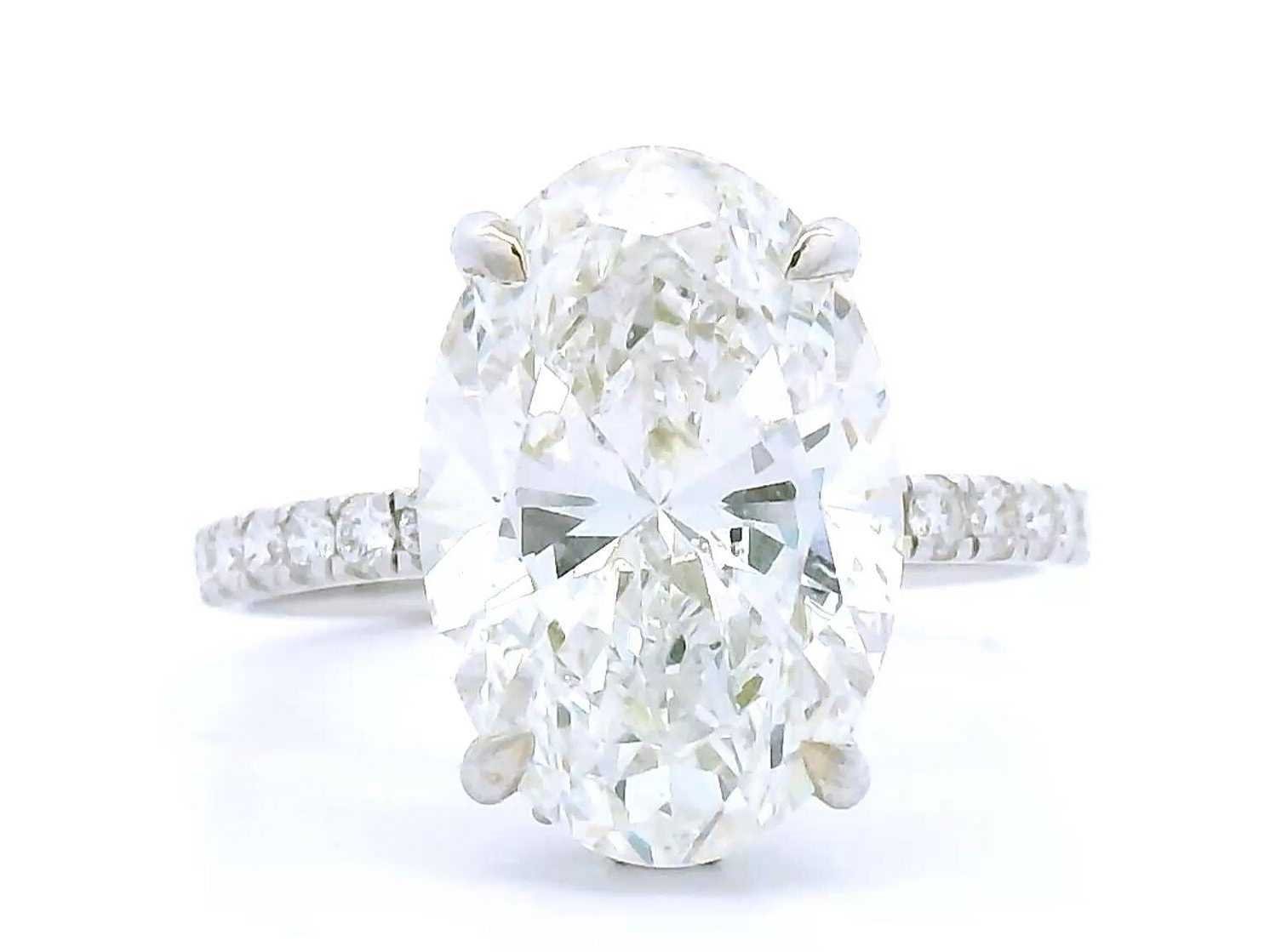 Exclusieve 18K witgouden ring Ringmaat - 54 EU / 14 IT / 6.75 US Rapportnummer IGI: LG701502543 Totaal karaatgewicht - 5,55 Ovale briljant Gewicht van de hoofdsteen: 5,04 CT Kleur: E Helderheid: VVS2 Snede: uitstekend Symmetrie: uitstekend Omringende stenen - 0,51 (30 stuks) Totale ringgewicht: 3,27 gram Bezichtiging op afspraak Materiaal: Witgoud Lage schatting: 9900€