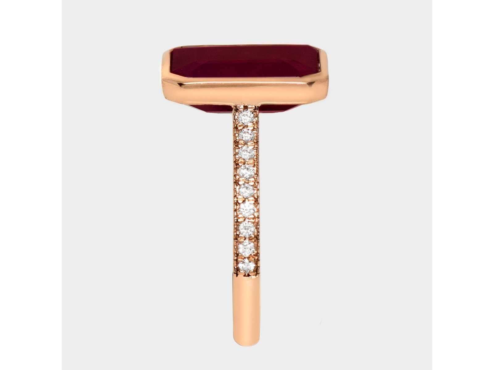 Main Stone Variety: Natural Ruby Shape: Emerald Cut Weight: 6.07 Carat Color: Purplish Red Transparency: Translucent Treatment: Unheated Certification No.: 40J7729925 Side Stone Variety: Diamond Shape: Round Brilliant Weight: 0.16 Carat Color: F-G Clarity: VS-SI Setting: Ring Metal: 14K Rose Gold Weight: 3.59 g Materiaal: Roségoud Ringmaat : 53 Certificaat: Ja