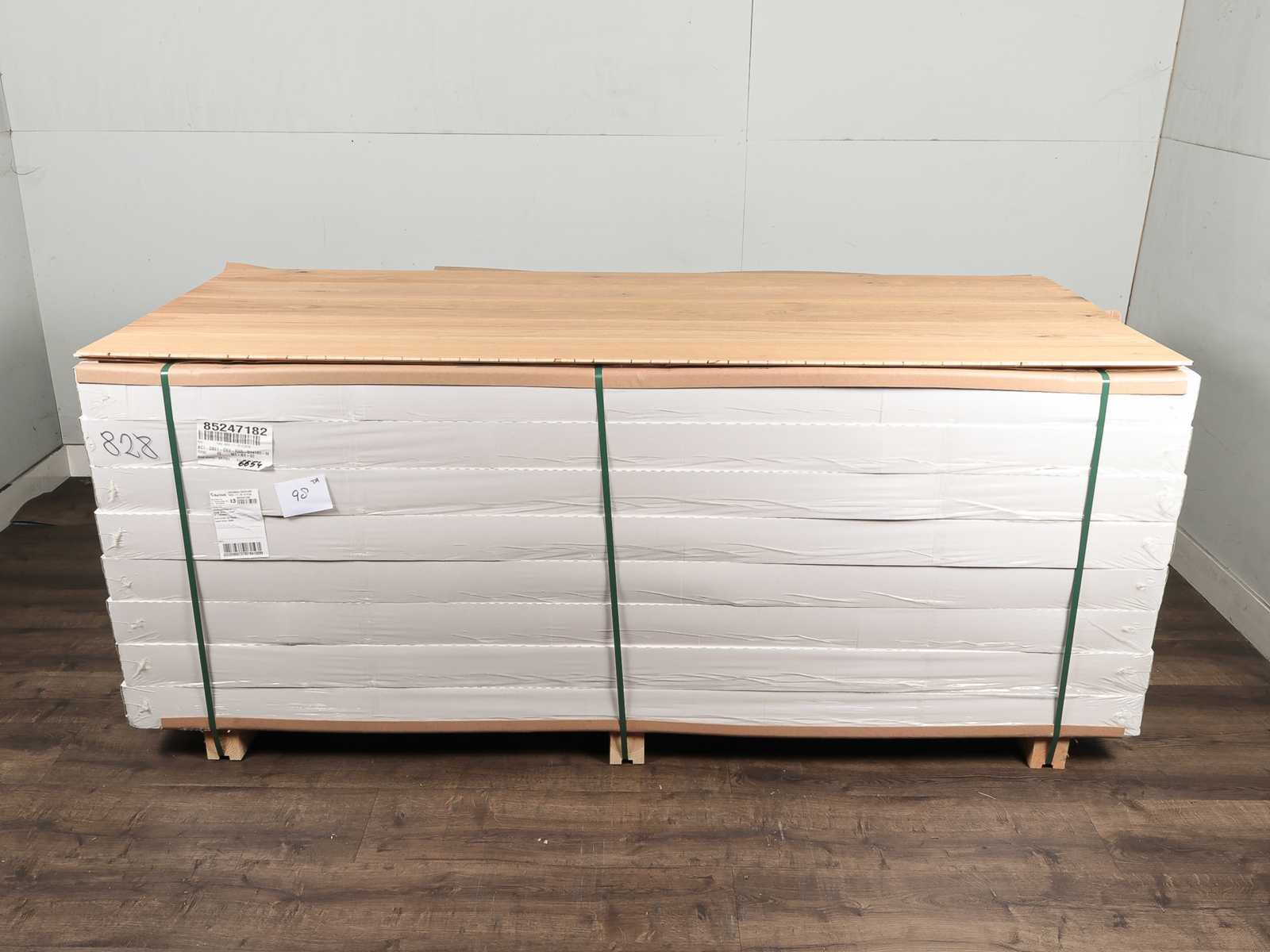 Gemakkelijk te leggen wegens 5G clicksysteem, geschikt voor alle soorten vloer en koelverwarmingen, kwaliteits parketvloer, vloer is van hoogwaardig Europees eiken hout, kant en klaar behandeld, dikte 14 mm, toplaag 3 mm, 40 pakken a 2,77 m2 Merk: Ambiance Product type: Parket Oppervlakte: 110m² Geschikt voor vloerverwarming: Ja V-groef: Ja Afwerking: Geolied, geoxideerd, geborsteld, met v-groef Aantal m² per verpakking: 2.77m² Kleur: Raw effect 828 Gewicht: 925kg Lengte: 2200mm Breedte: 180mm Materiaal: Eiken multiplank