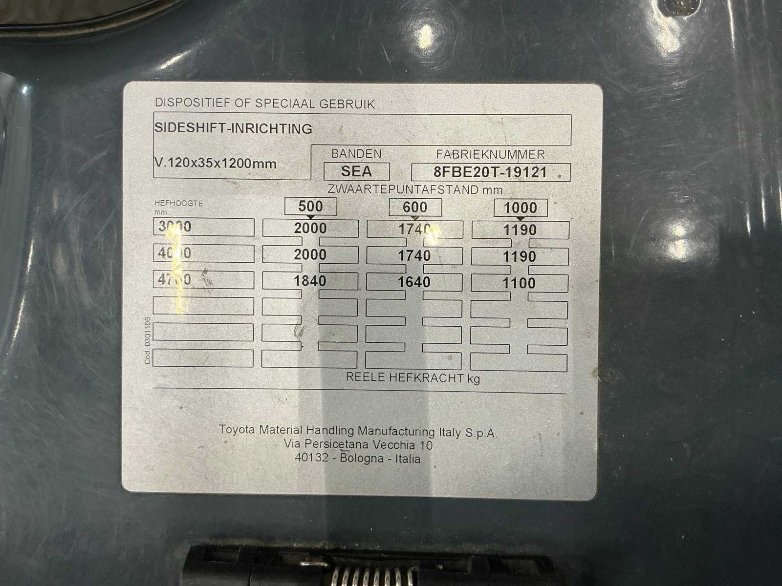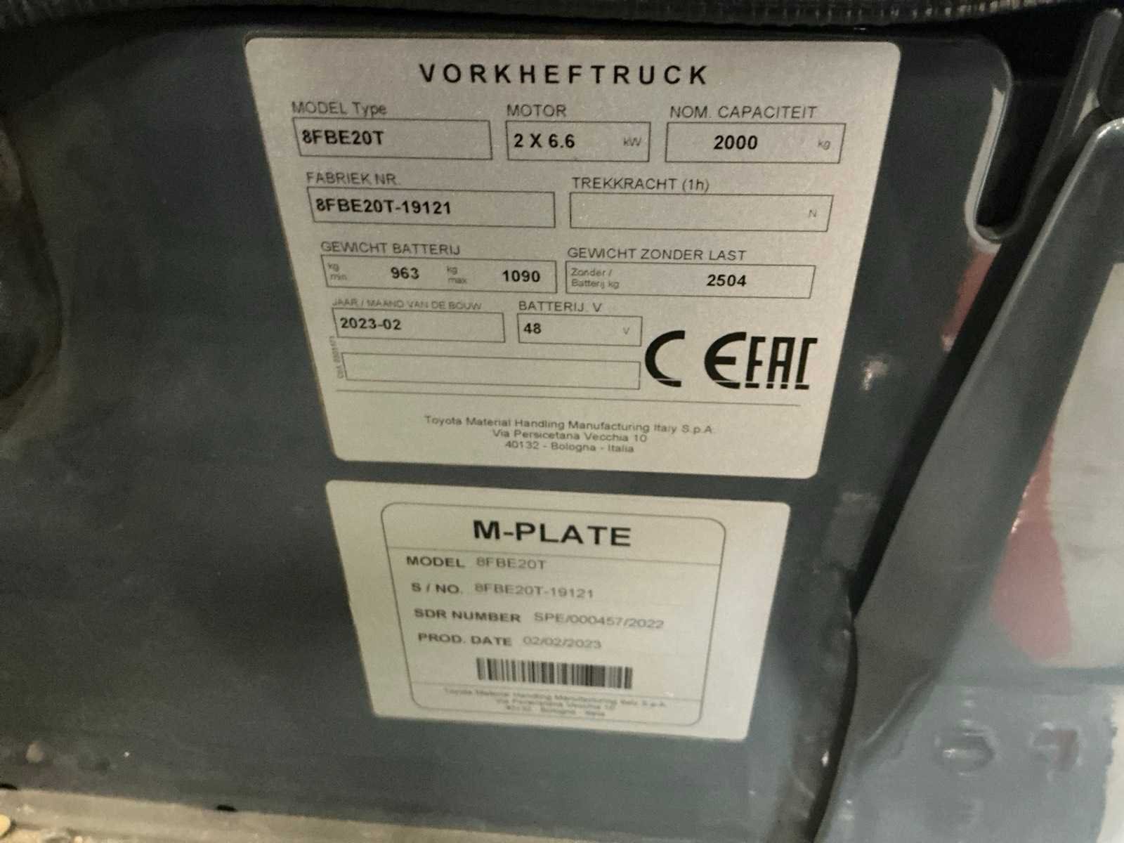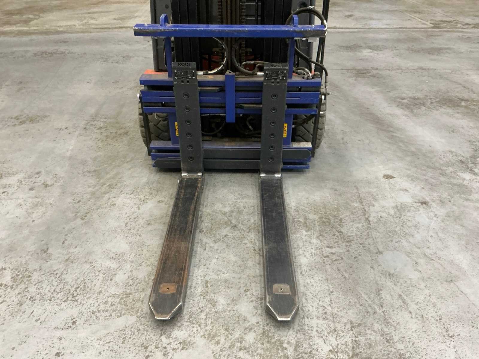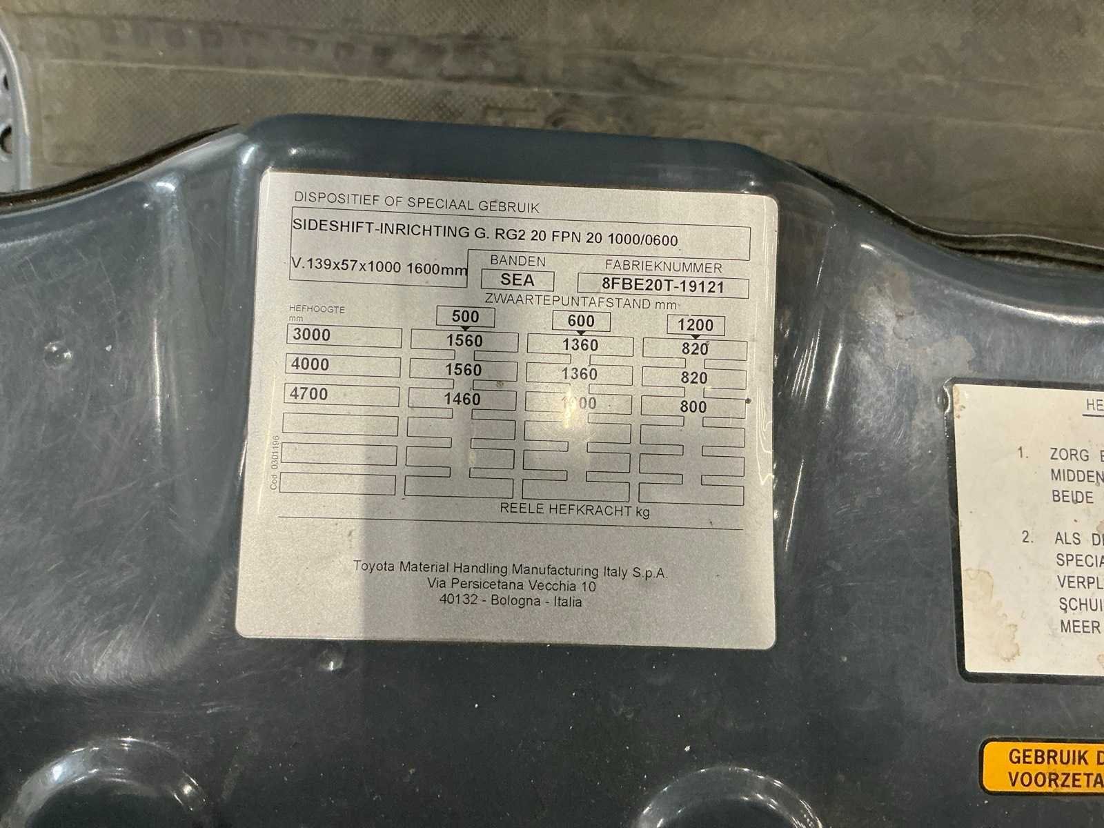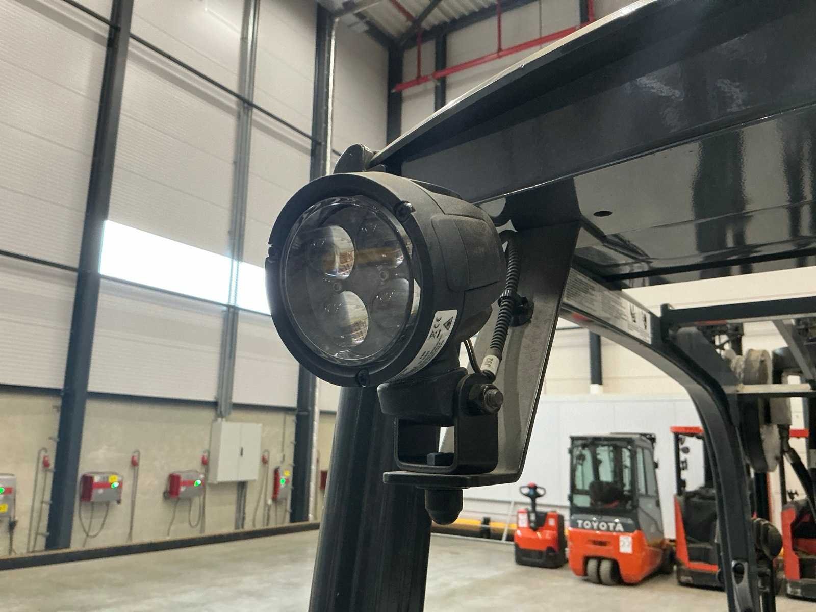 Voorzien van: blue spot, led spots voorzijde, kooi RG2 hydraulische uitschuifbare lepels (tot 1600 mm). Merk: Toyota Bouwjaar: 2023 Serienummer: 19121 Afgelezen urenstand: 4888 Side-shift: true Triple mast: true Eigen gewicht: 2504kg Hefvermogen: 2000kg Lepellengte: 1100mm Max. hefhoogte: 4700mm Vol rubber banden: true Totale afmeting L: 3100mm Totale afmeting Breedte: 1150mm Totale afmeting Hoogte: 2130mm