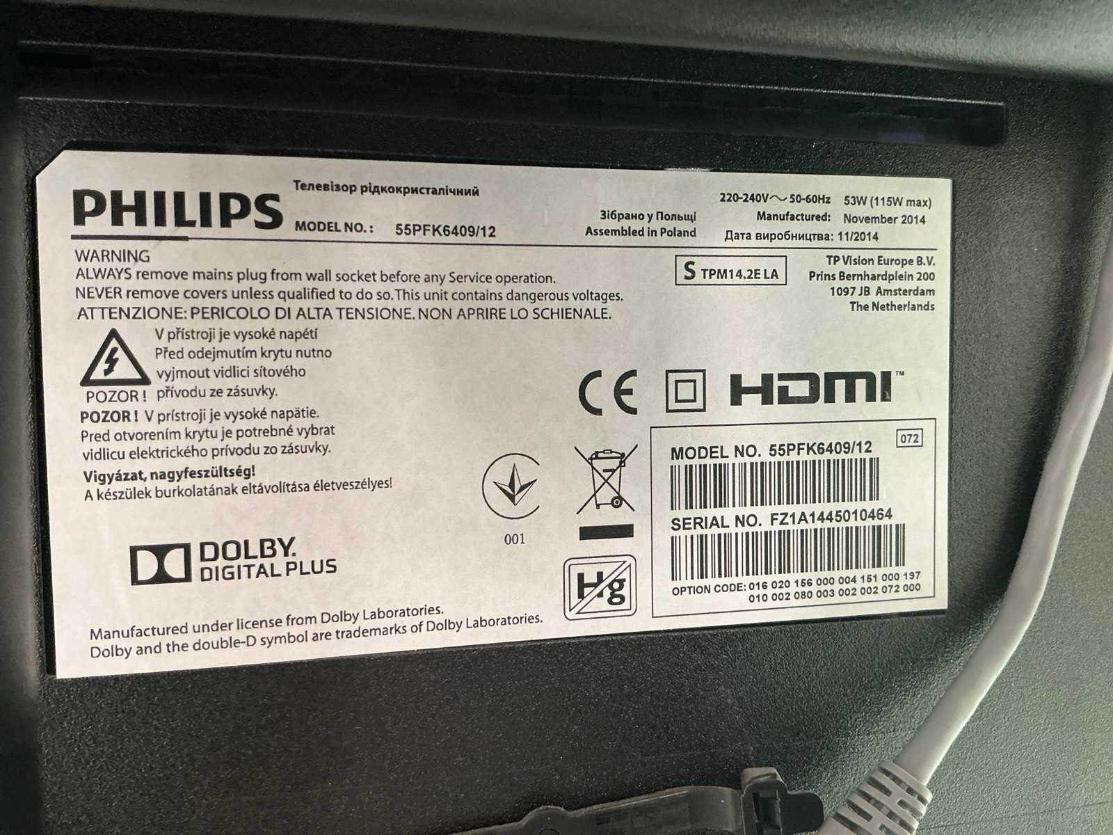 Merk: Philips Model: 55PFK6409/12 Beelddiagonaal: 55'' Breedte: 135cm Hoogte: 195cm