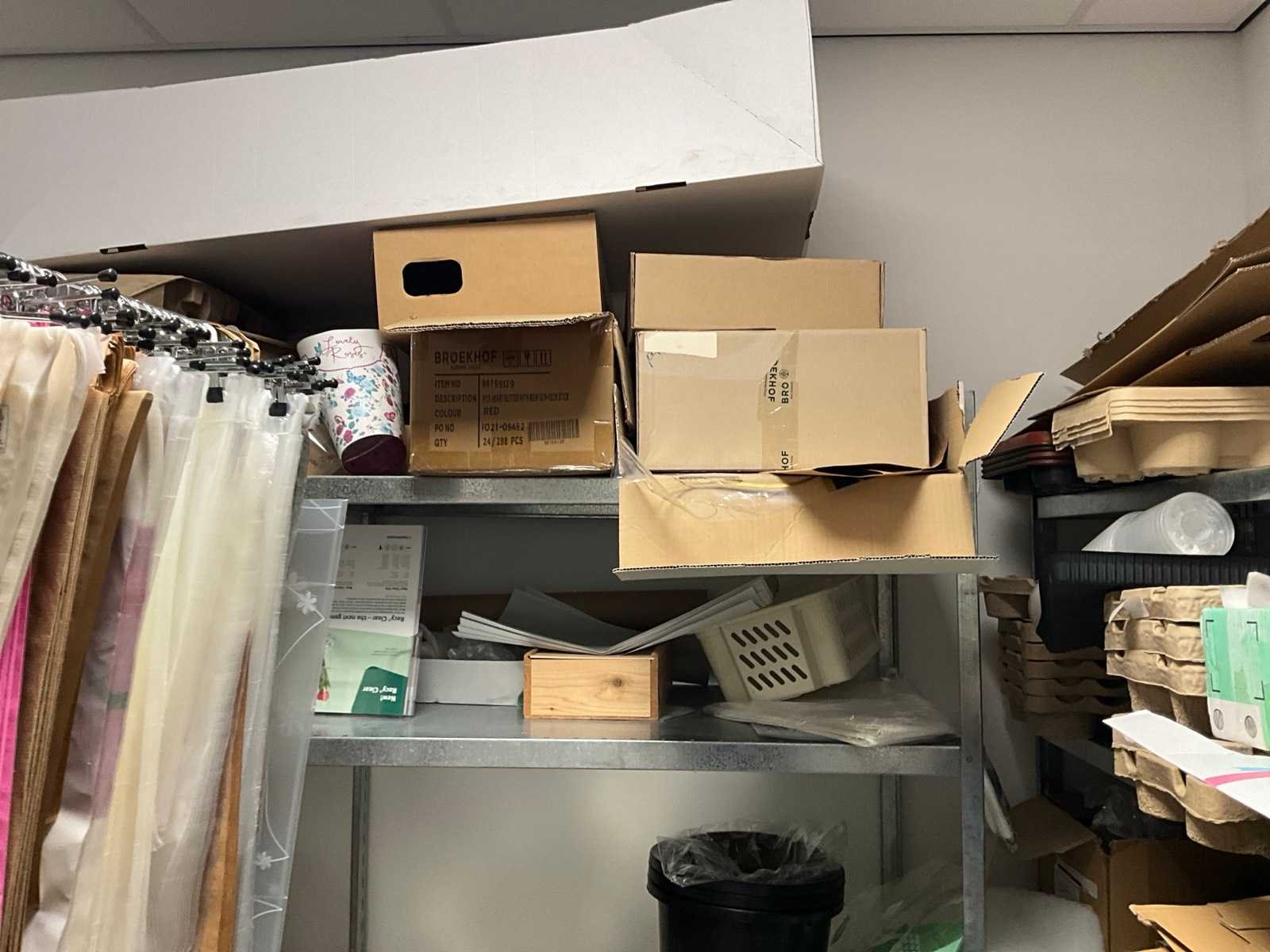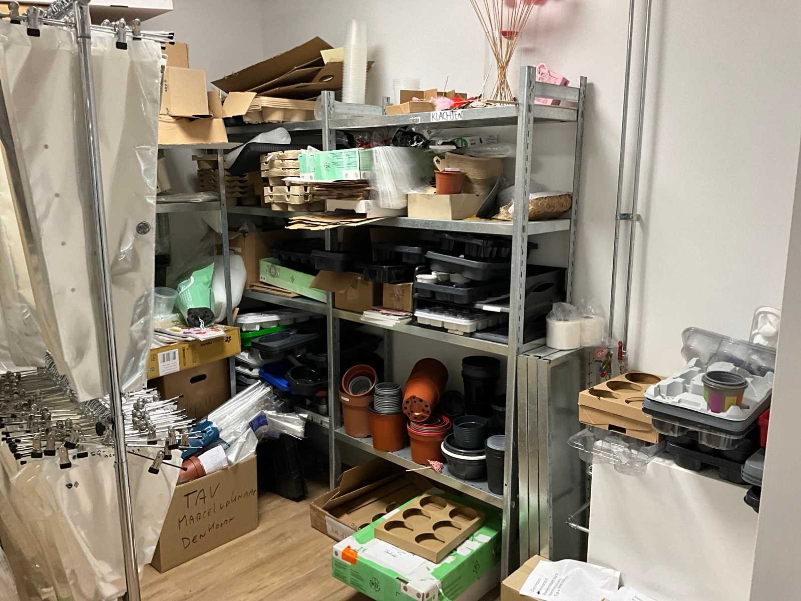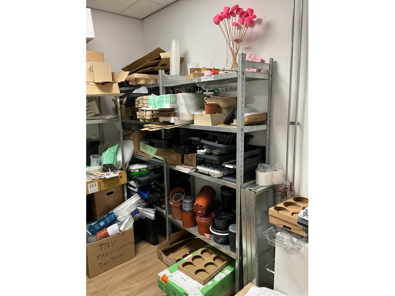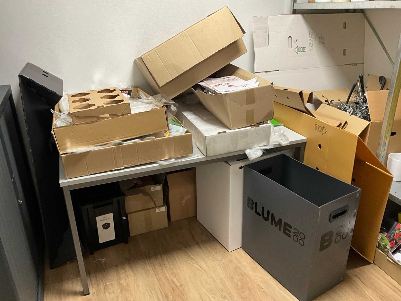 HP printer niet inbegrepen Bestaande uit: Inhoud van berging 1e: 6 secties legbordstelling 200x100x40cm 2e: Diverse verpakkingen/monsters 3e: Tafel 140x80cm 4e: Roldeurkast, H105xB120xD43cm 5e: Etc