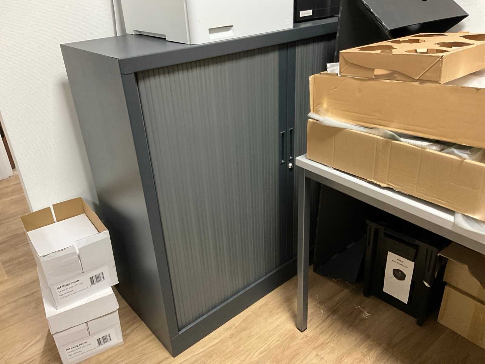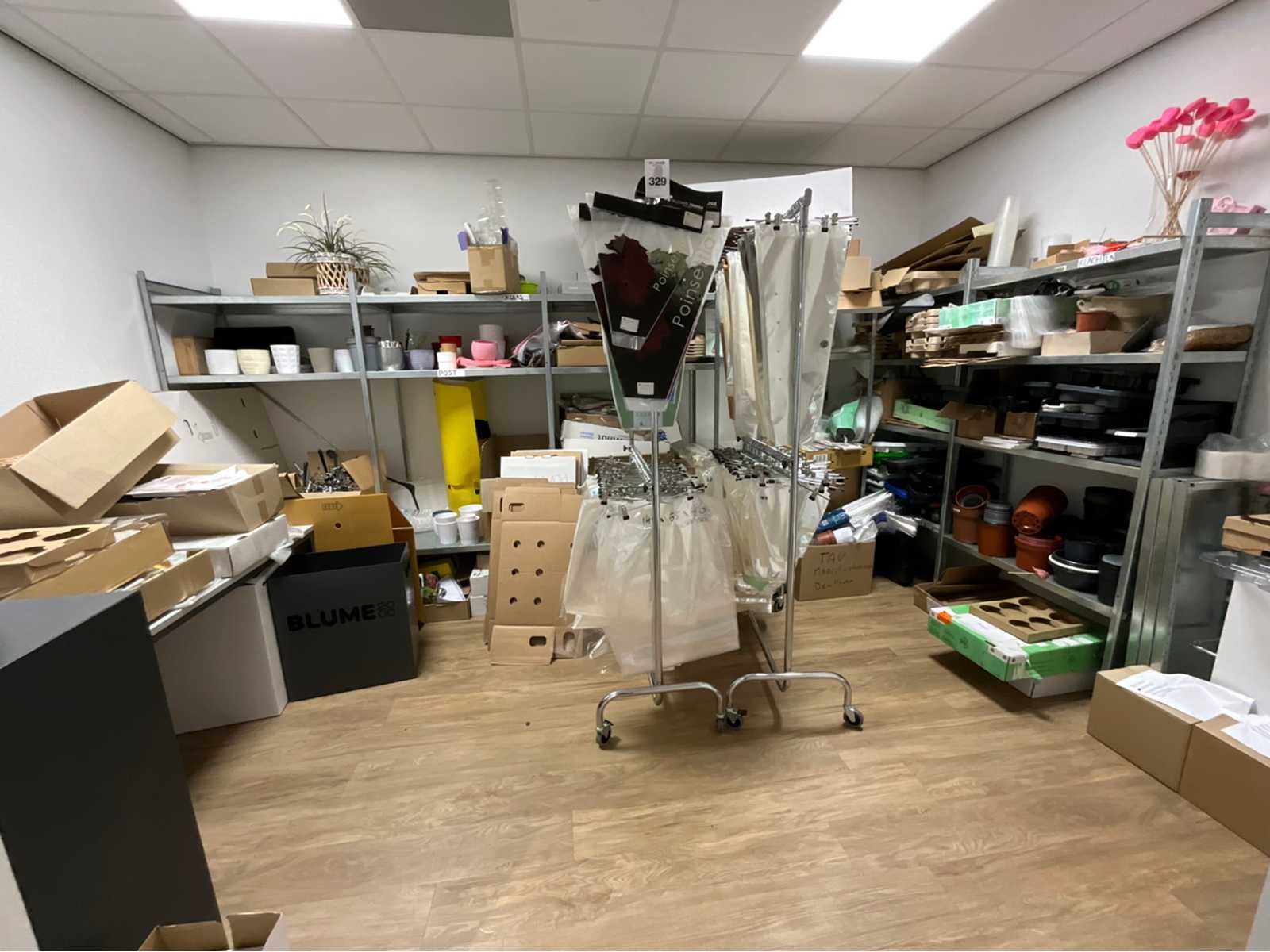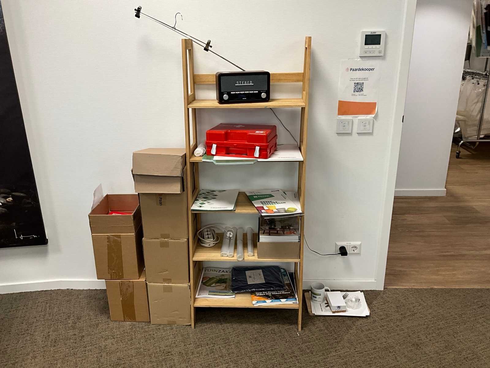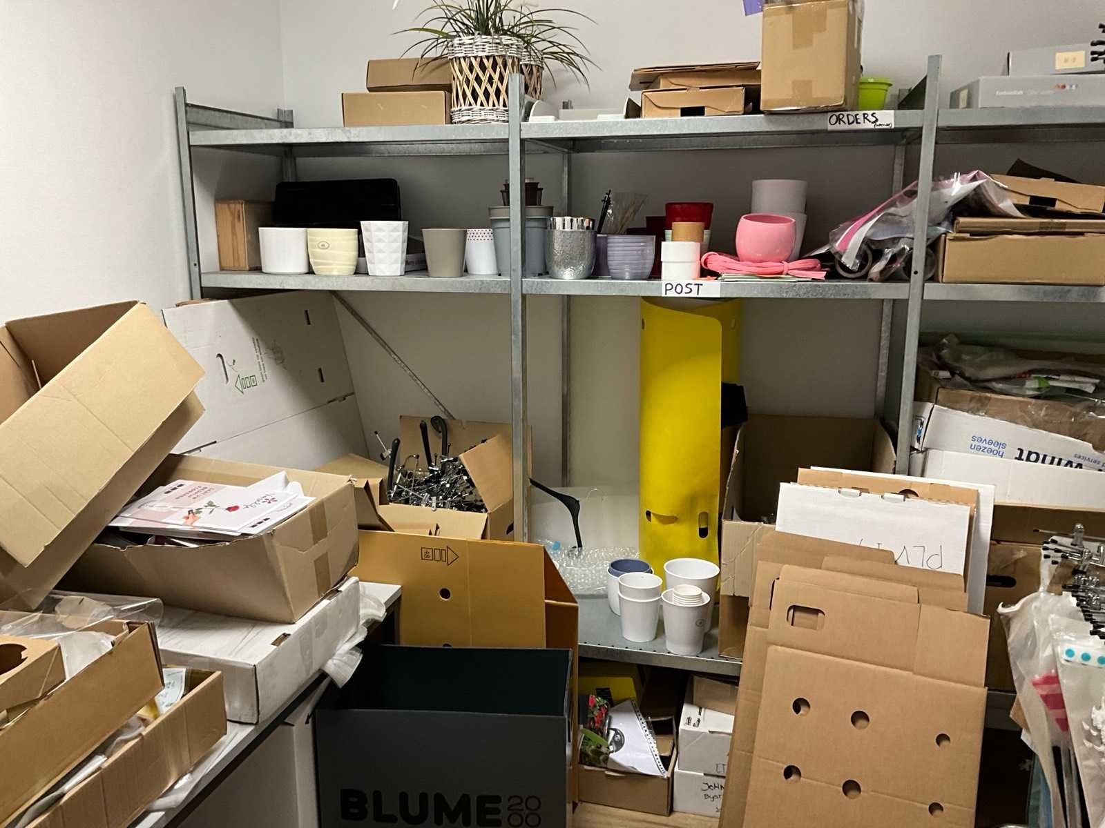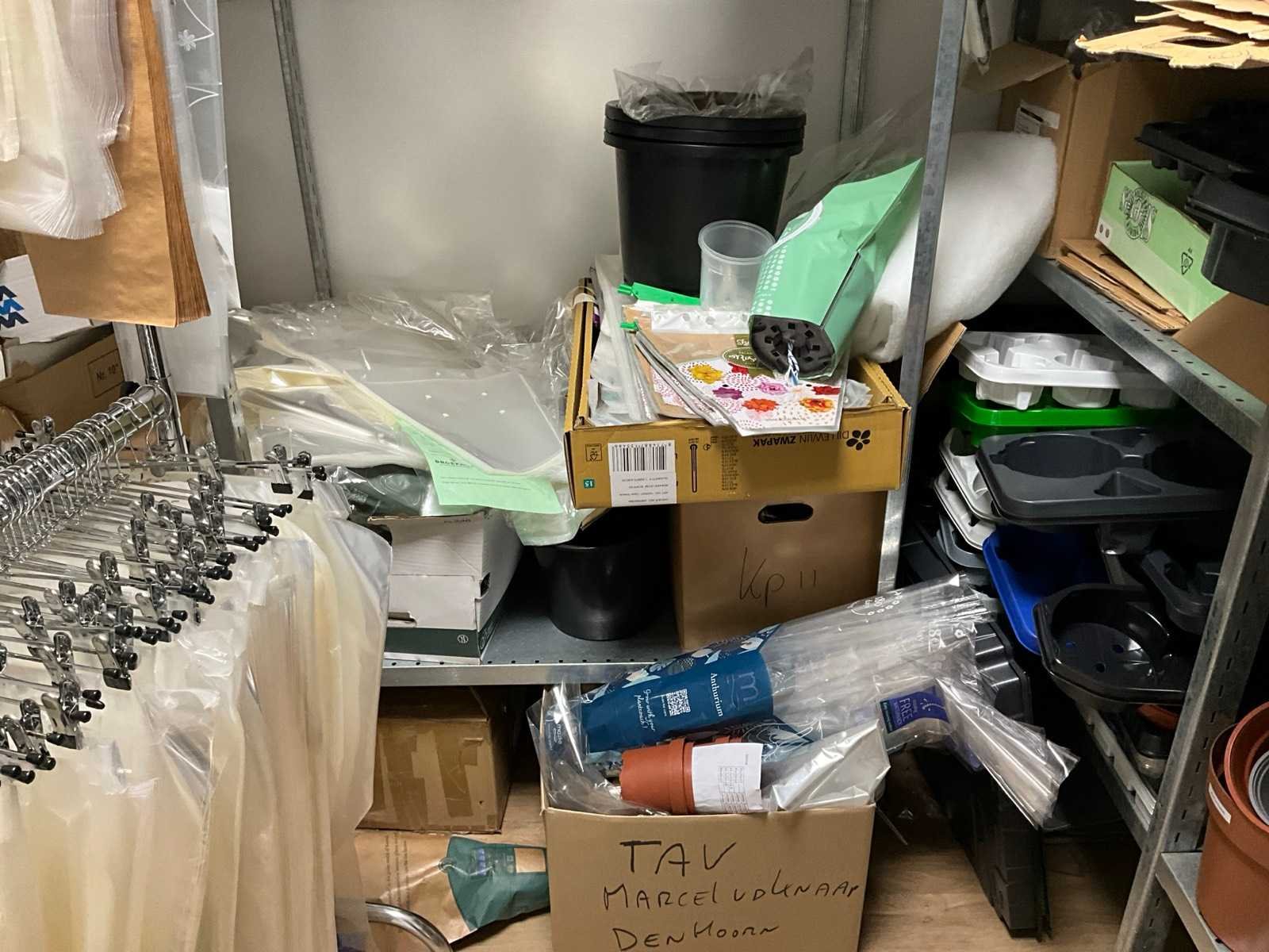 HP printer niet inbegrepen Bestaande uit: Inhoud van berging 1e: 6 secties legbordstelling 200x100x40cm 2e: Diverse verpakkingen/monsters 3e: Tafel 140x80cm 4e: Roldeurkast, H105xB120xD43cm 5e: Etc