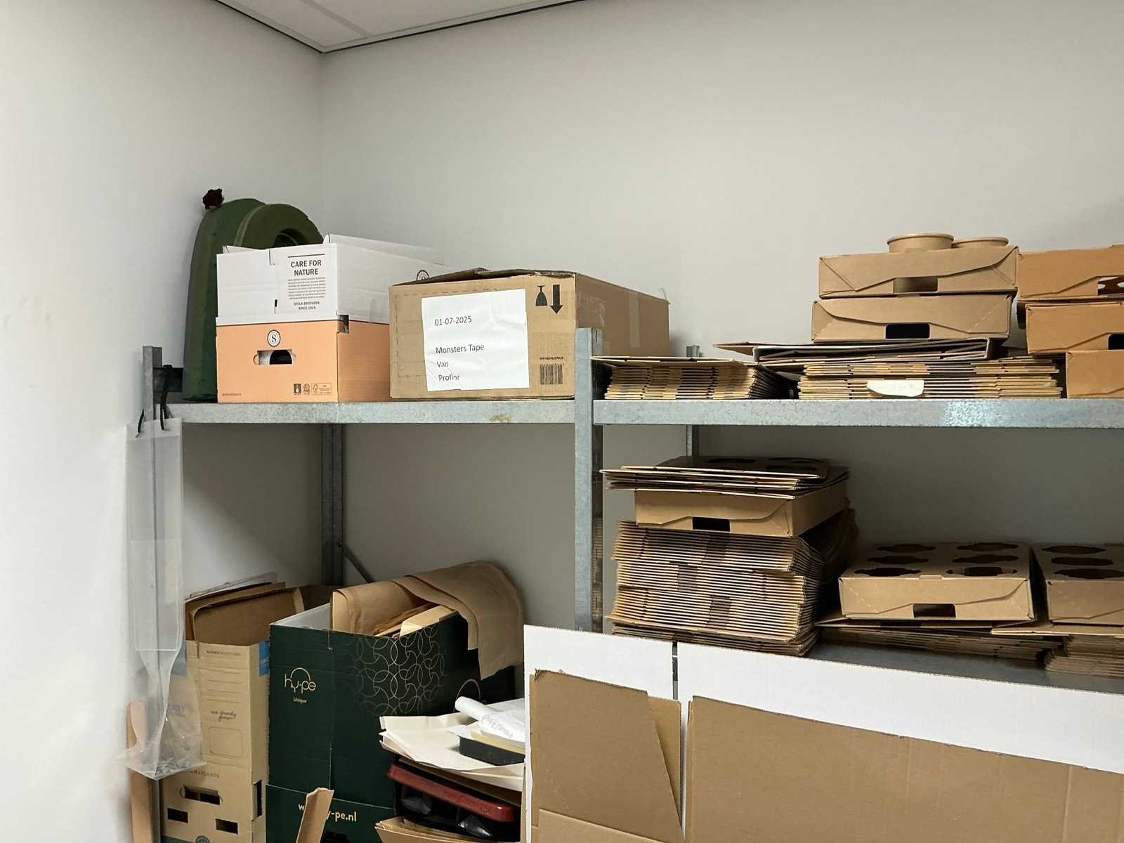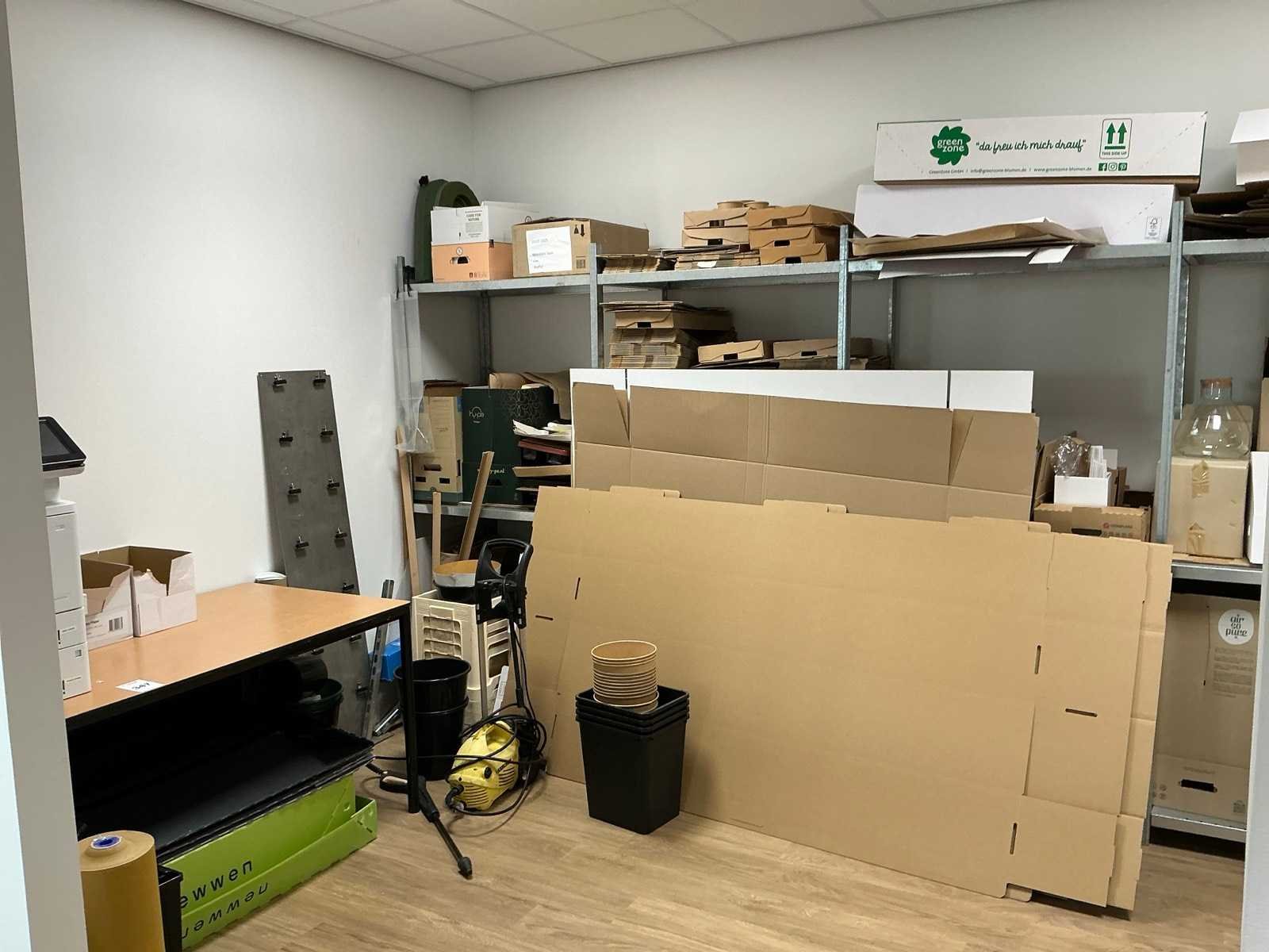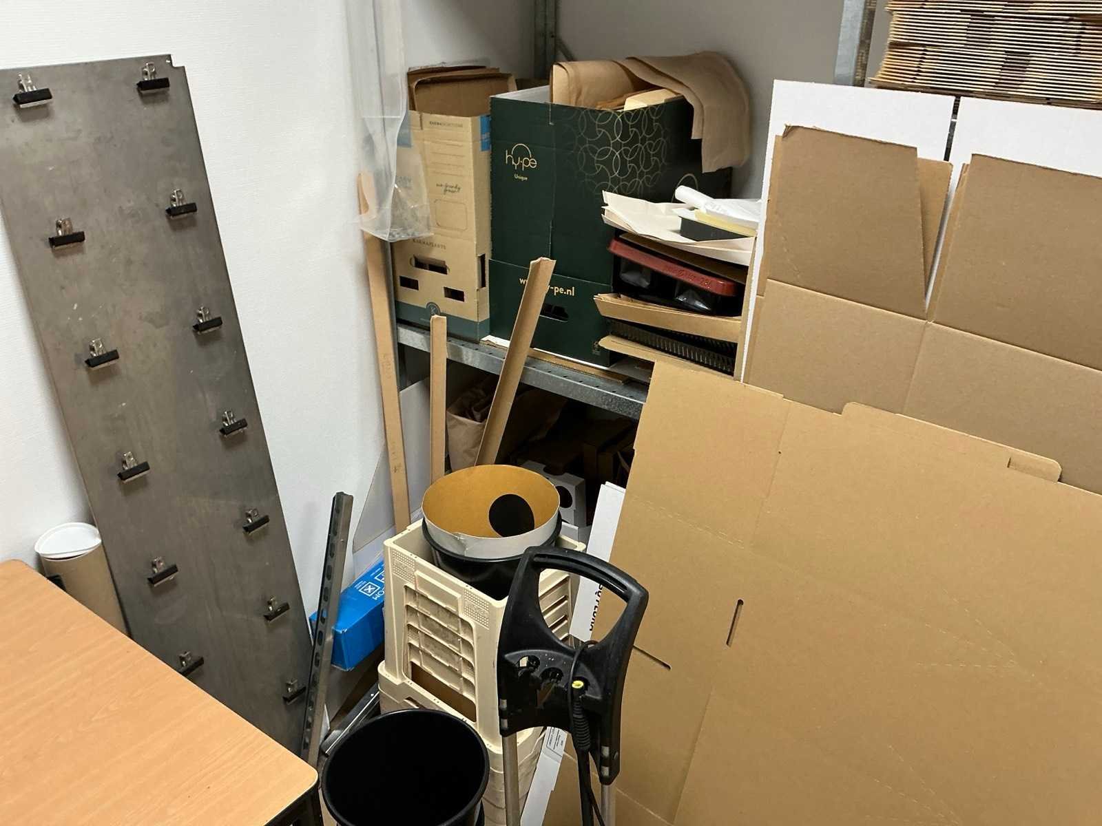 HP printer niet inbegrepen Bestaande uit: Inhoud van berging 1e: 6 lengtes magazijnstelling (metaal) 2e: Diverse verpakkingen/monsters 3e: Tafel 160x80cm 4e: Hogedruk reiniger