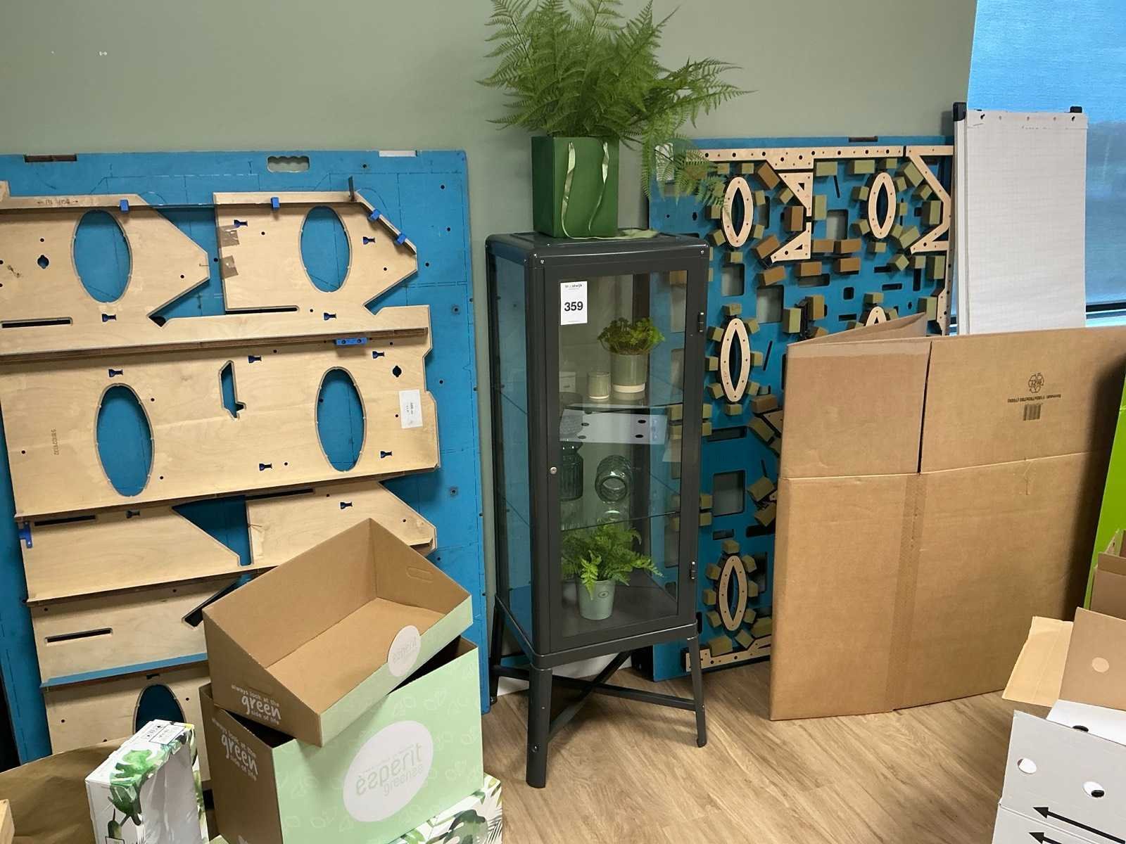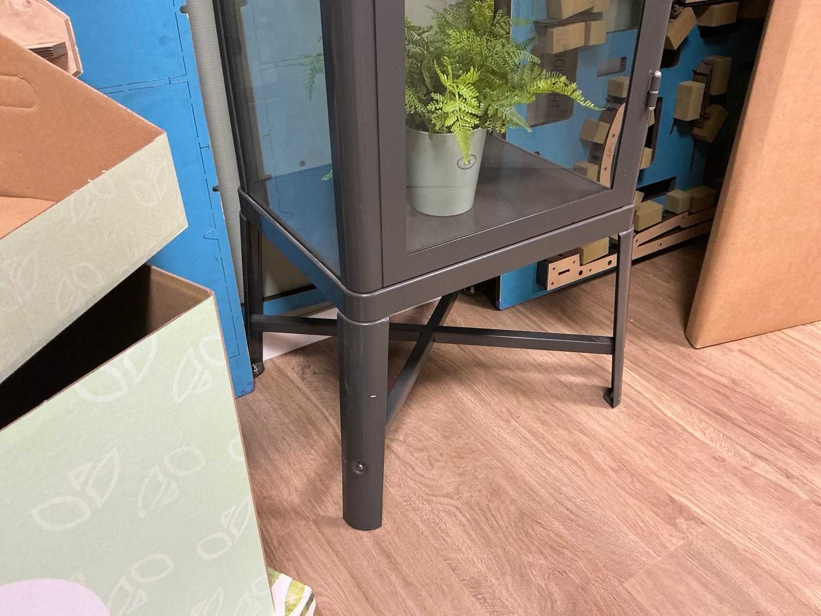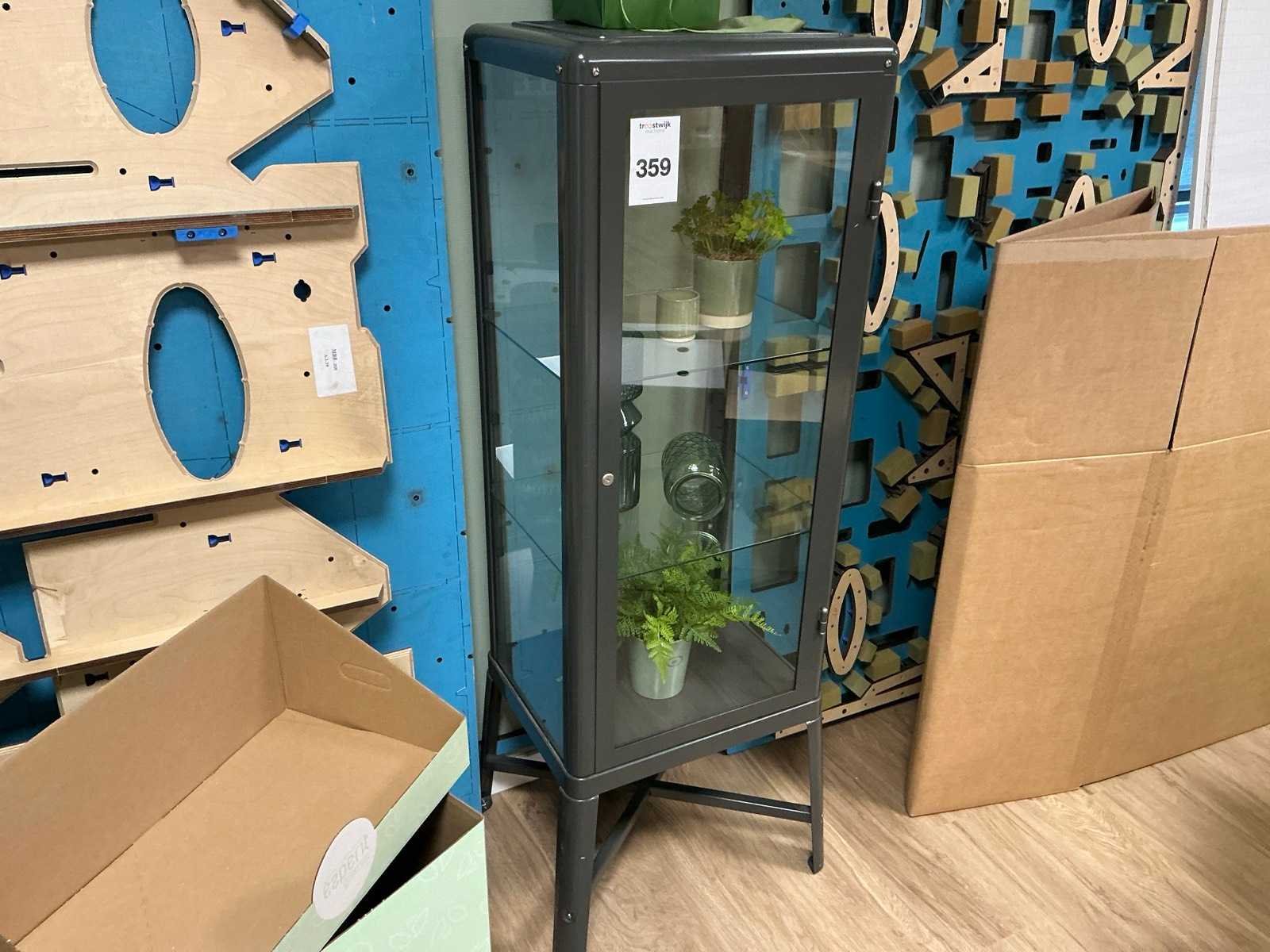 2 etages, sleutel afgebroken. Kleur: Grijs Lengte: 50cm Breedte: 40cm Hoogte: 150cm Materiaal: Metaal / glas