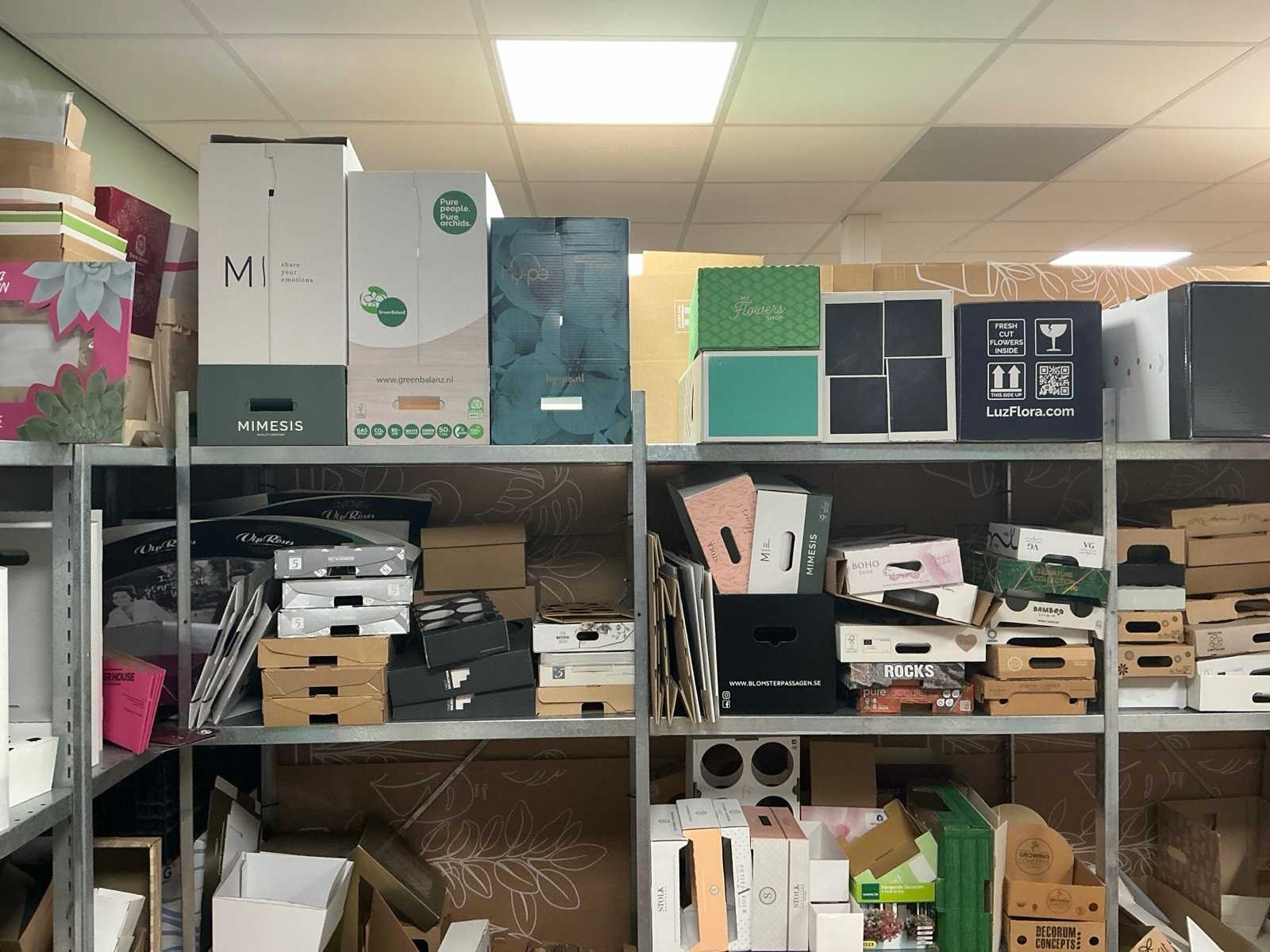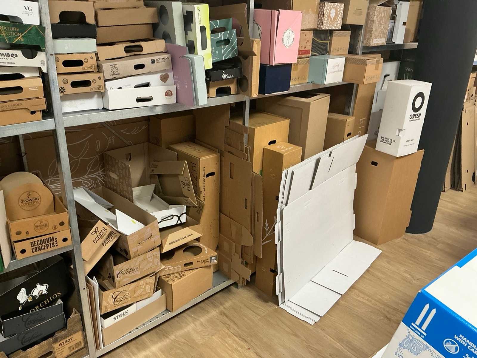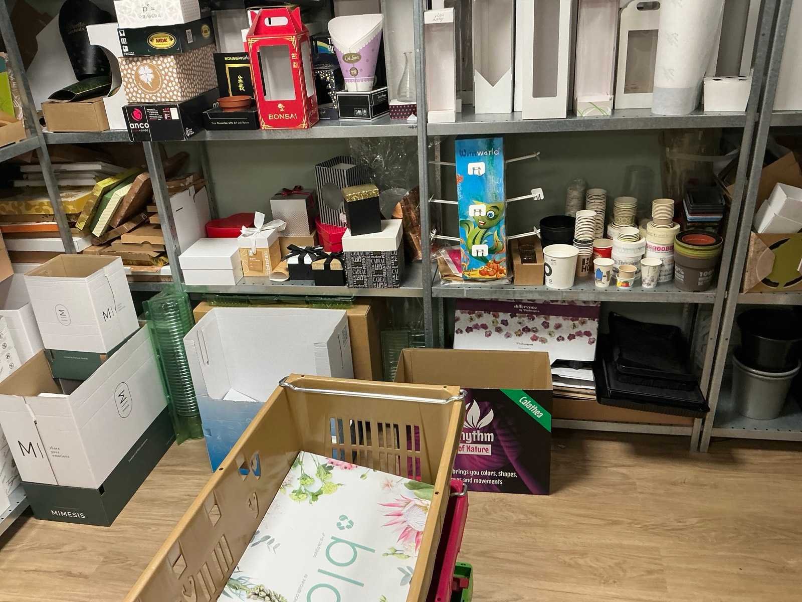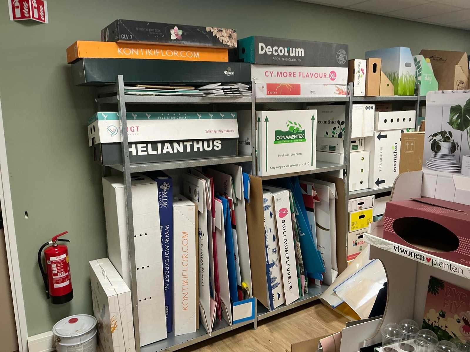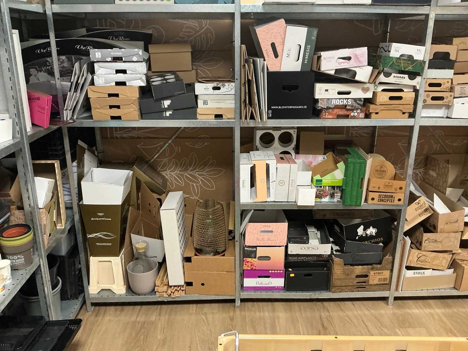 Diverse verpakkingen, bloemendozen, diversen. Alles in de stellingen, op en voor de stellingen.