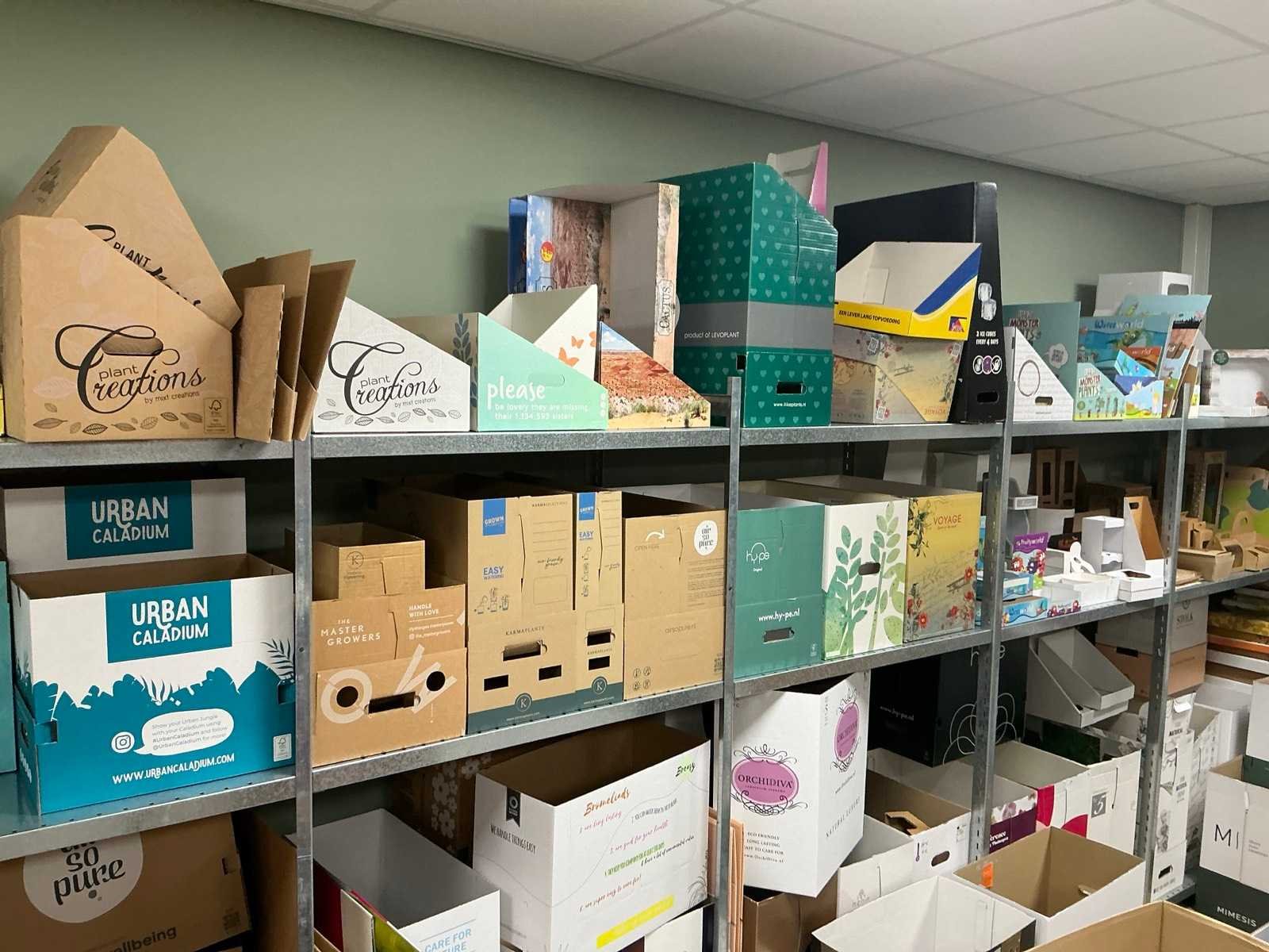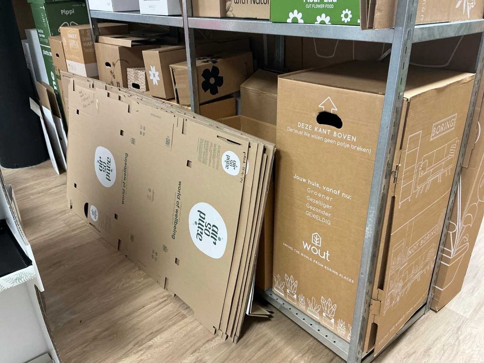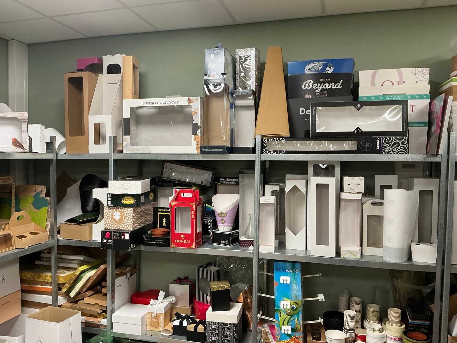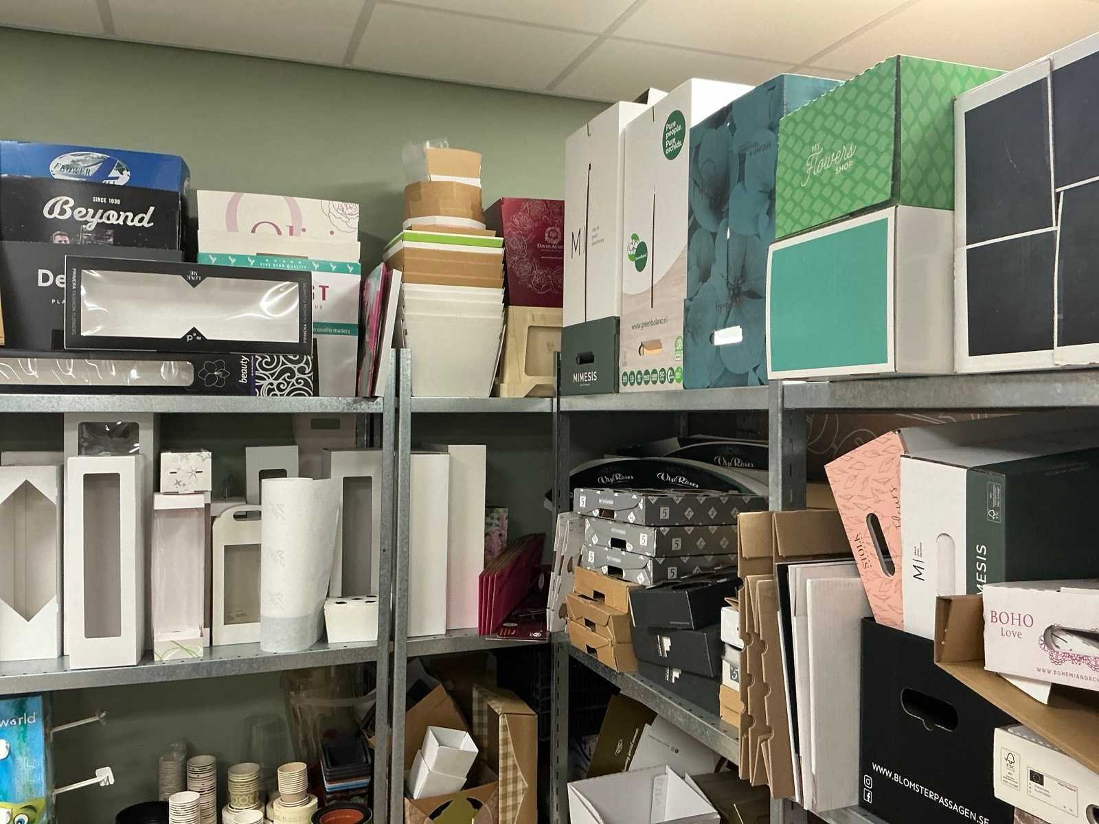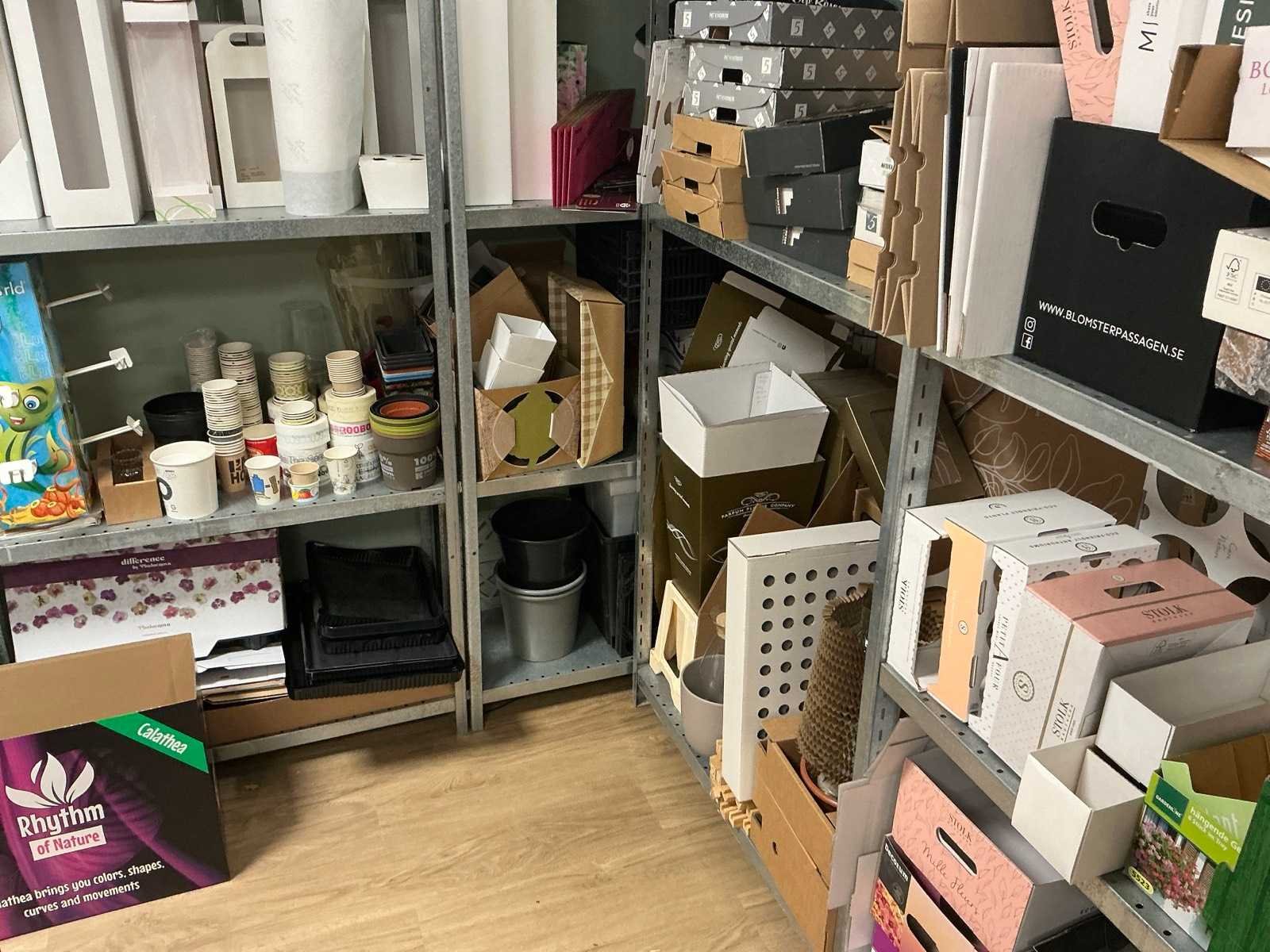 Diverse verpakkingen, bloemendozen, diversen. Alles in de stellingen, op en voor de stellingen.