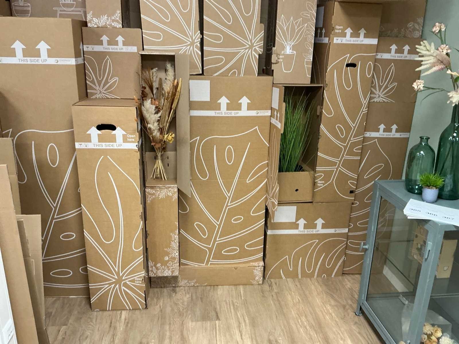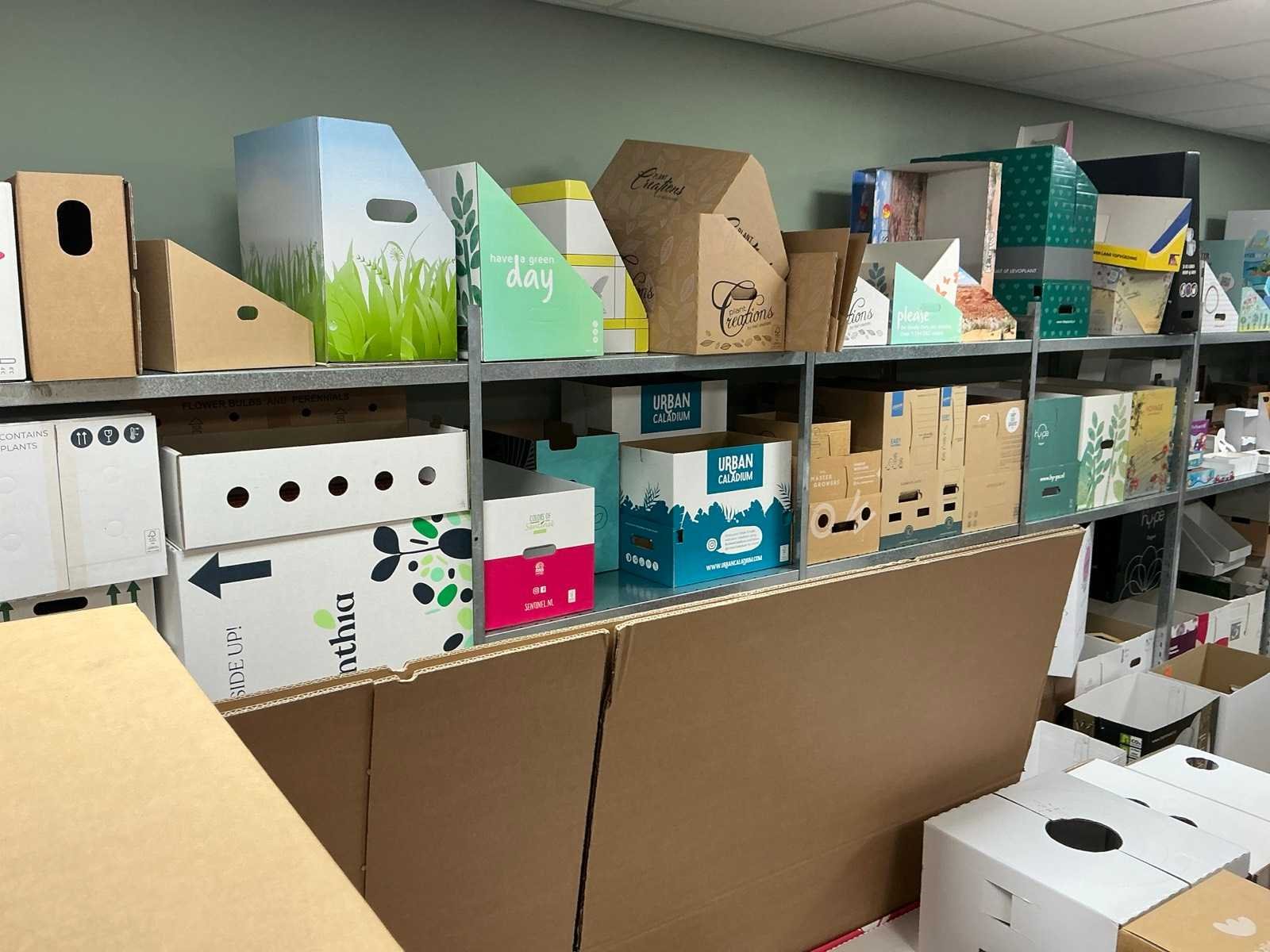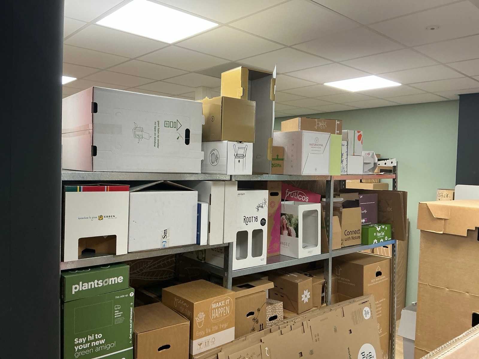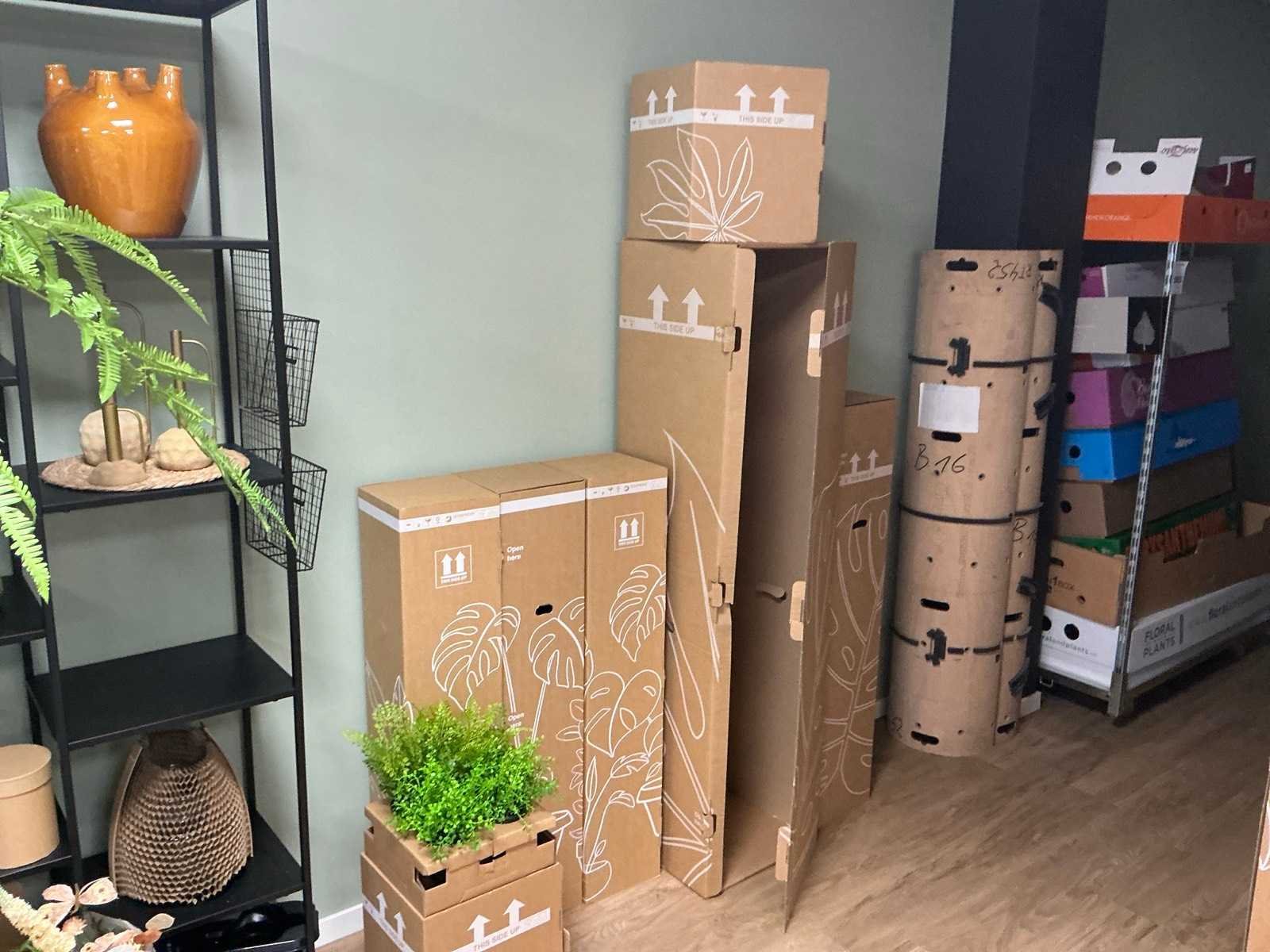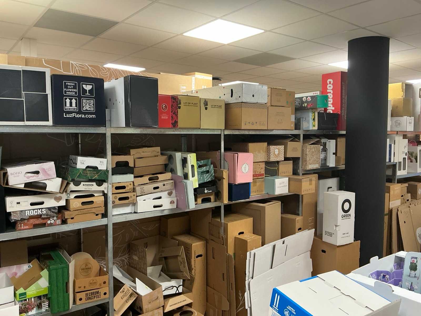 Diverse verpakkingen, bloemendozen, diversen. Alles in de stellingen, op en voor de stellingen.