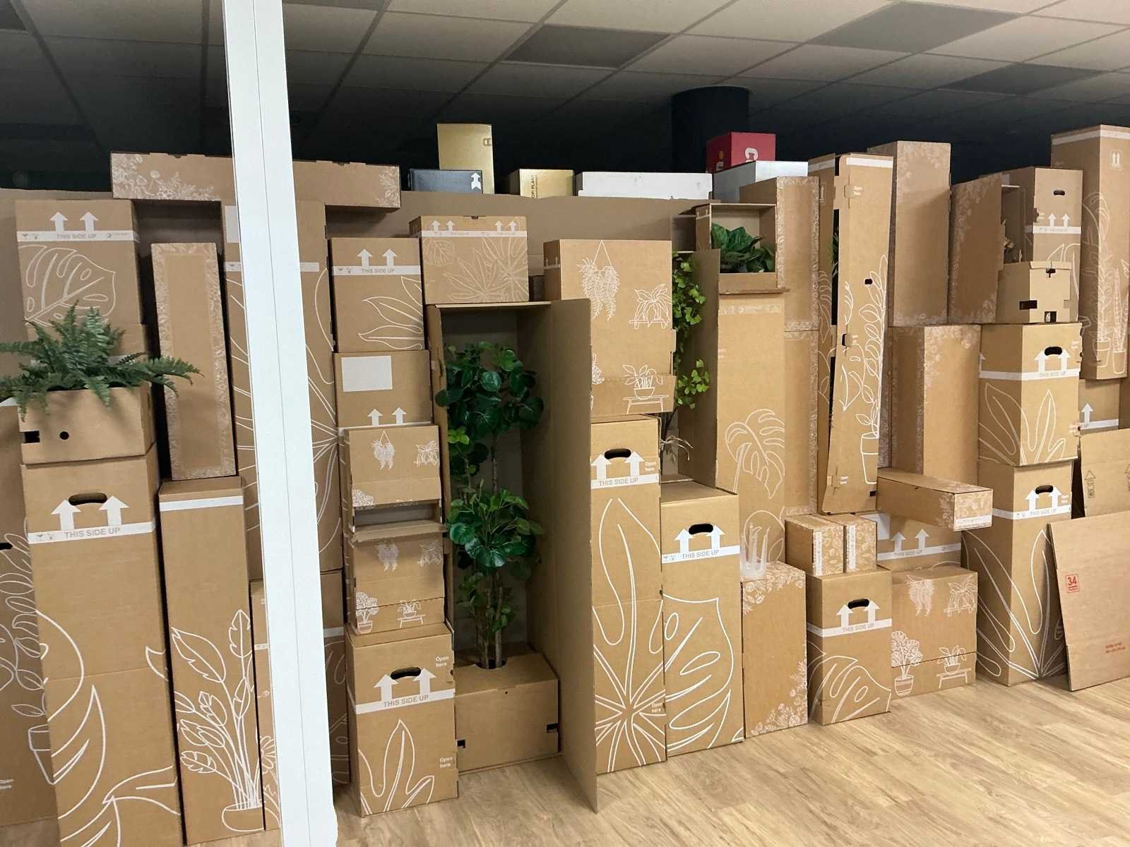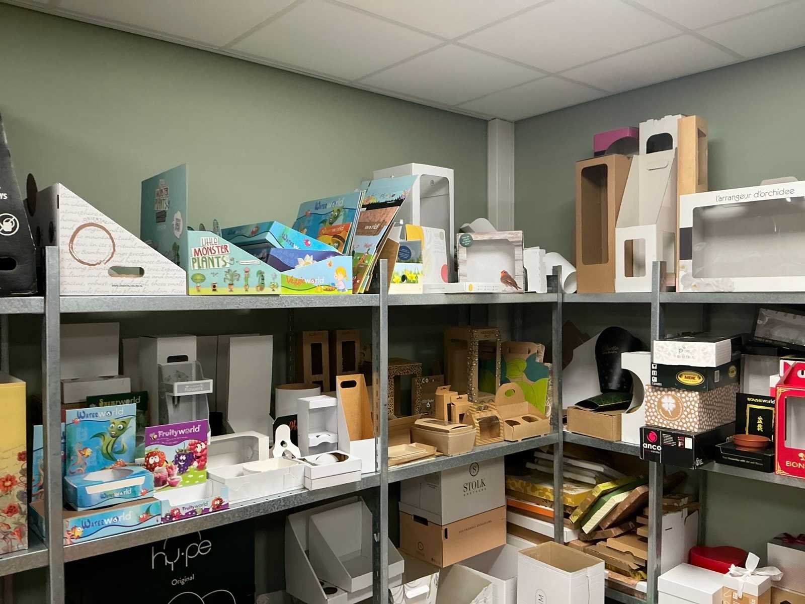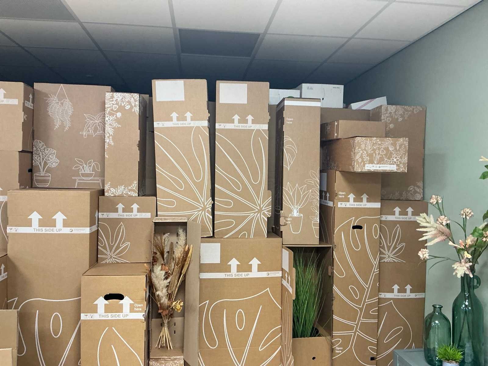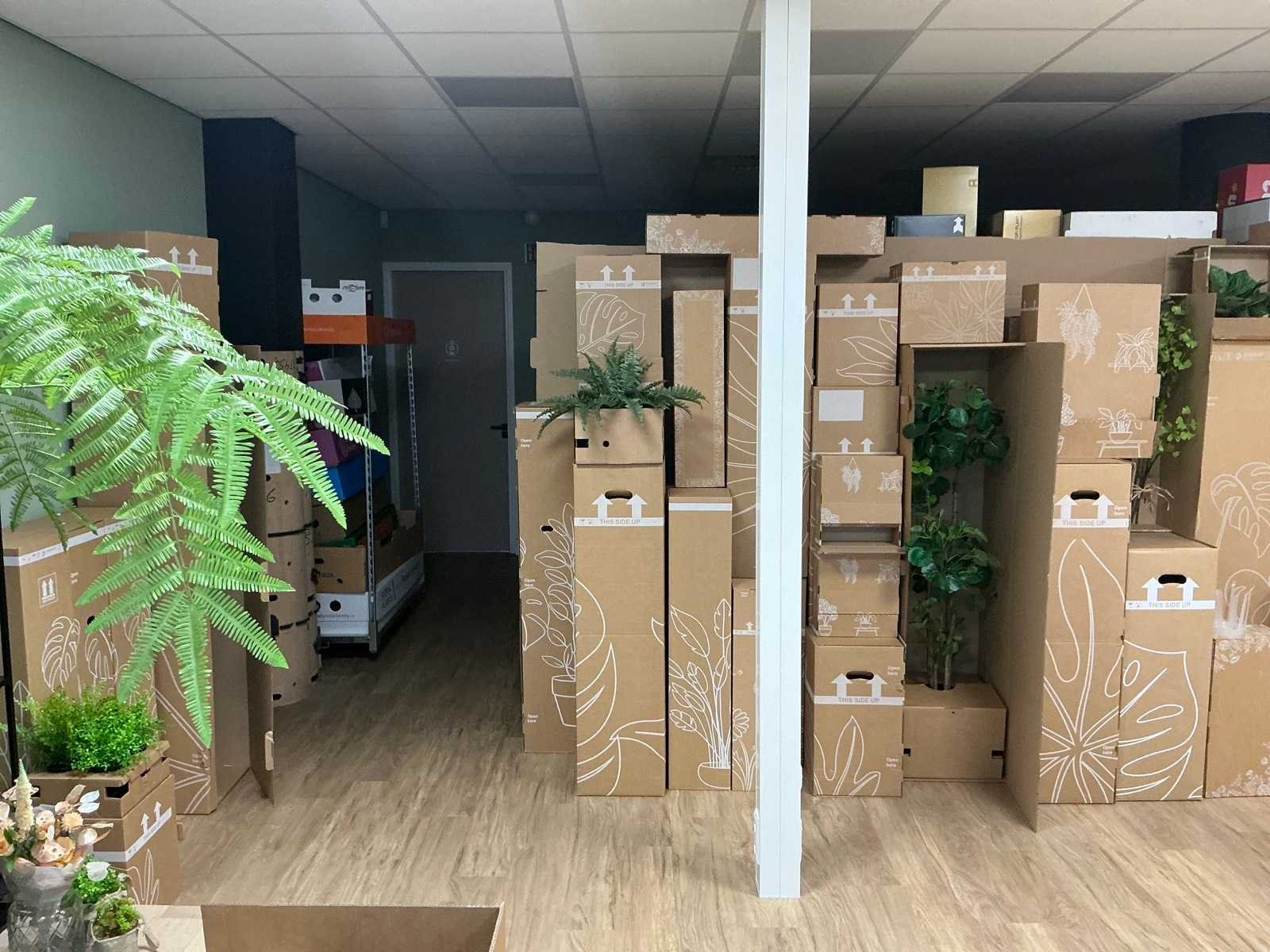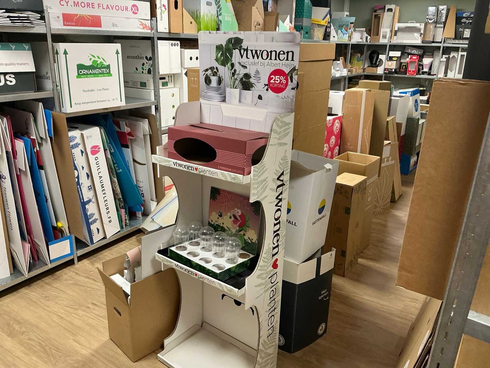 Diverse verpakkingen, bloemendozen, diversen. Alles in de stellingen, op en voor de stellingen.