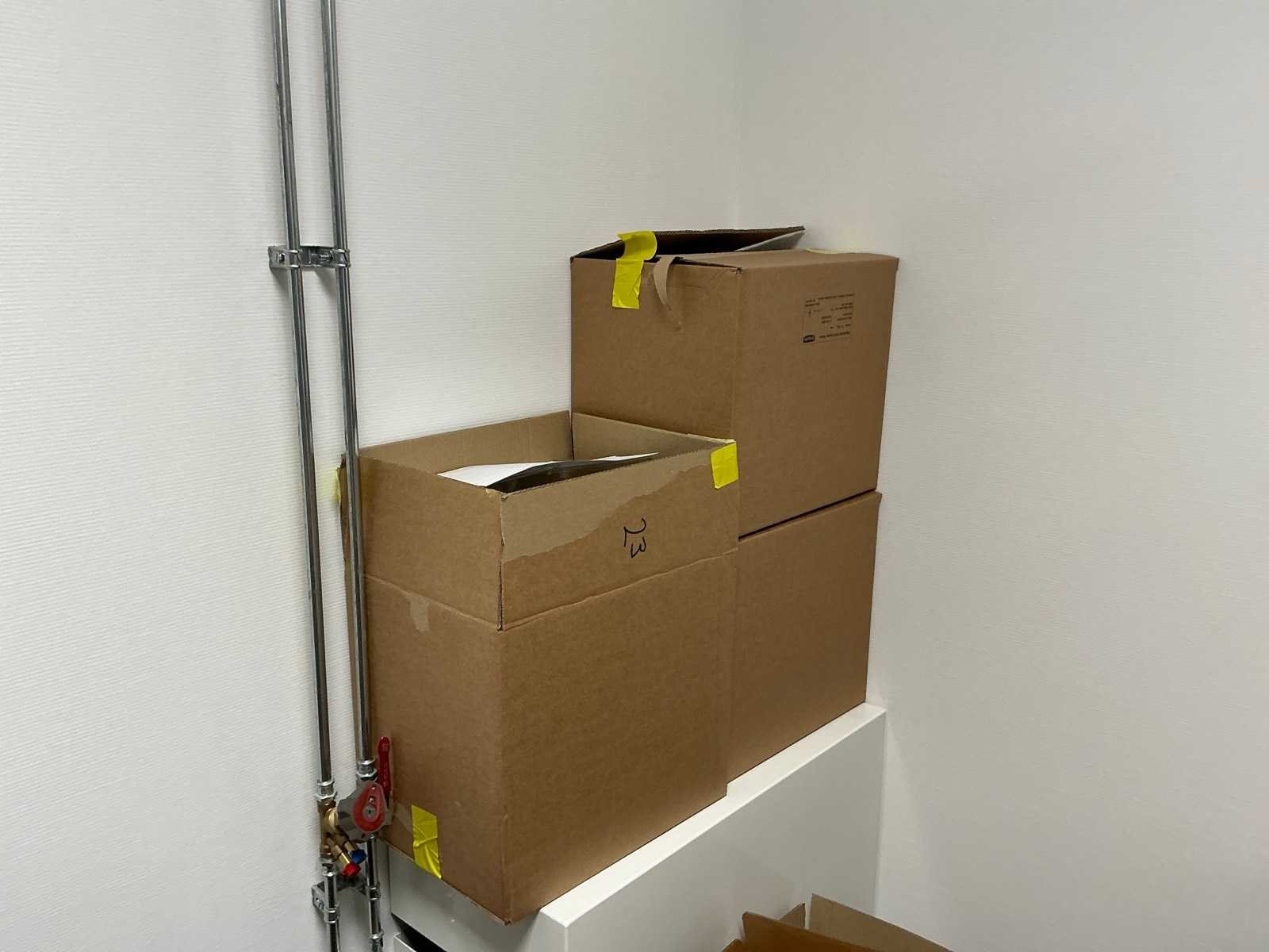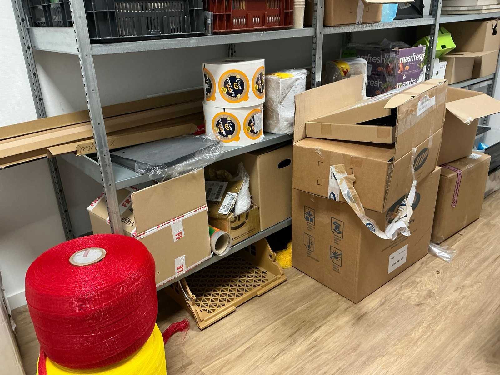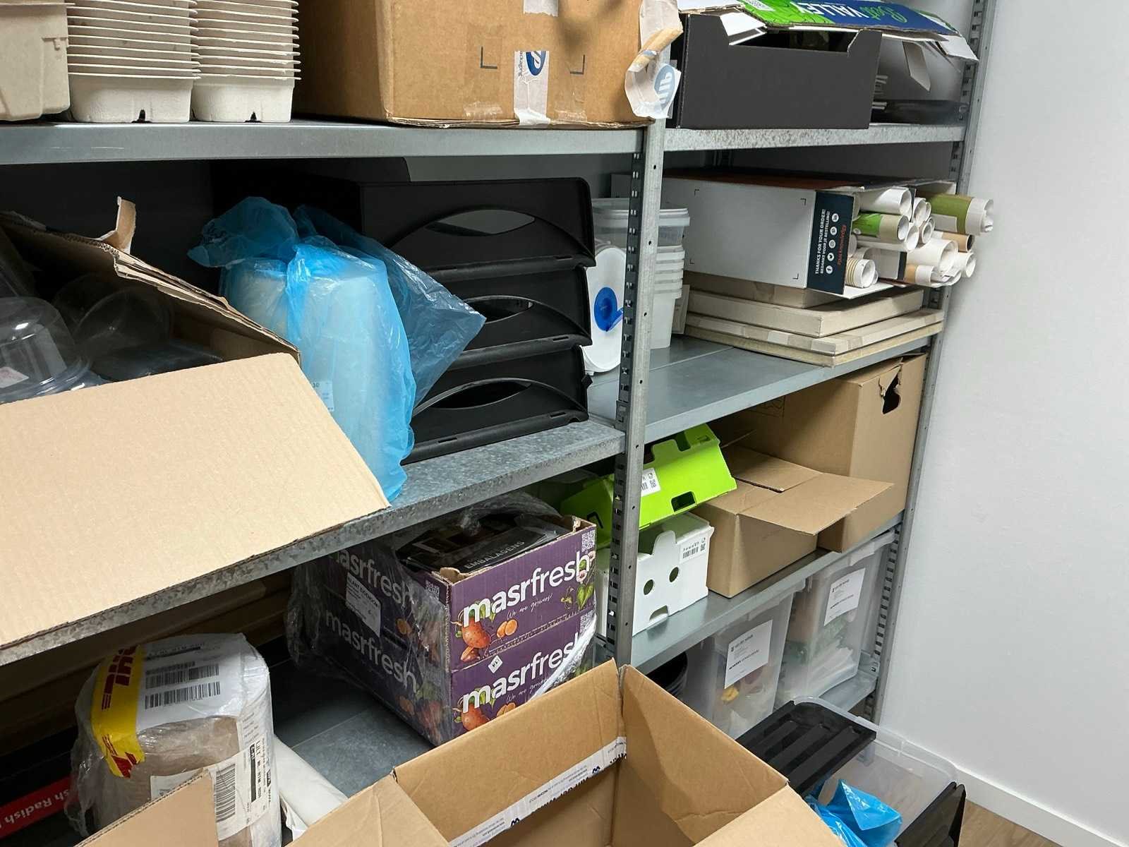 Bestaande uit een Schaffenburg archiefkast, 3 lengtes magazijnstelling, verpakkingsmateriaal, decoratie, en toebehoren. HP printer niet inbegrepen