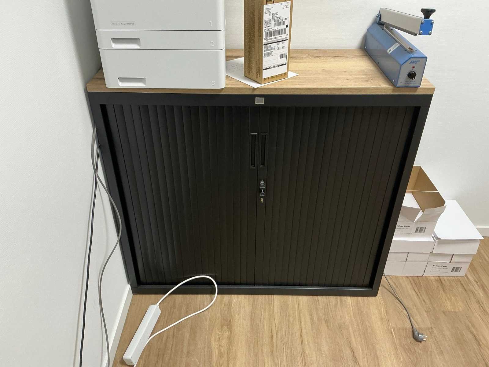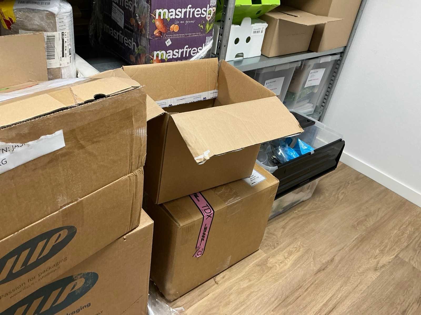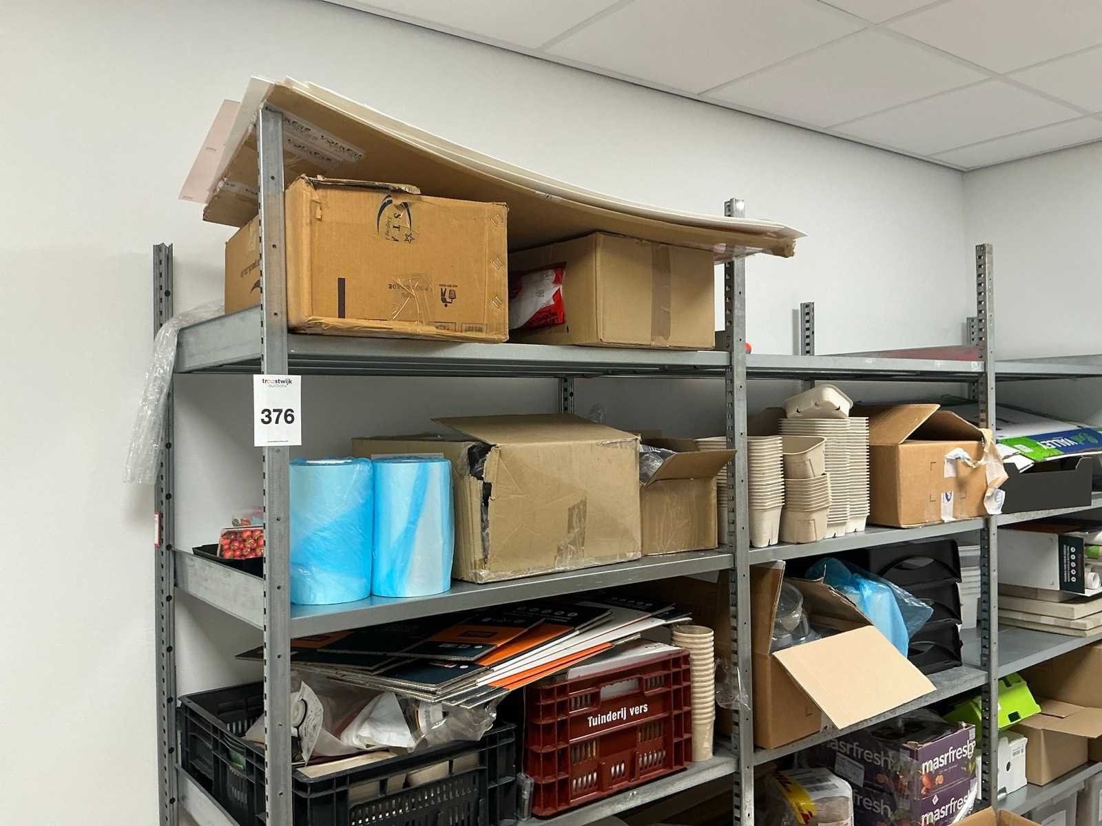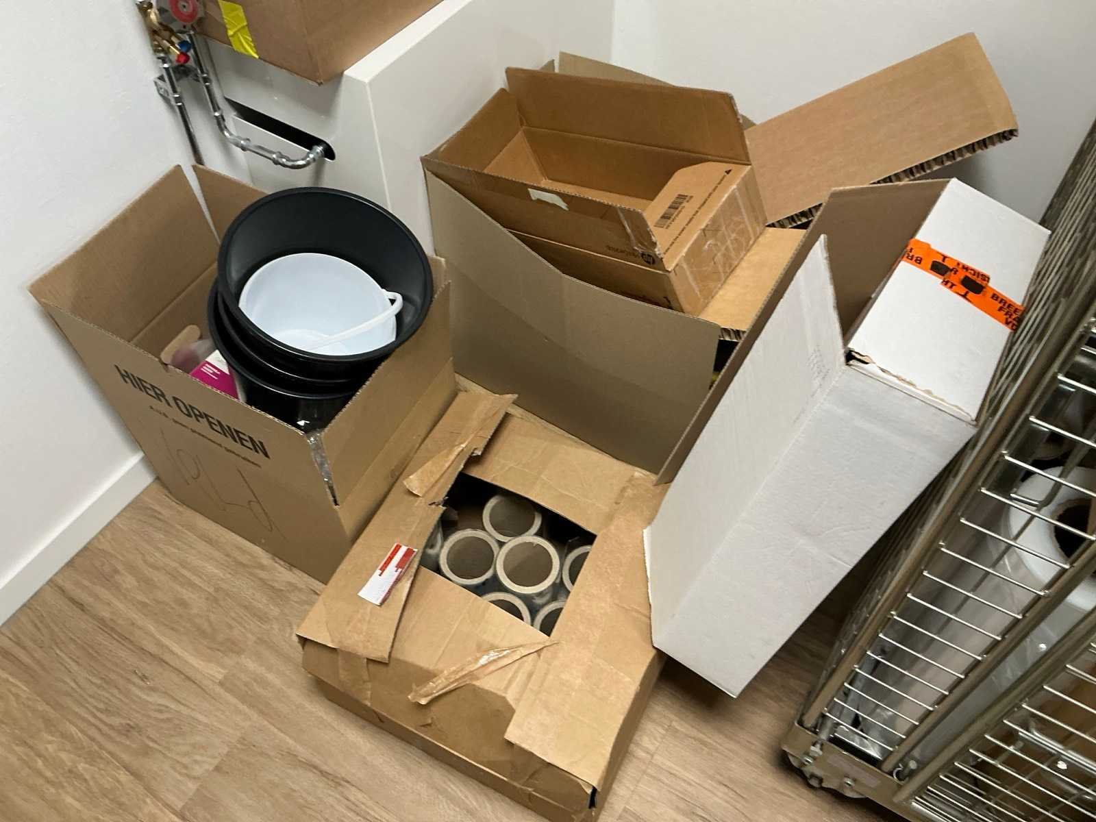 Bestaande uit een Schaffenburg archiefkast, 3 lengtes magazijnstelling, verpakkingsmateriaal, decoratie, en toebehoren. HP printer niet inbegrepen