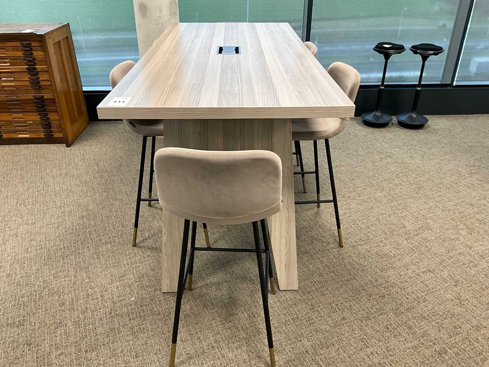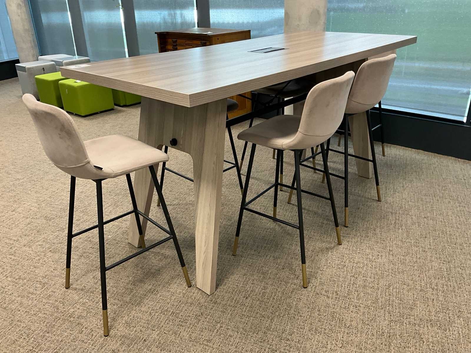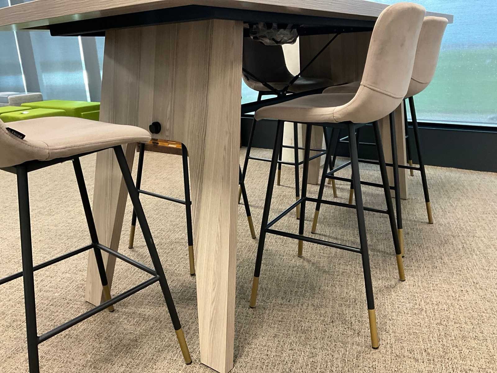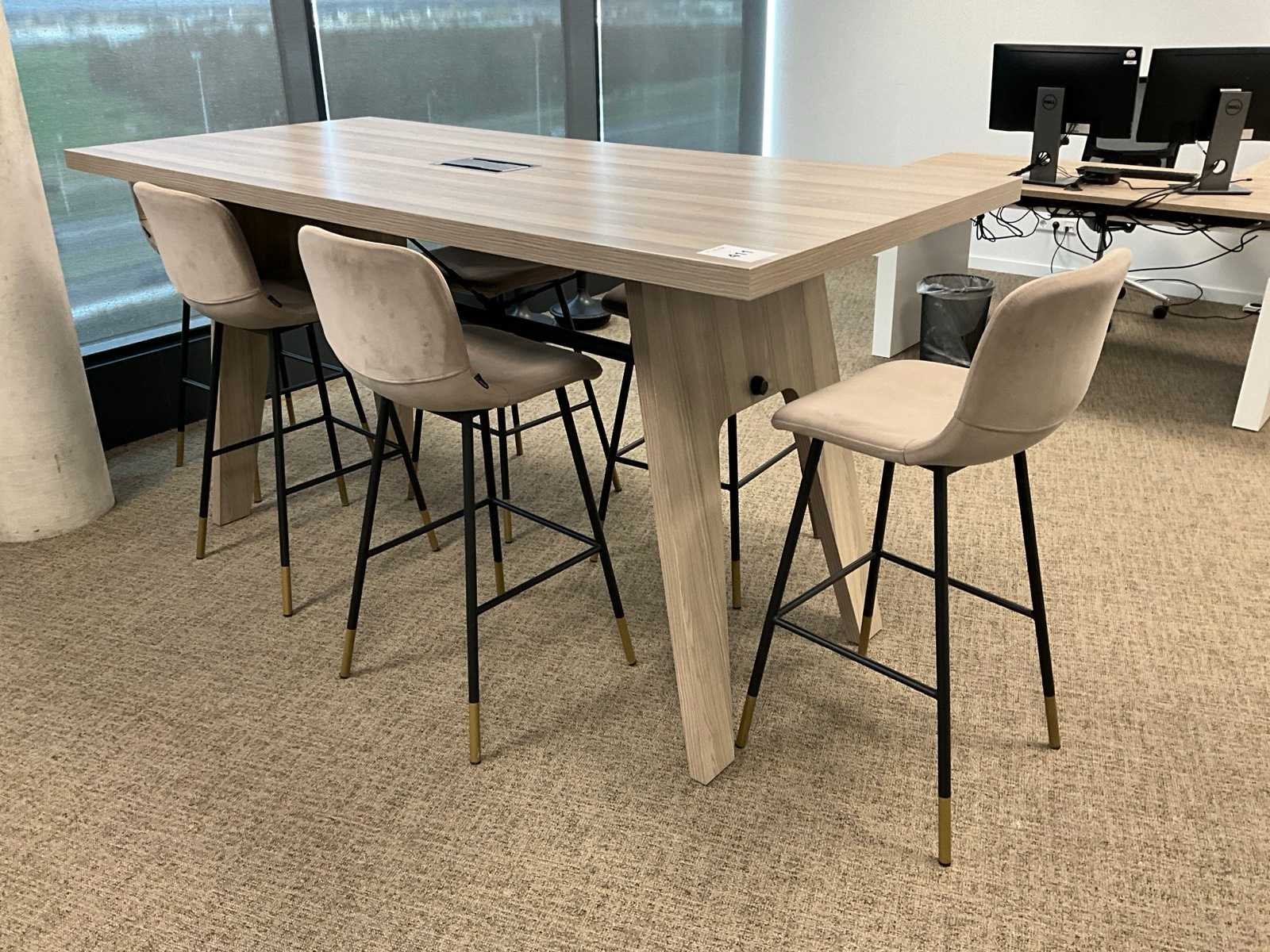 Voorzien van 6x Bronx71 barkruk gestoffeerd, zithoogte 78cm Materiaal: Hout Lengte: 220cm Breedte: 100cm Hoogte: 110cm