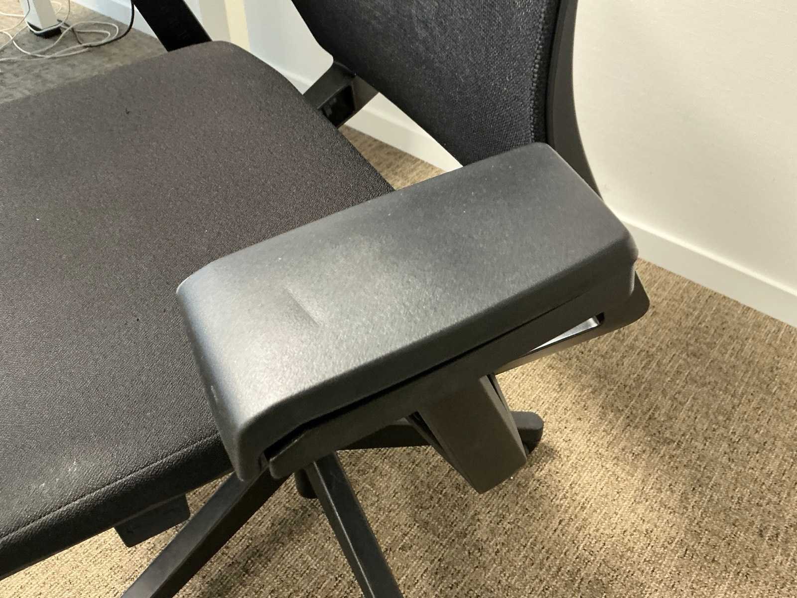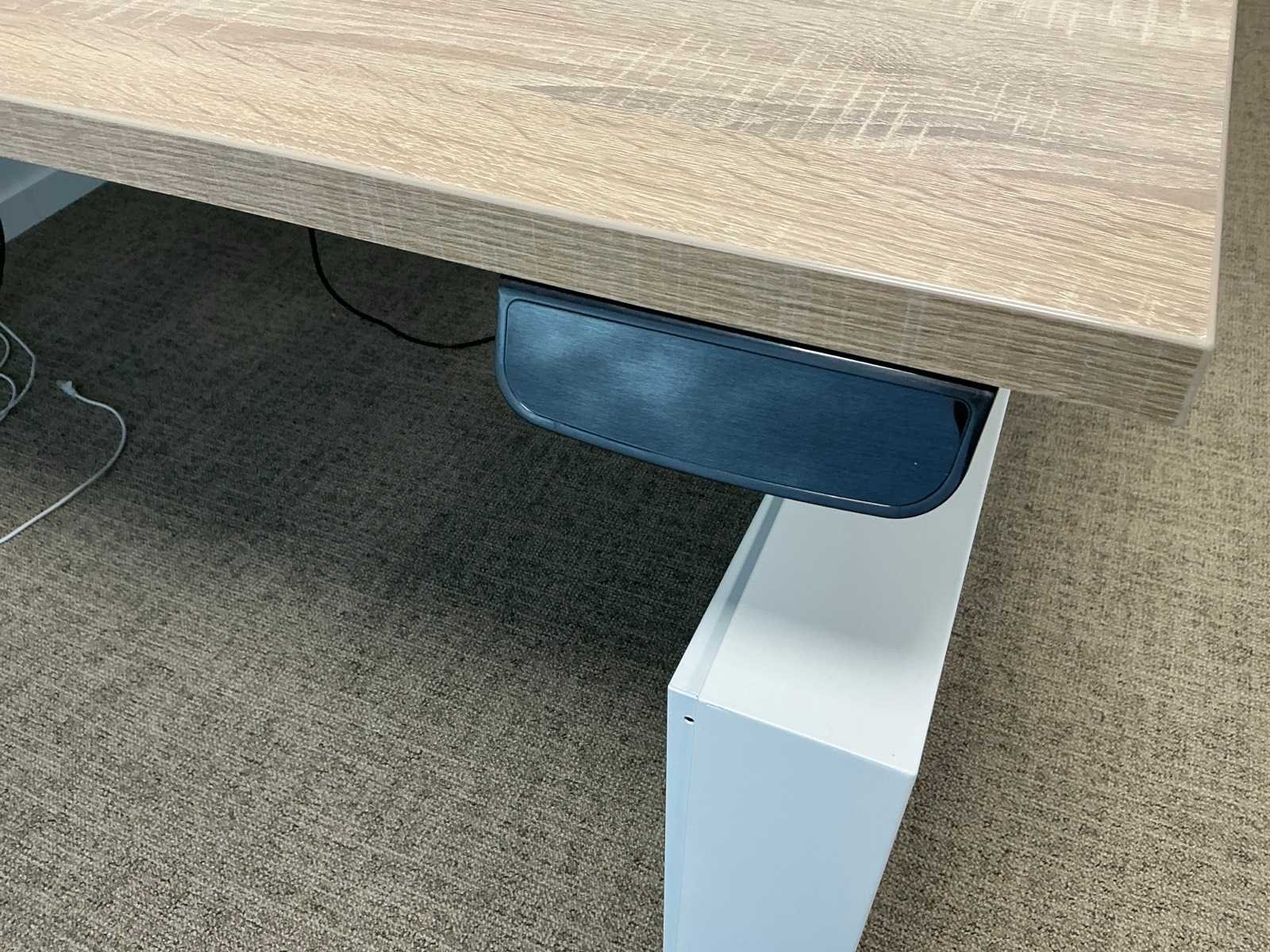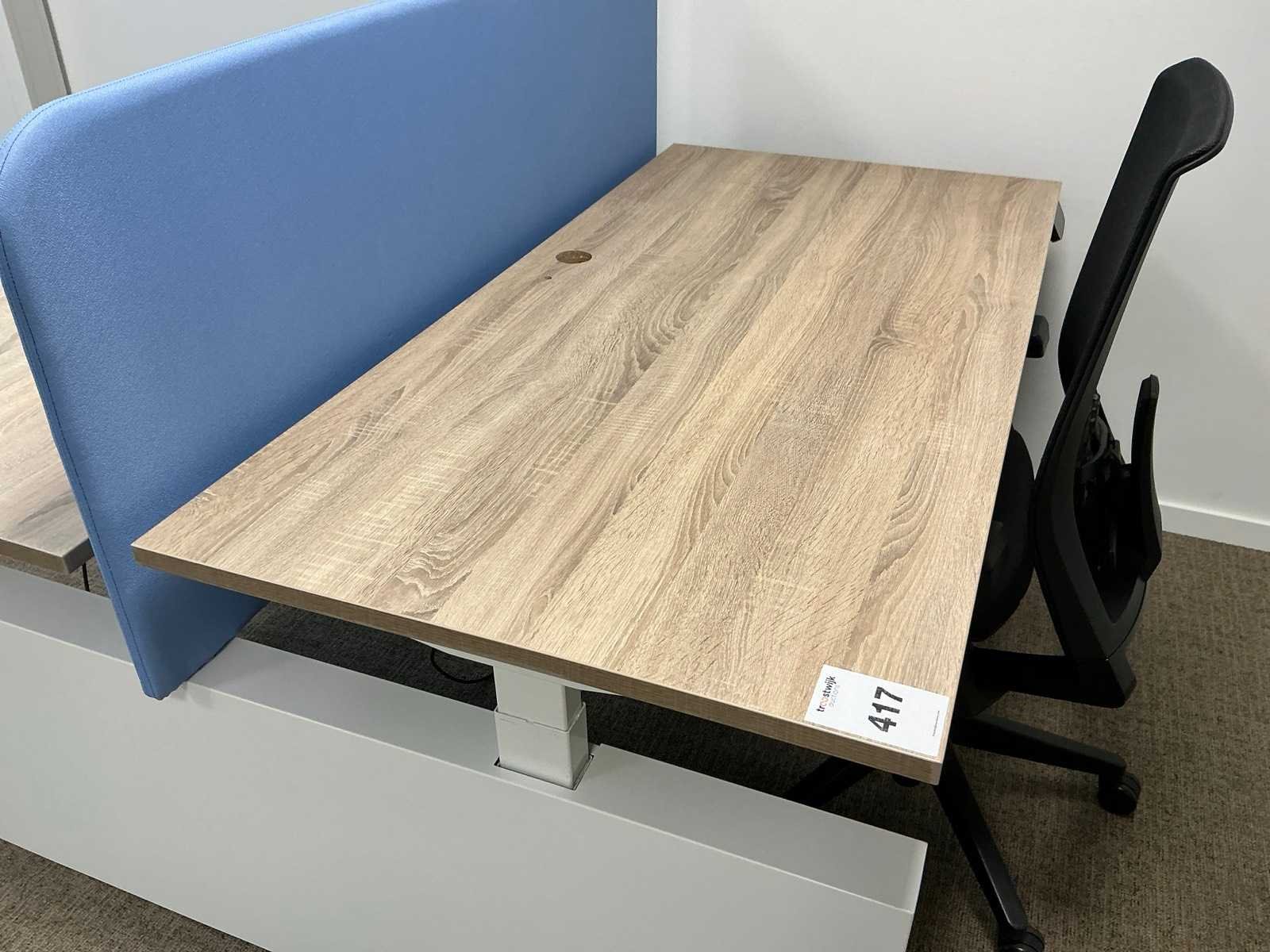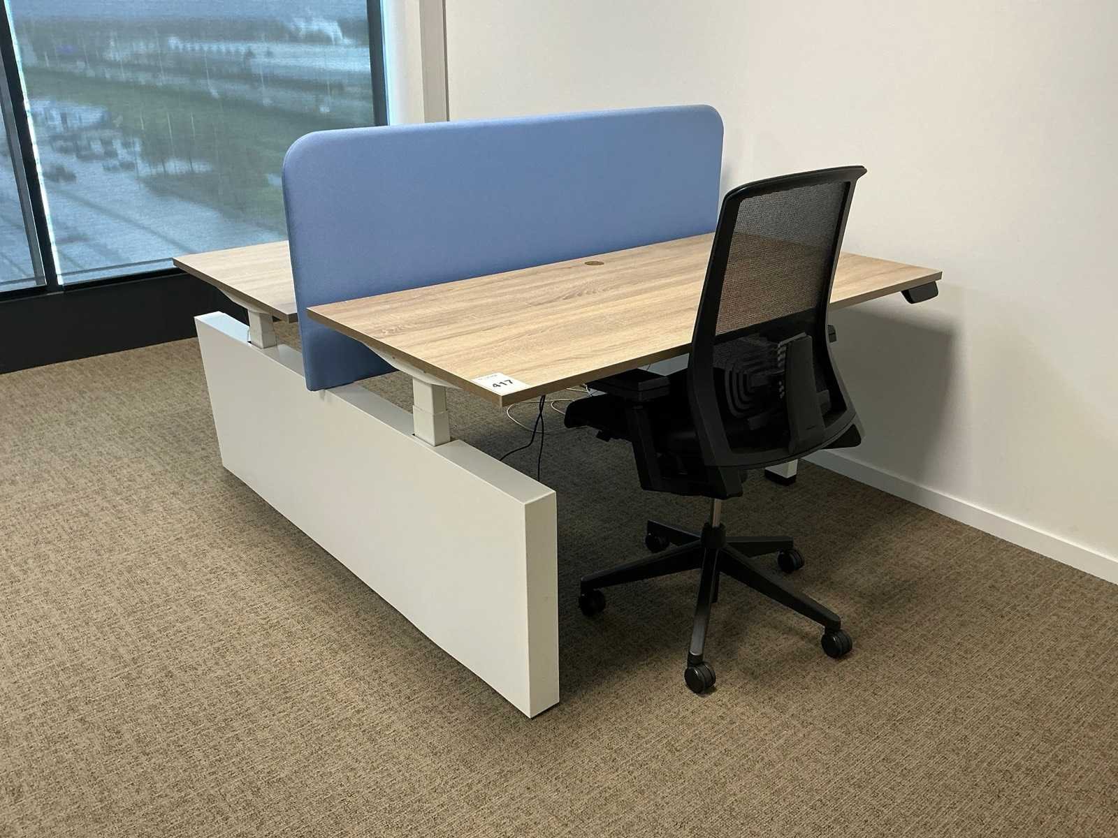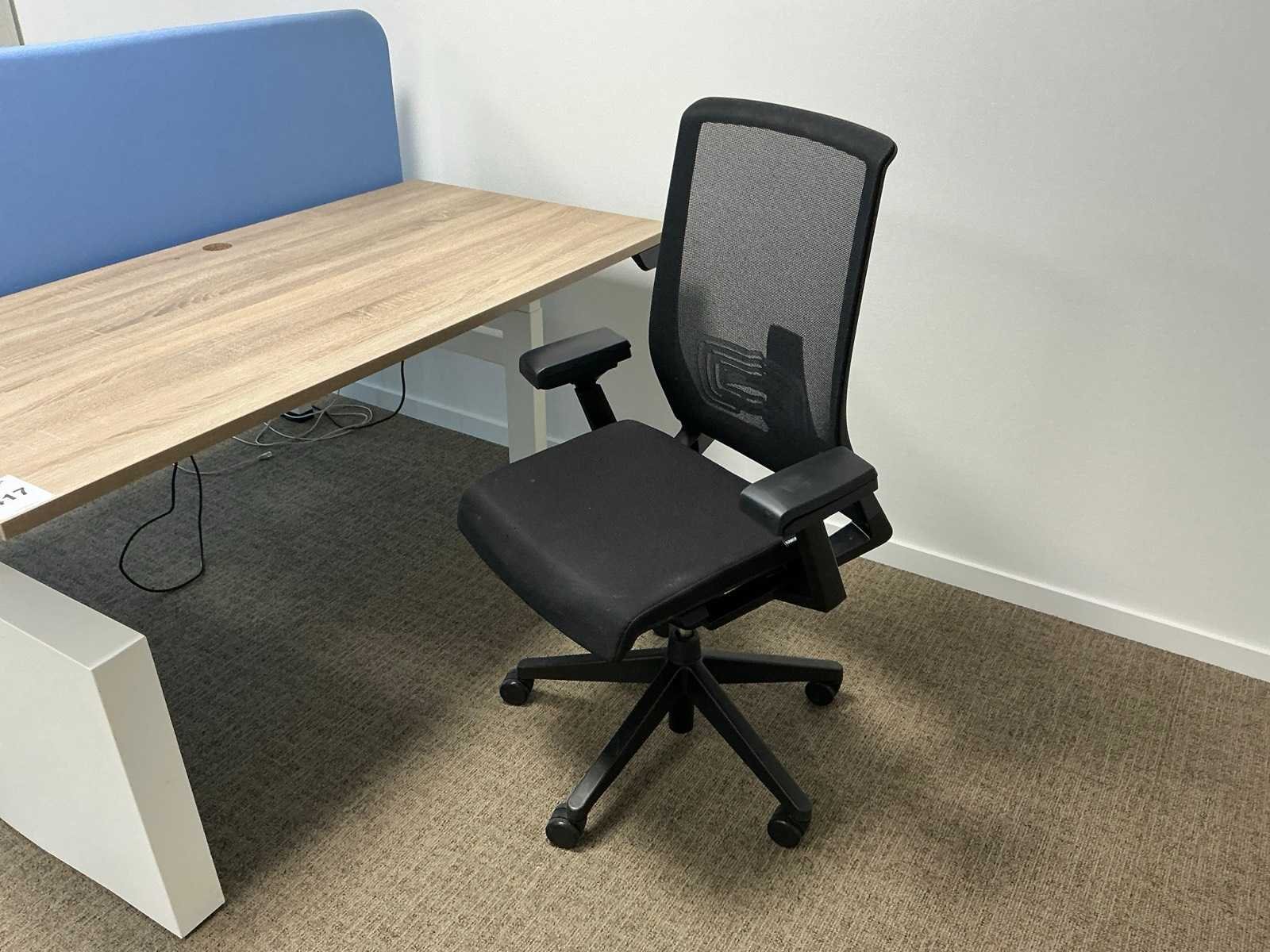 Voorzien van houten blad en metalen frame; inclusief 1x Haworth bureaustoel met 4D armliggers. Merk: Schaffenburg Slingerbureau: true Lengte: 180cm Breedte: 90cm