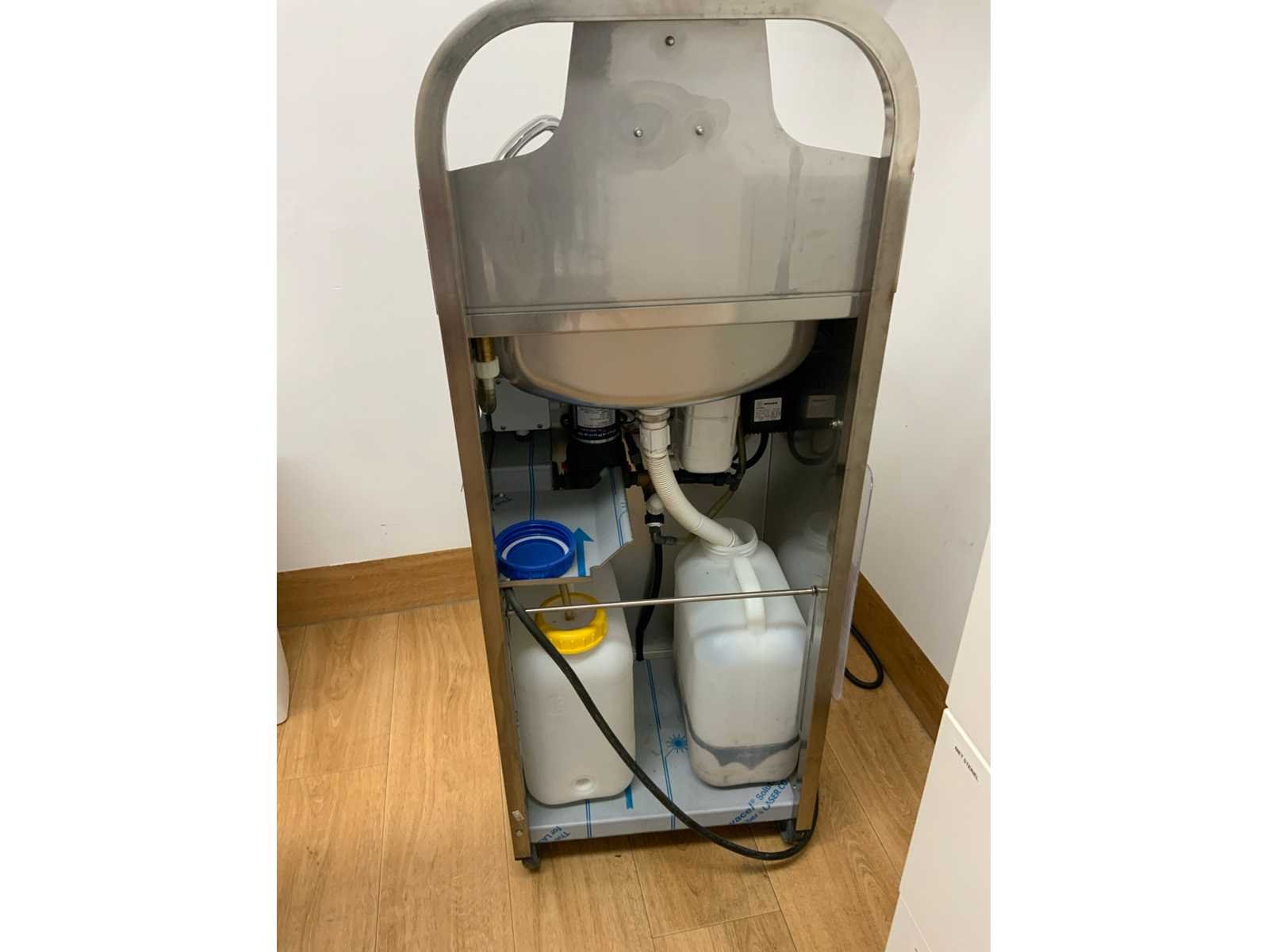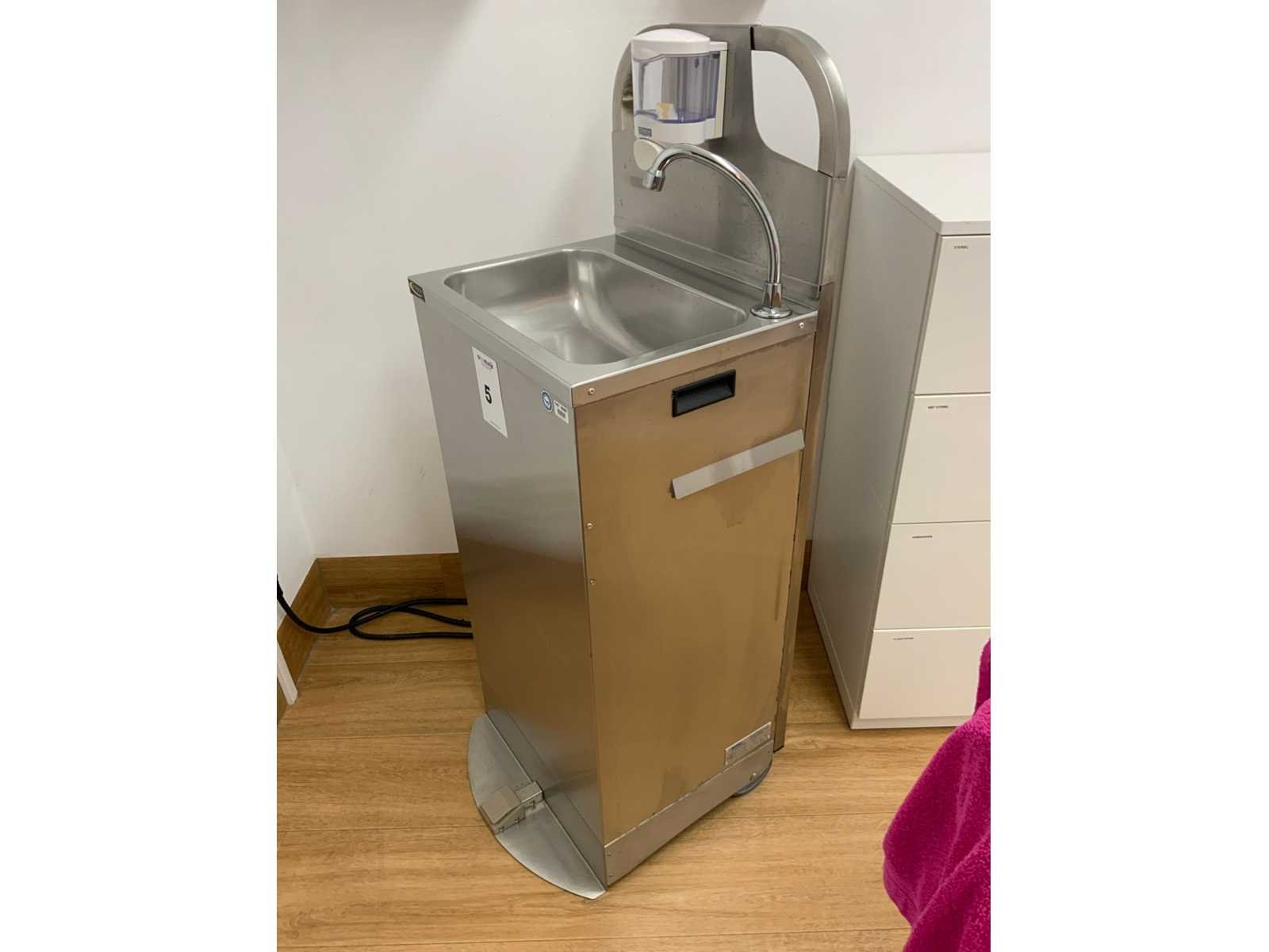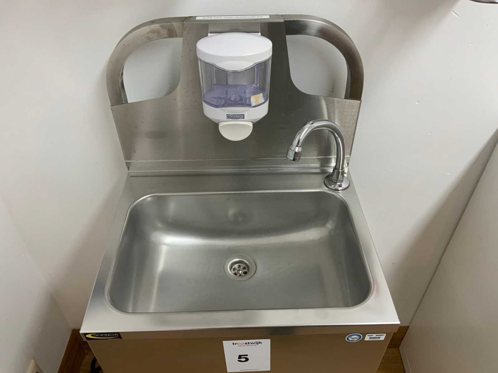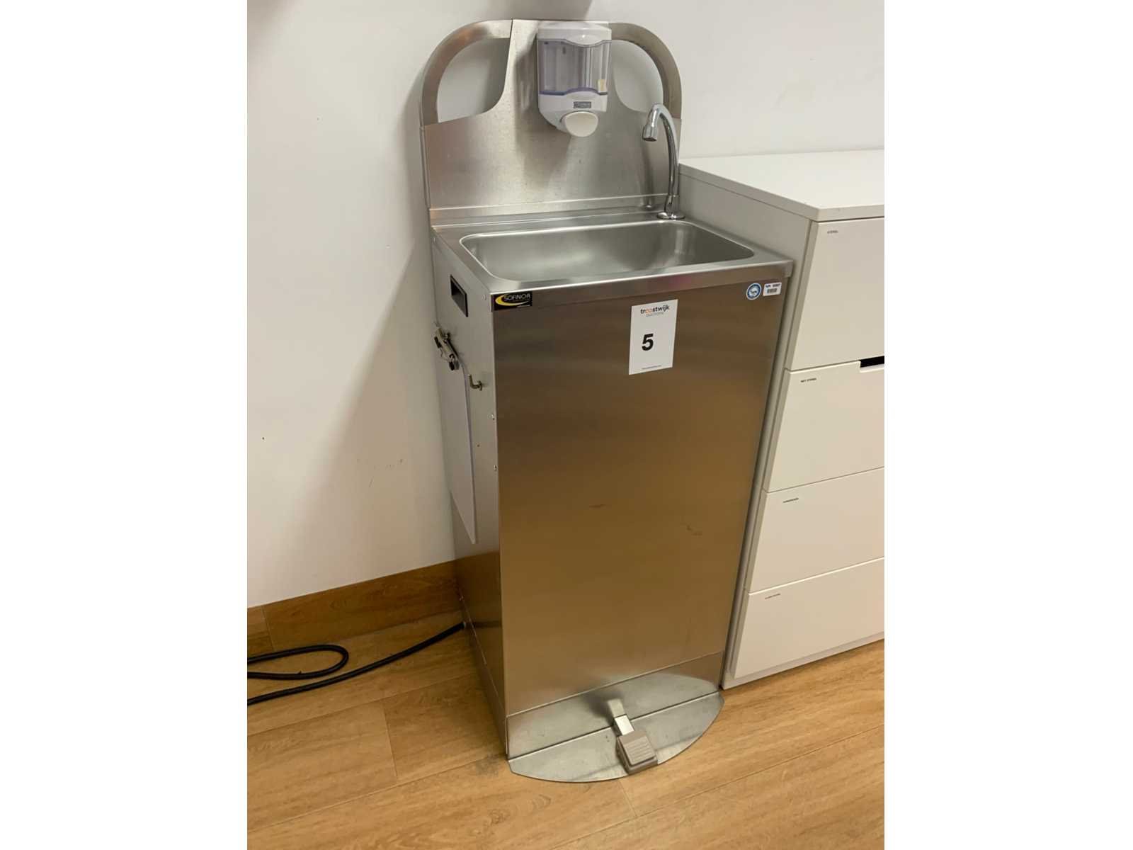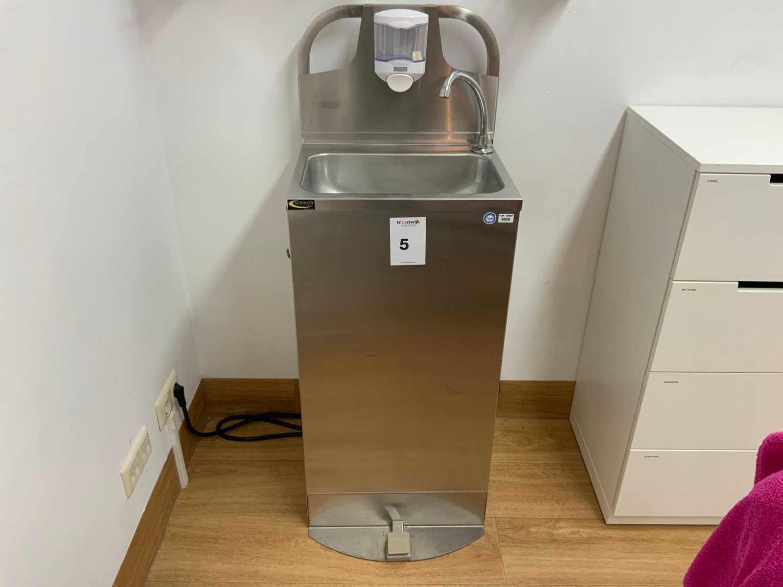 Watertank wastafel, voorzien van voetbediening en zeepdispenser Los staand Merk: Sofinor Rvs: true Met kraan: true Totale afmeting L: 460mm Totale afmeting Breedte: 500mm Totale afmeting Hoogte: 1200mm
