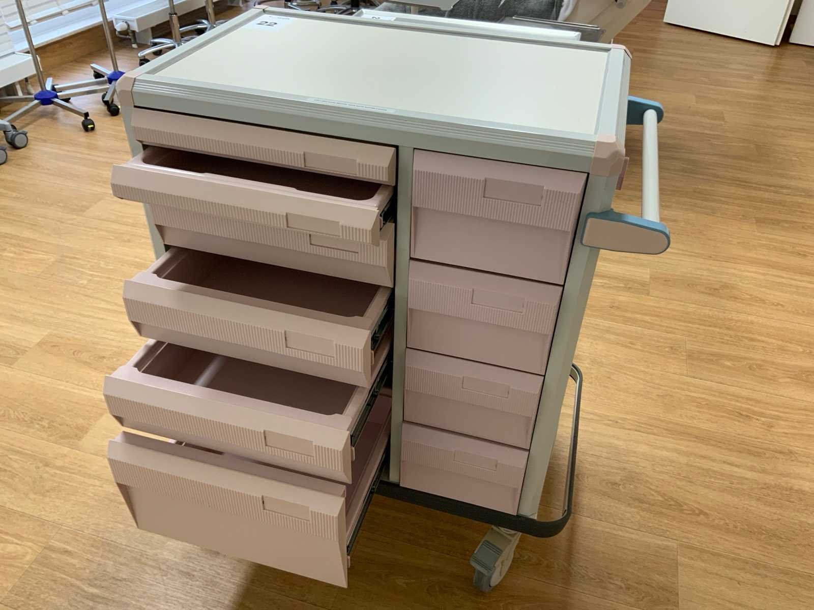 Verrijdbare medicijnkar voorzien van 10 laden en 2 geremde wielen Totale afmeting L: 850mm Totale afmeting Breedte: 560mm Totale afmeting Hoogte: 1020mm
