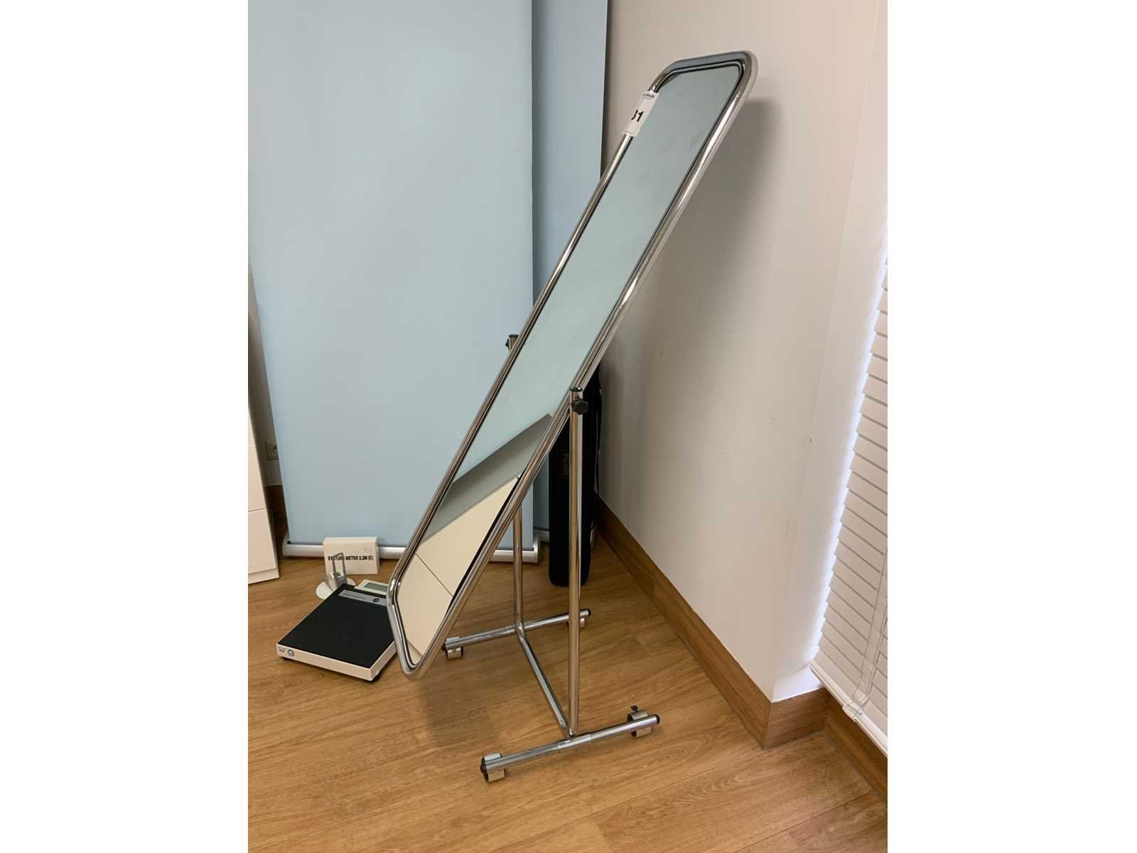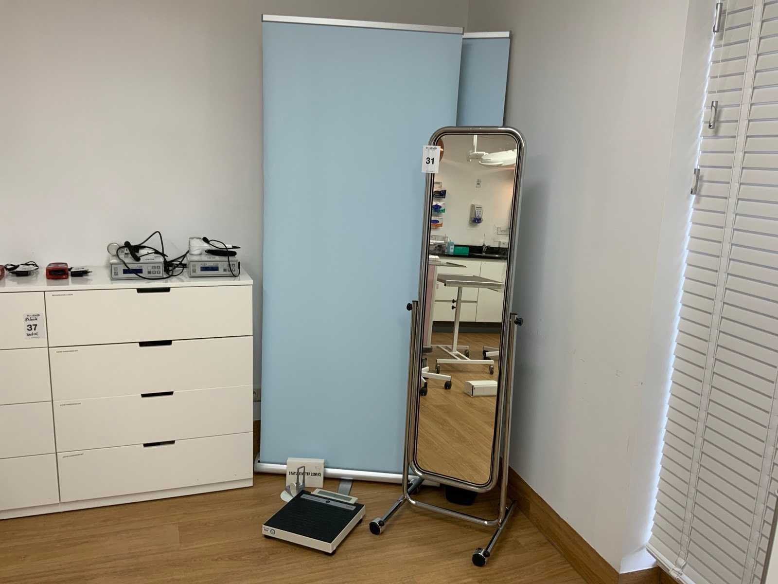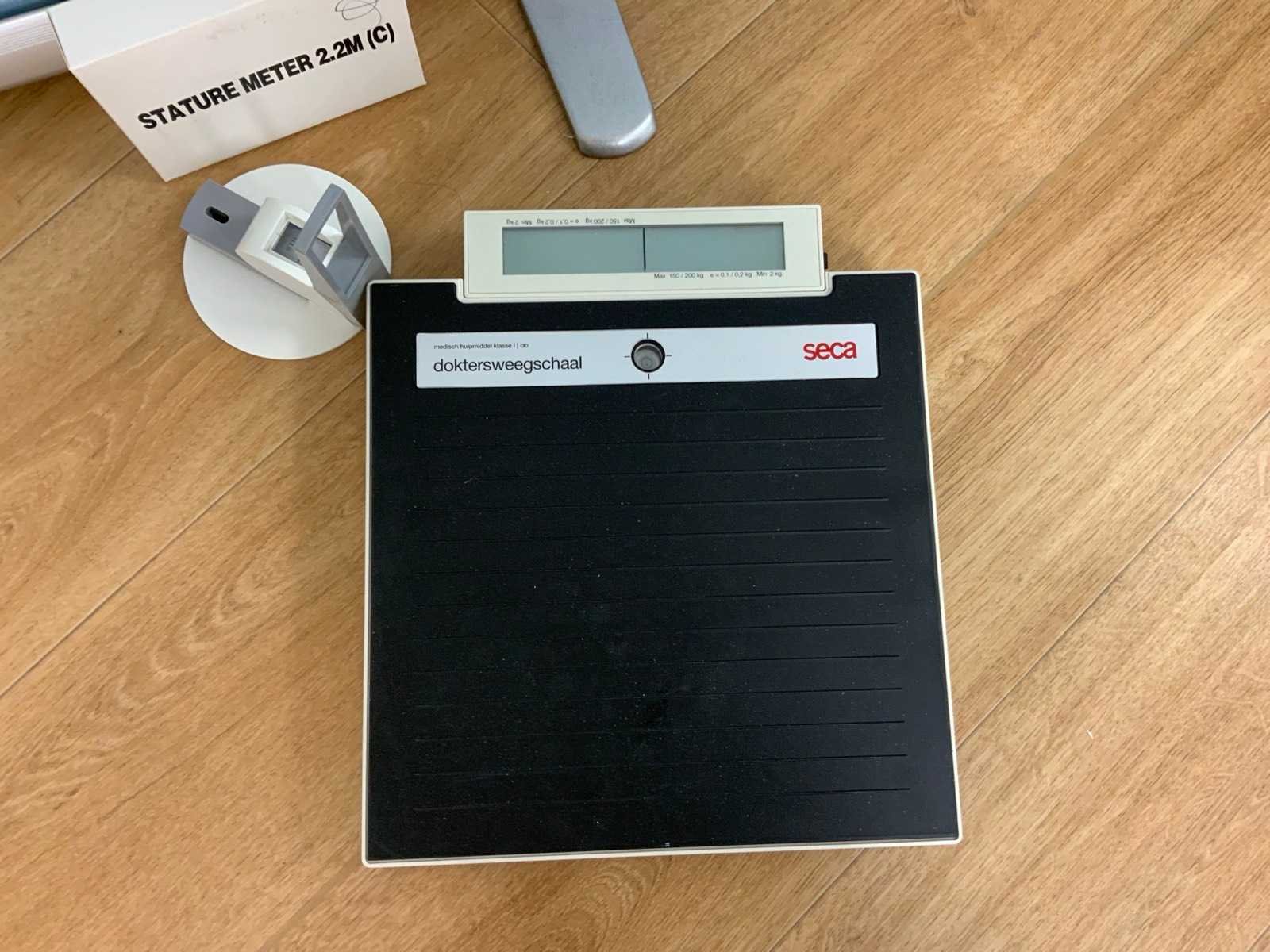 Bestaande uit weegschaal en meetlint, spiegel op verrijdbaar onderstel afm ca. 50x45x165 cm en 2 stuks roll up banners zonder print Merk: Seca