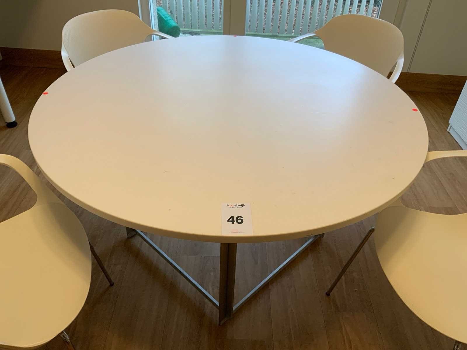 Composiet rond tafelblad op metalen frame Merk: Fritz Hansen Lengte: 130cm Hoogte: 70cm