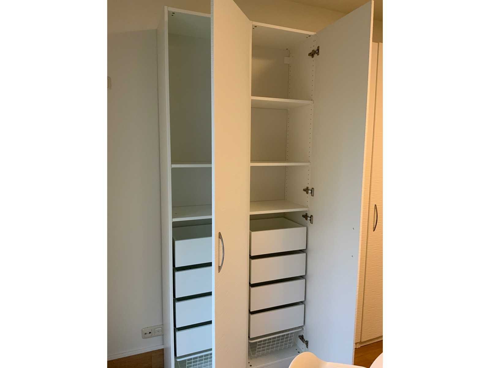 Kasten voorzien van 6 rechts draaiende deuren, diverse legborden , draadkorven en laden. De inhoud is niet inbegrepen. Lengte: 300cm Breedte: 36cm Hoogte: 235cm