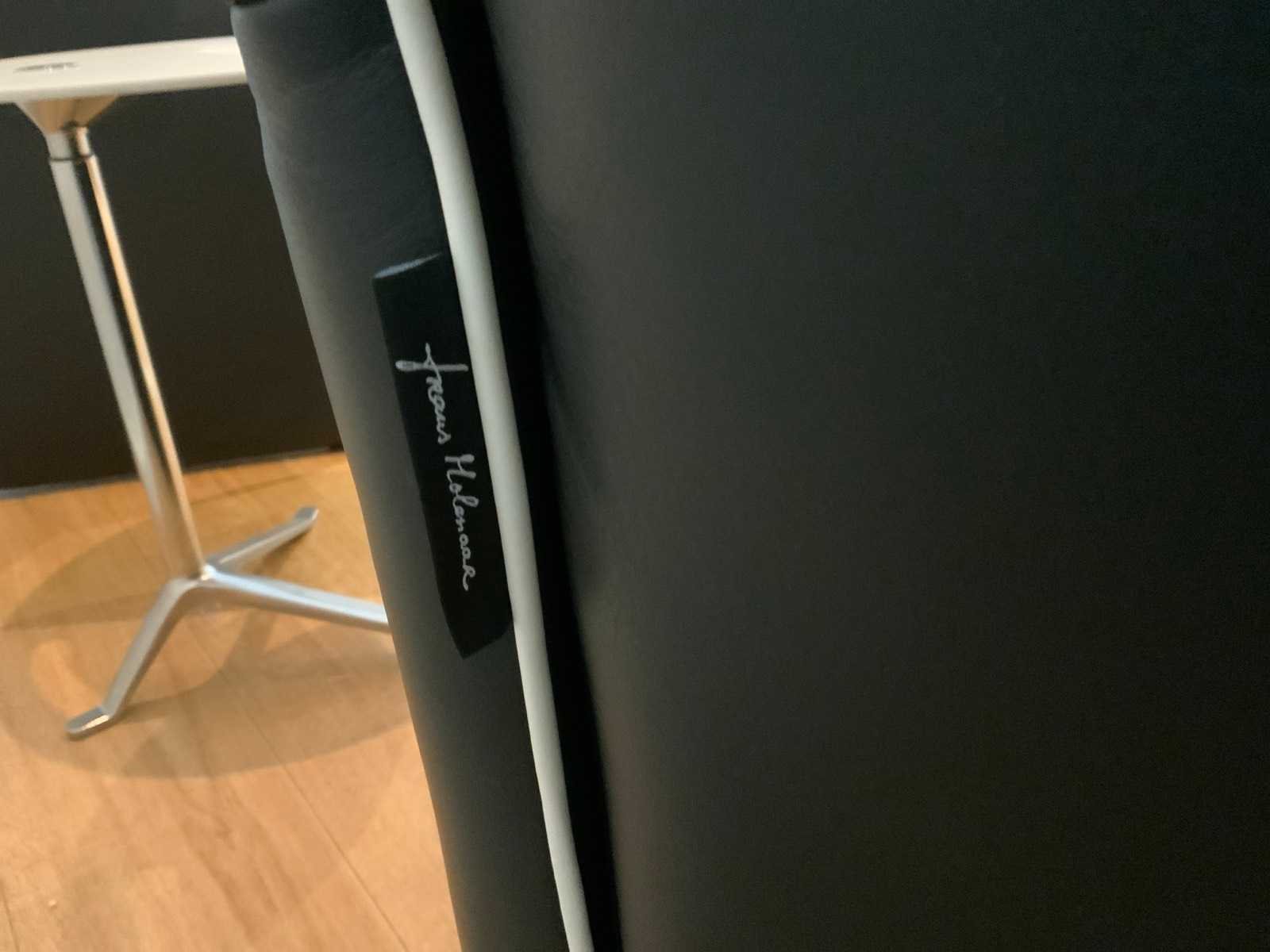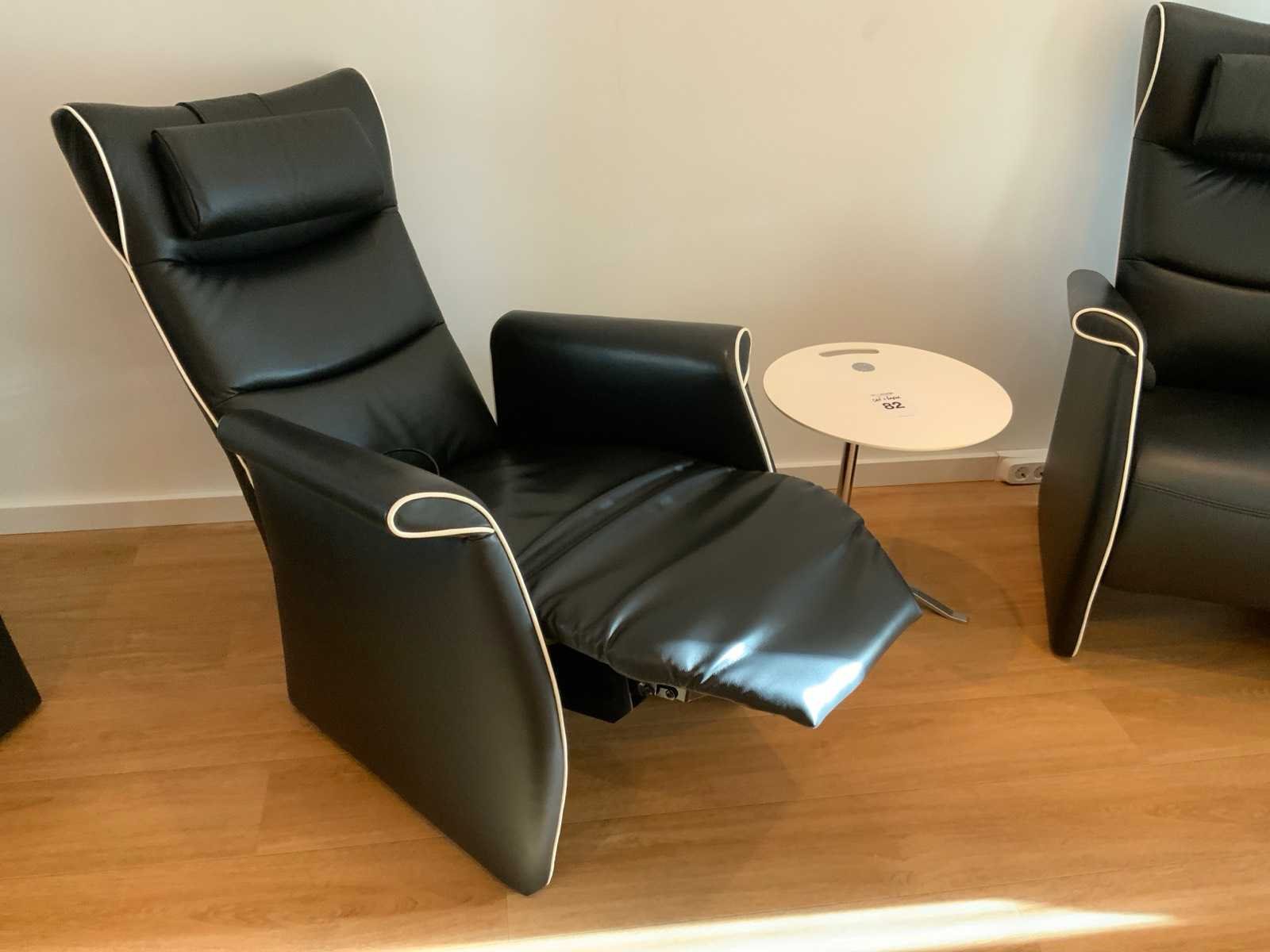 Bestaande uit bijzettafel van Fritz Hanzen ontwerp door Kasper Salto, wit laminaat blad met chromen onderstel, in hoogte verstelbaar d.m.v. drukknop in het blad En relax fauteuil van Frans Molenaar voorzien van achterover klapbare rugleuning, opblaasbare lendesteun d.m.v. pomp en opklapbare voetensteun Alsmede 2 nekkussens Merk: Fritz Hansen Model: Little friend Product type: Frans Molenaar Lengte: 45cm