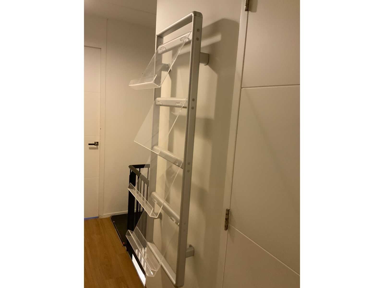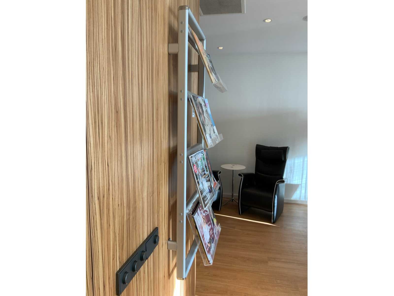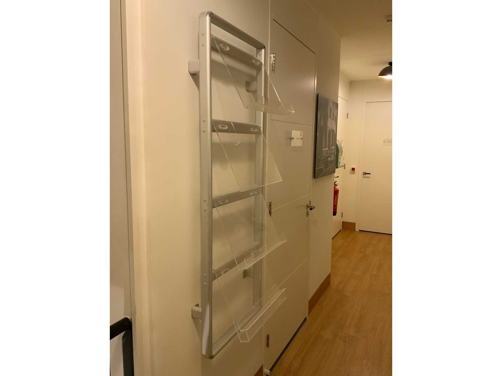 Wandgemonteerde folder display voorzien van transparante kunststof legborden Waarvan 1 op gang 1e verdieping Breedte: 50 Hoogte: 140