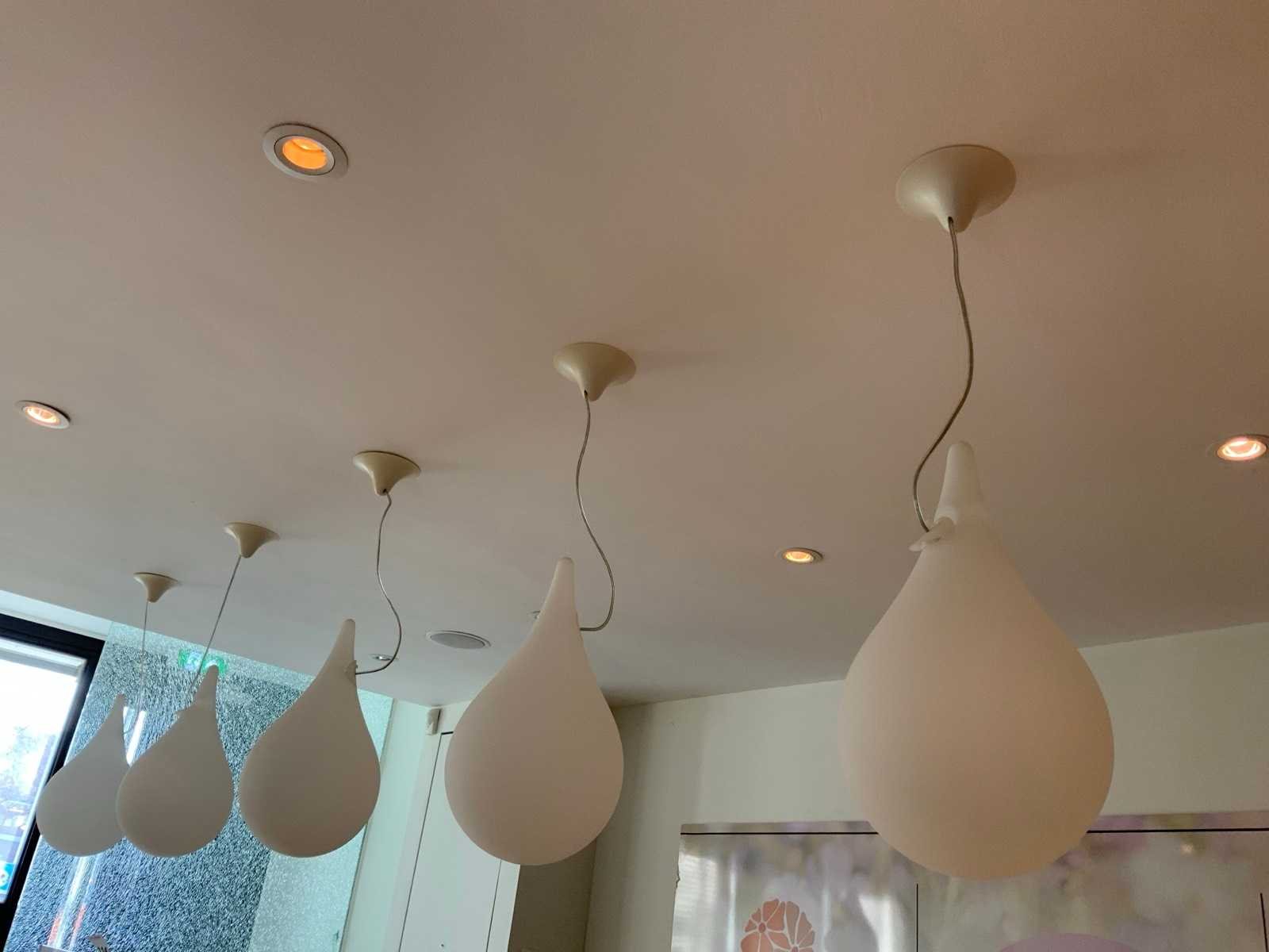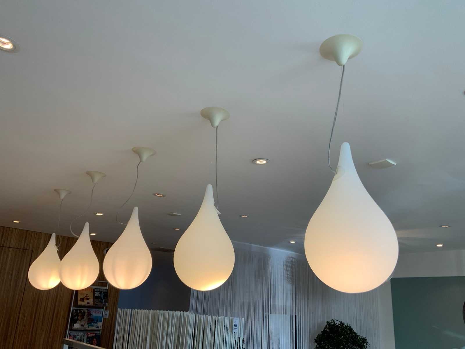 Kunststof druppelvorm hanglamp Dit kavel dient door de koper zelf gedemonteerd te worden. Elektra dient afgedopt te worden en koper dient ook zelf te zorgen voor de benodigde gereedschappen, transport- en/of verpakkingsmateriaal Met lichtbron: true Lengte: 25cm Hoogte: 50cm