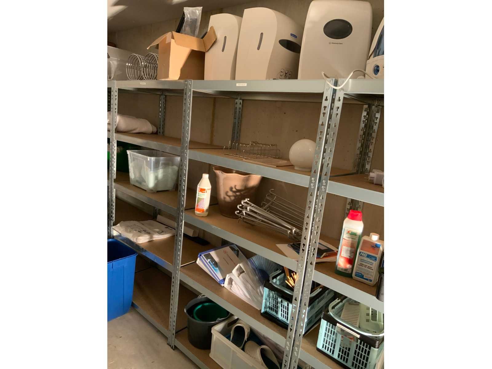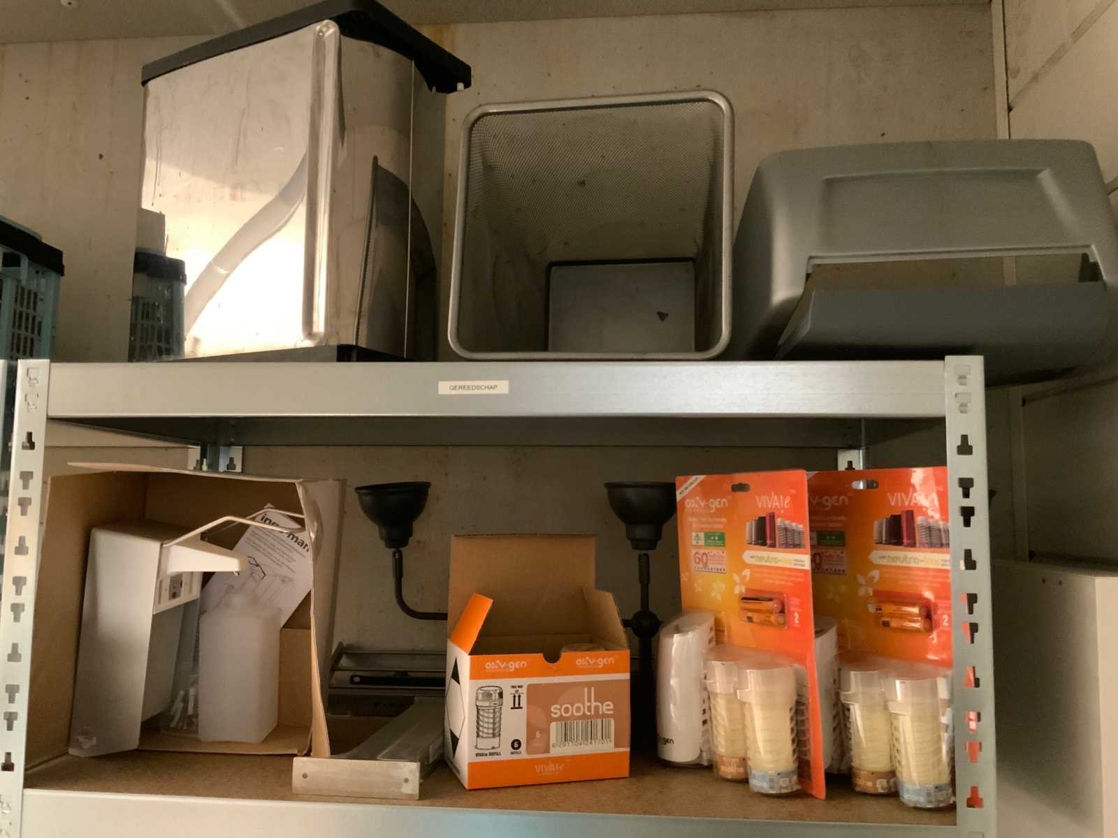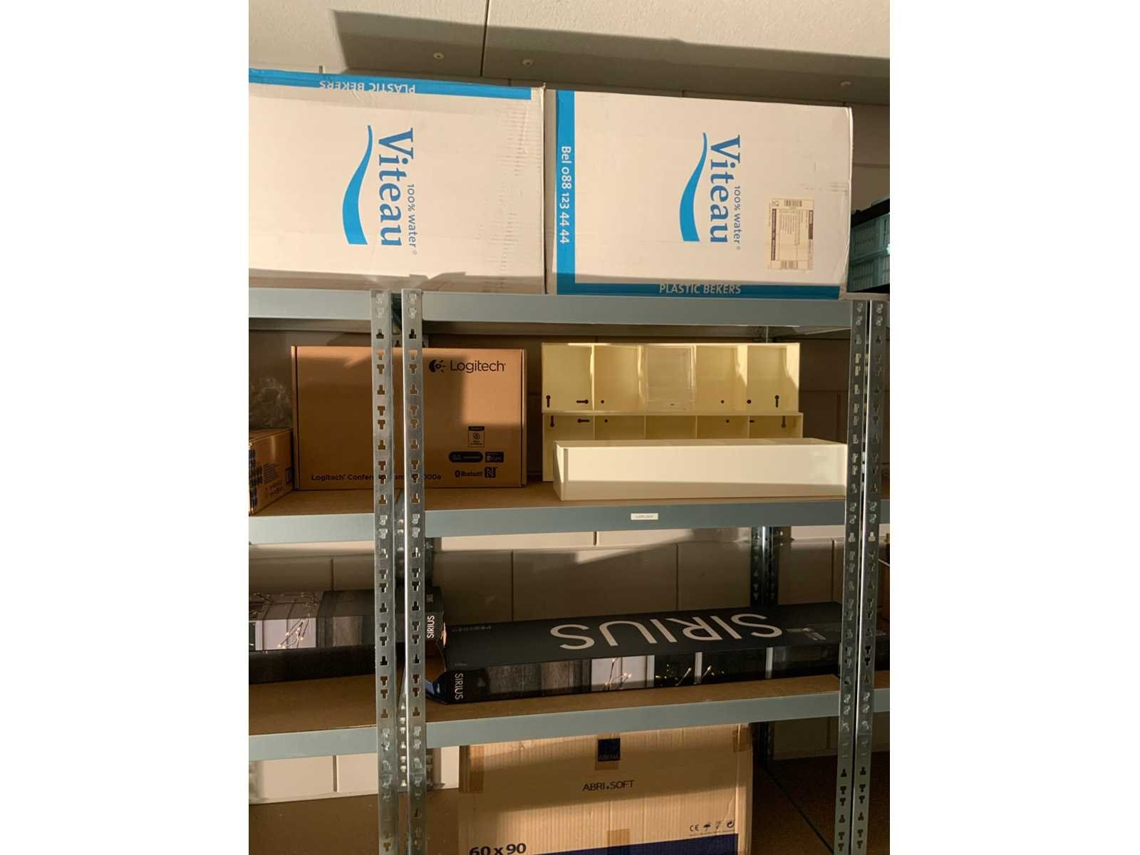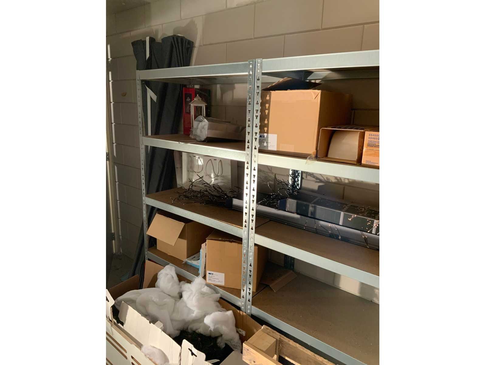 Bestaande uit gehele inhoud van het magazijn. O.a. bestaande uit 14 secties magazijn stelling, waarvan 3 nieuw in verpakking Campingtafel, coronascherm, kerstboom en kerstverlichting, diverse gereedschap, Kimberly clark dispensers, huishoudtrap, bouwlamp, disposable bekers, infuuspalen Aantal secties: 14 Sectie afm. b: 900mm Sectie diepte: 445mm Sectie afm. h: 1790mm Demontabel: true