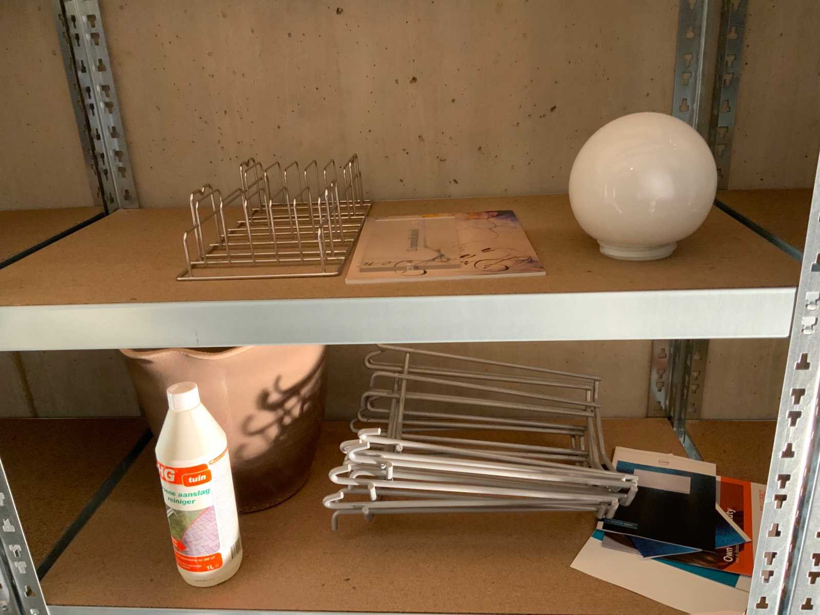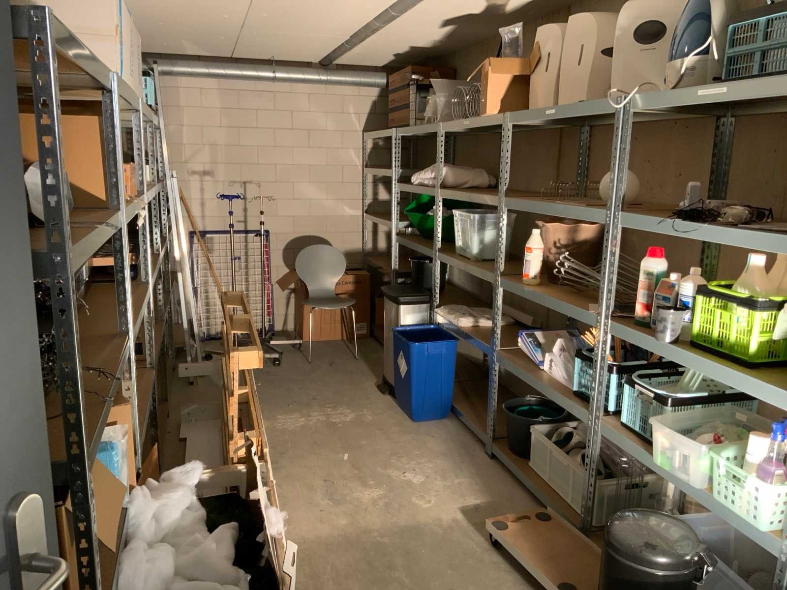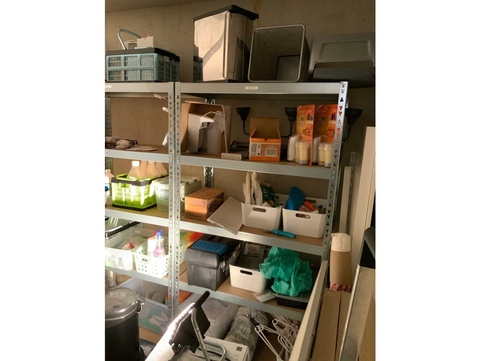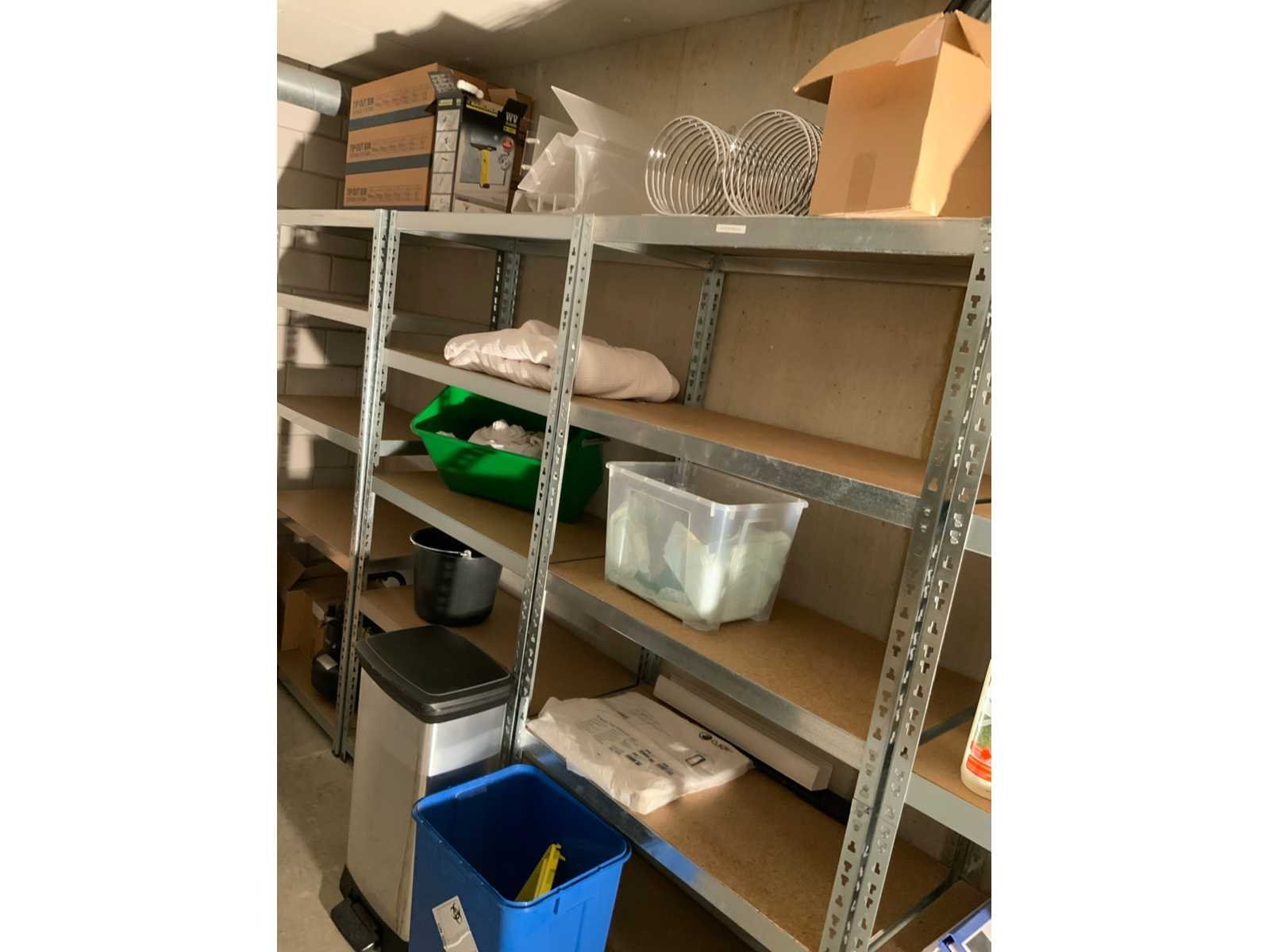 Bestaande uit gehele inhoud van het magazijn. O.a. bestaande uit 14 secties magazijn stelling, waarvan 3 nieuw in verpakking Campingtafel, coronascherm, kerstboom en kerstverlichting, diverse gereedschap, Kimberly clark dispensers, huishoudtrap, bouwlamp, disposable bekers, infuuspalen Aantal secties: 14 Sectie afm. b: 900mm Sectie diepte: 445mm Sectie afm. h: 1790mm Demontabel: true