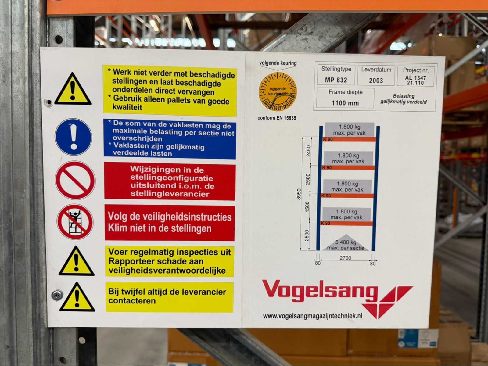 Voorzien van: A-safe aanrijdbeveiliging, staanderbescherming. Aantal rijen: 7, secties per rij: 23. Dit kavel is onderdeel van een combinatiekavel (kavel 6), bestaande uit de volgende kavels: 1 t/m 5 Merk: Vogelsang Bouwjaar: 2003 Aantal secties: 161 Sectie afm. b: 2700mm Sectie diepte: 1100mm Aantal staanders: 168 Aantal liggers: 1287