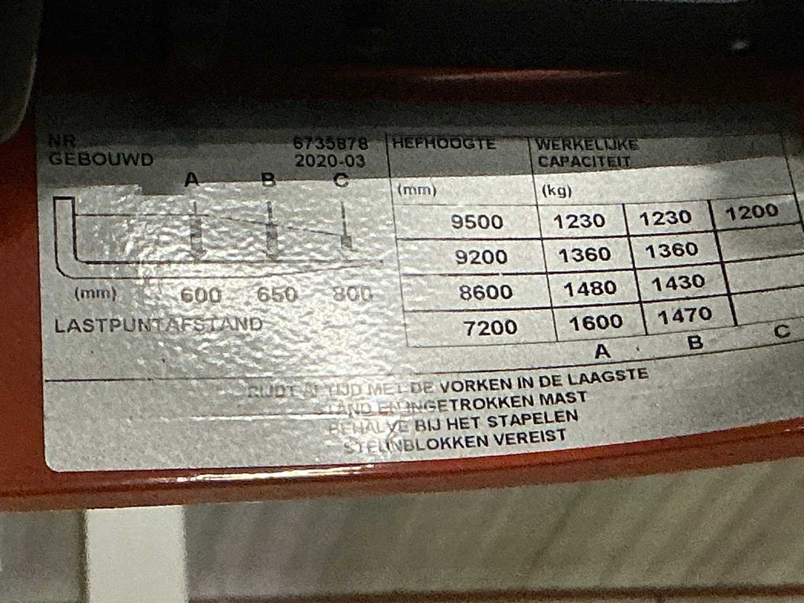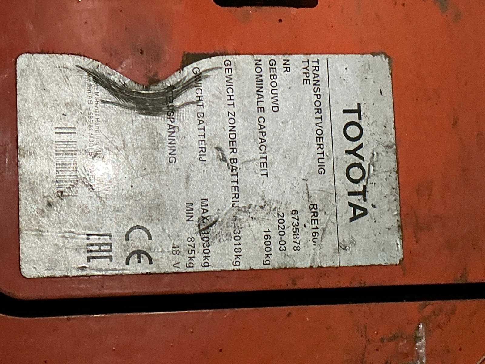 Voorzien van: blue-spot, digitaal display, Zebra labelprinter, Honeywell barcode scanner en display met hoogtemeter en weegsysteem. Inclusief extra accu welke niet is gecontroleerd op werking Merk: Toyota Type: RRE160H Bouwjaar: 2020 Serienummer: 6735878 Afgelezen urenstand: 1740 Accu lader: true Side-shift: true Duplex mast: true Eigen gewicht: 4000kg Hefvermogen: 1600kg Lepellengte: 1150mm Min. hefhoogte: 9500mm Hefhoogte: 9500mm Minimale doorrijhoogte: 3760mm Totale afmeting L: 2500mm Totale afmeting Breedte: 1250mm Totale afmeting Hoogte: 3760mm Elektrisch: true