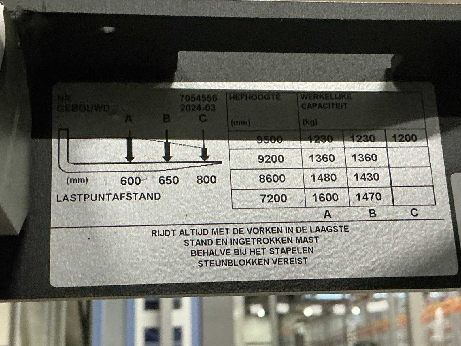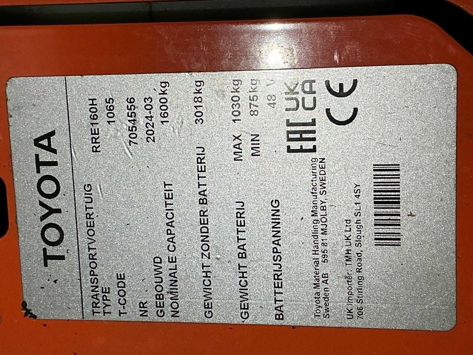 Voorzien van: blue-spot, digitaal display, Zebra labelprinter, Honeywell barcode scanner en display met hoogtemeter en weegsysteem. Inclusief extra accu welke niet is gecontroleerd op werking Merk: Toyota Type: RRE160H Bouwjaar: 2024 Serienummer: 7054556 Accu lader: true Side-shift: true Duplex mast: true Eigen gewicht: 4000kg Hefvermogen: 1600kg Lepellengte: 1150mm Hefhoogte: 9500mm Minimale doorrijhoogte: 3750mm Totale afmeting L: 2500mm Totale afmeting Breedte: 1250mm Totale afmeting Hoogte: 3750mm Elektrisch: true