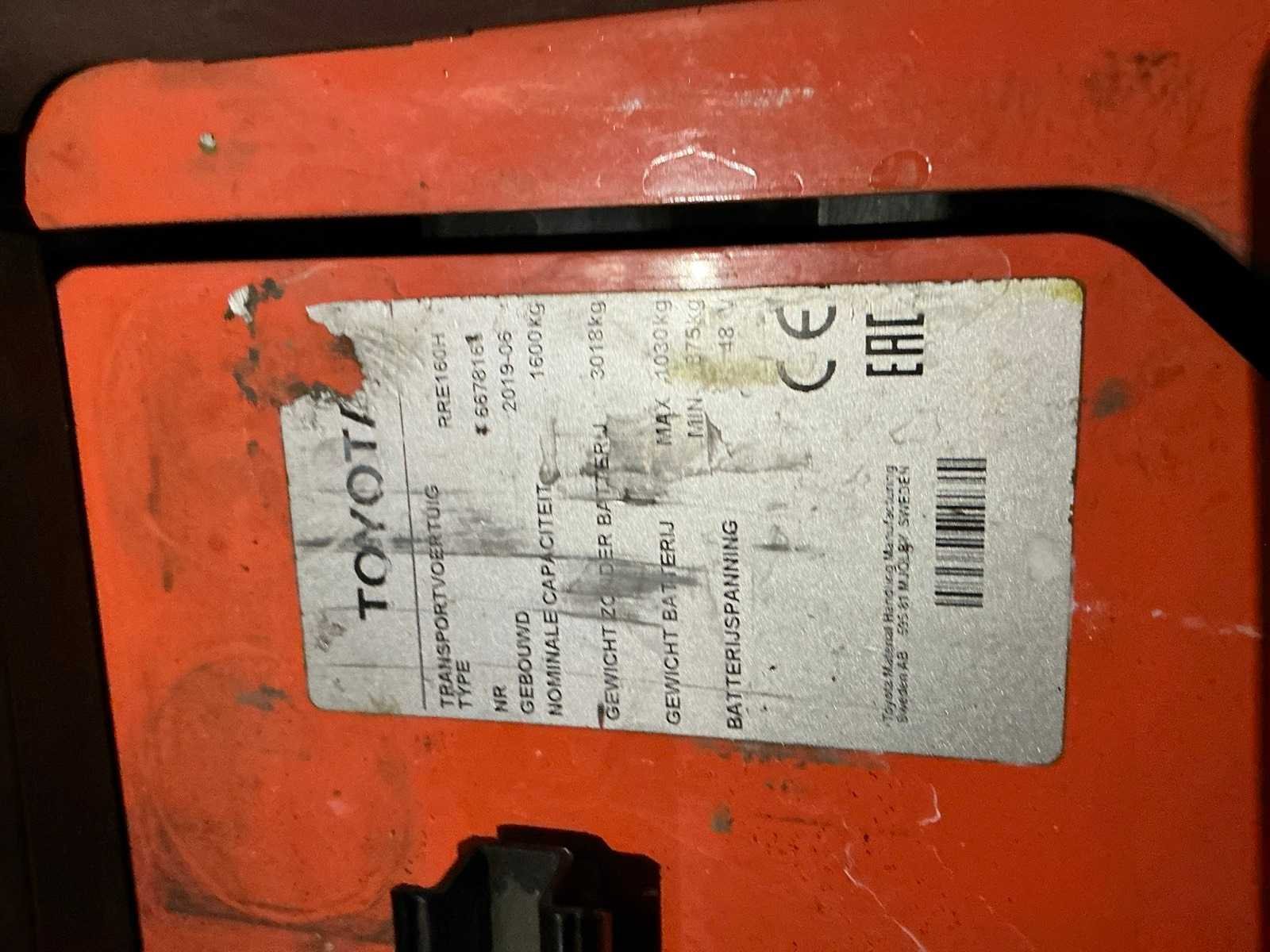 Voorzien van: blue-spot, digitaal display, Zebra labelprinter, Honeywell barcode scanner en display met hoogtemeter en weegsysteem. Inclusief extra accu welke niet is gecontroleerd op werking. Merk: Toyota Type: RRE160H Bouwjaar: 2019 Serienummer: 6678168 Afgelezen urenstand: 6698 Accu lader: true Side-shift: true Duplex mast: true Eigen gewicht: 4000kg Hefvermogen: 1600kg Lepellengte: 1150mm Hefhoogte: 9500mm Minimale doorrijhoogte: 3760mm Totale afmeting L: 2500mm Totale afmeting Breedte: 1250mm Totale afmeting Hoogte: 3760mm Elektrisch: true