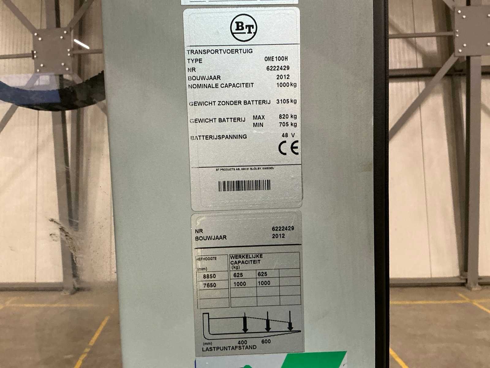 Voorzien van: blue-spot, digitaal display, Honeywell barcode scanner en display met hoogtemeter en weegsysteem Merk: Toyota Type: BT Optio OME100H Bouwjaar: 2012 Serienummer: 6222429 Afgelezen urenstand: 2068 Duplex mast: true Eigen gewicht: 4000kg Hefvermogen: 1000kg Lepellengte: 1000mm Hefhoogte: 8850mm Minimale doorrijhoogte: 3800mm Totale afmeting L: 2900mm Totale afmeting Breedte: 1220mm Totale afmeting Hoogte: 3800mm Elektrisch: true