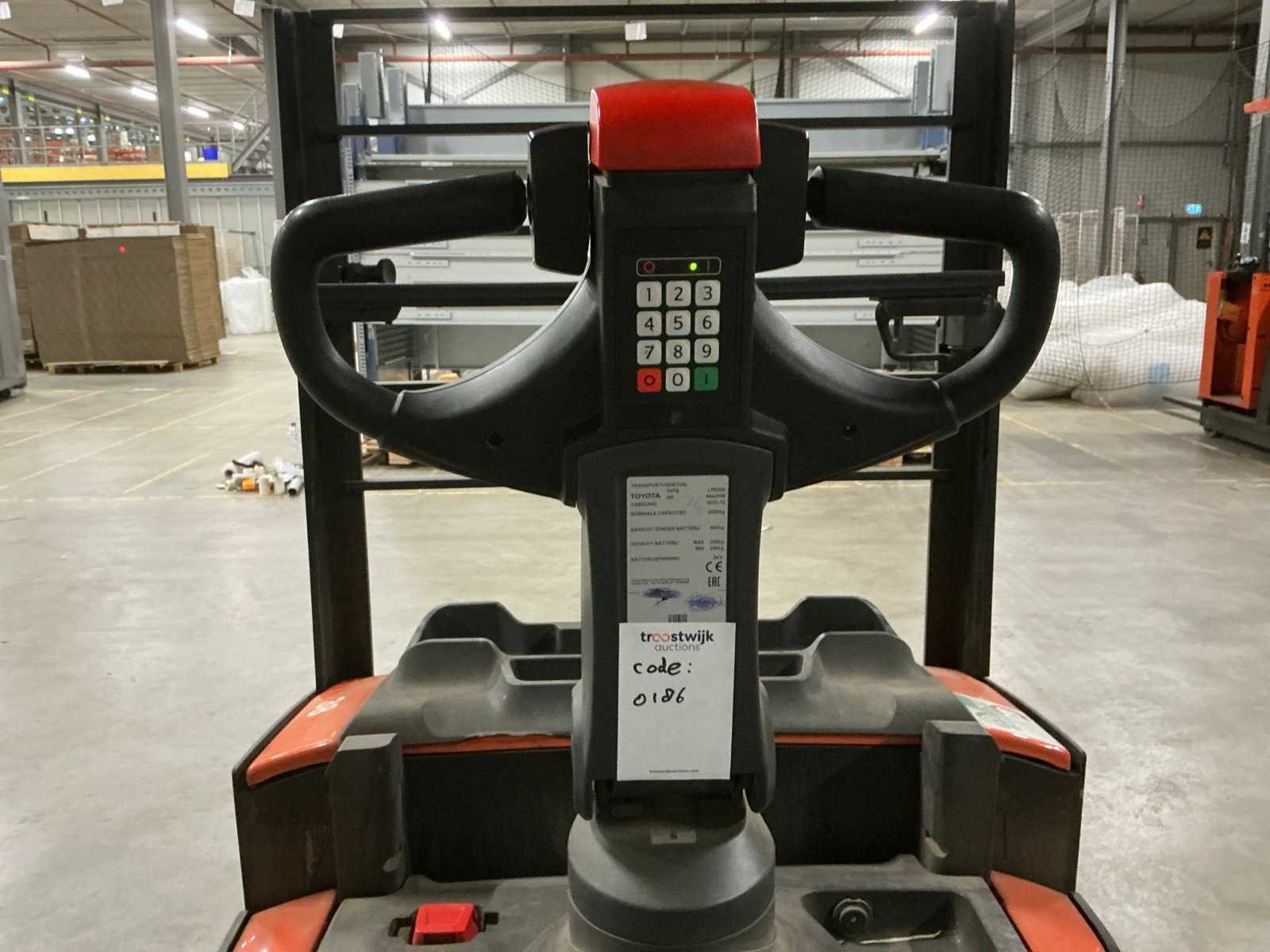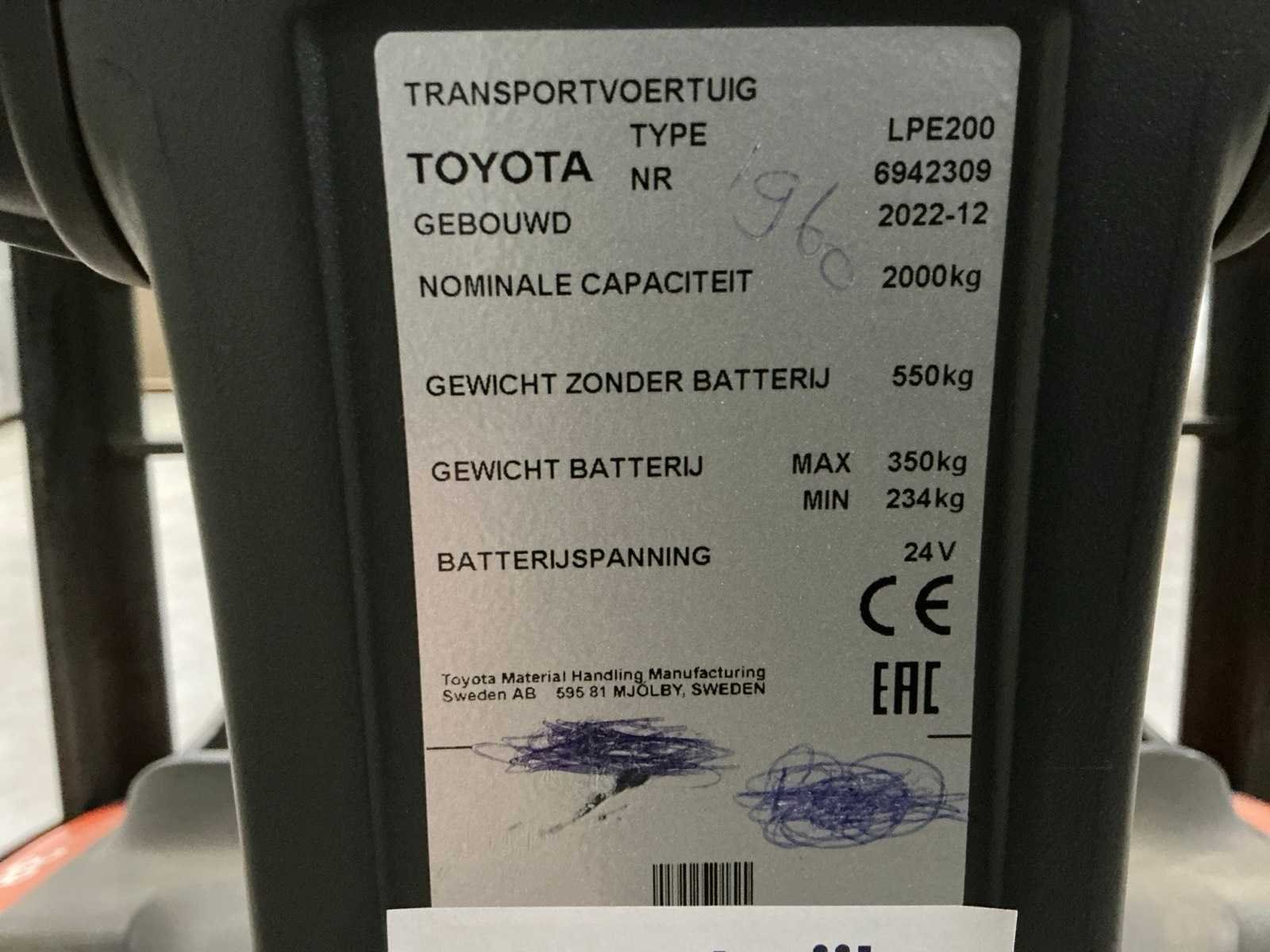 Merk: Toyota Type: LPE200 Bouwjaar: 2023 Serienummer: 6942309 Hefvermogen: 2000kg Lepellengte: 1590mm Meerij palletwagen: true Accu lader: true Afgelezen urenstand: 980 Eigen gewicht: 900kg Totale afmeting L: 2700mm Totale afmeting Breedte: 740mm Totale afmeting Hoogte: 1620mm