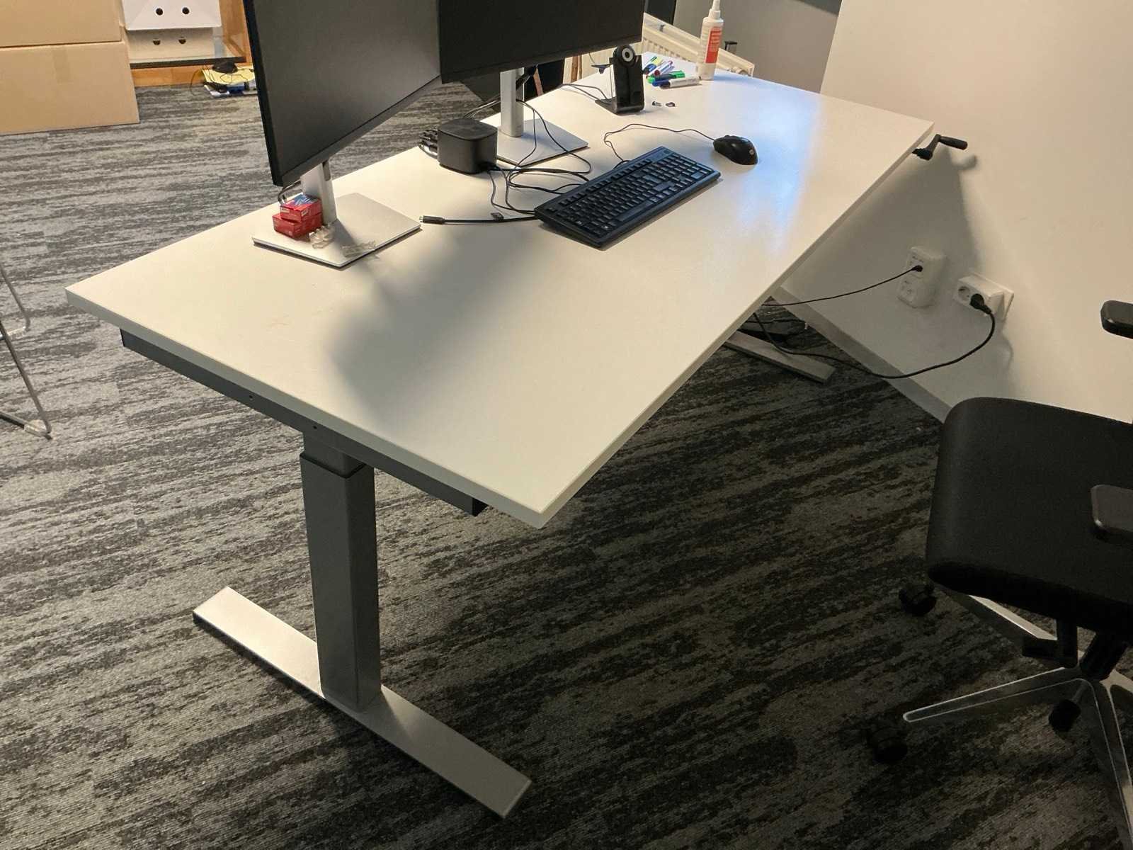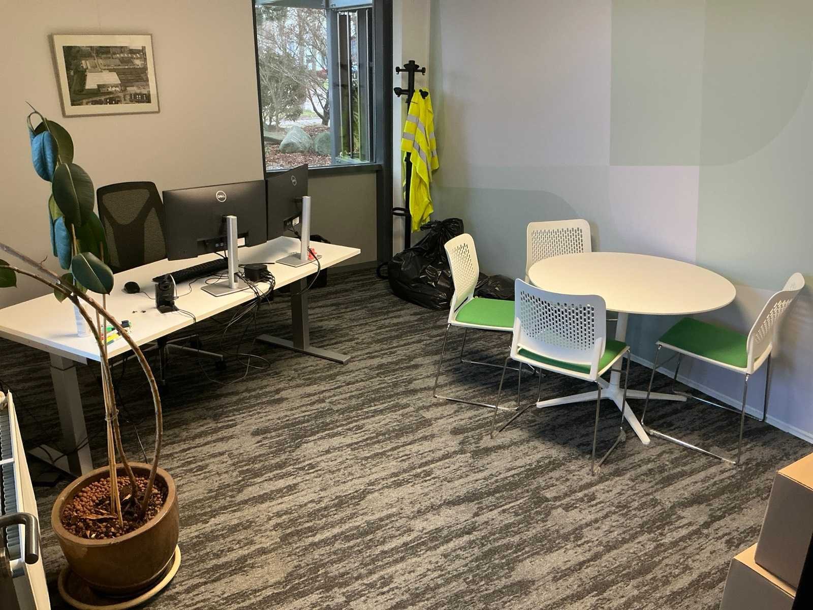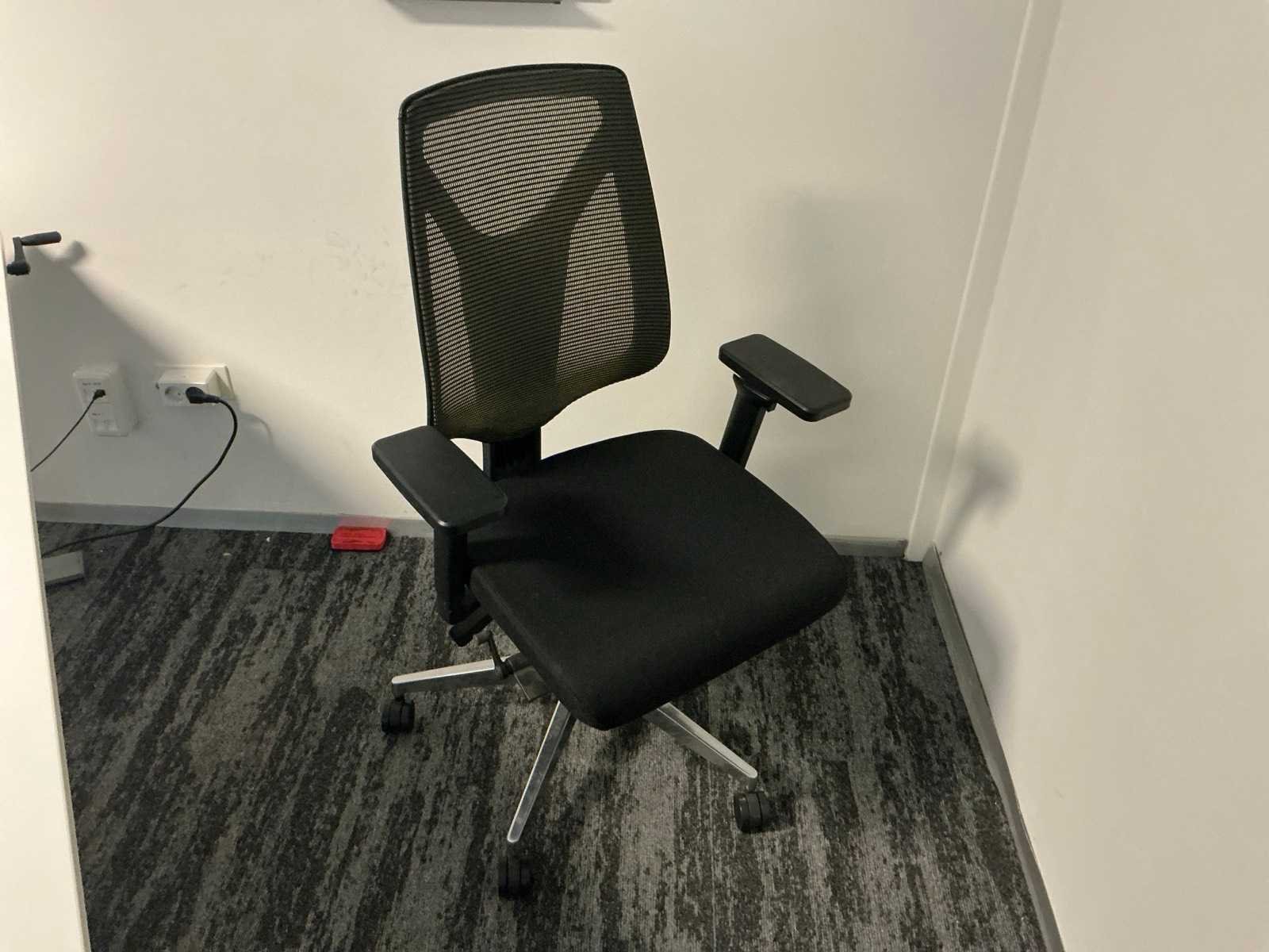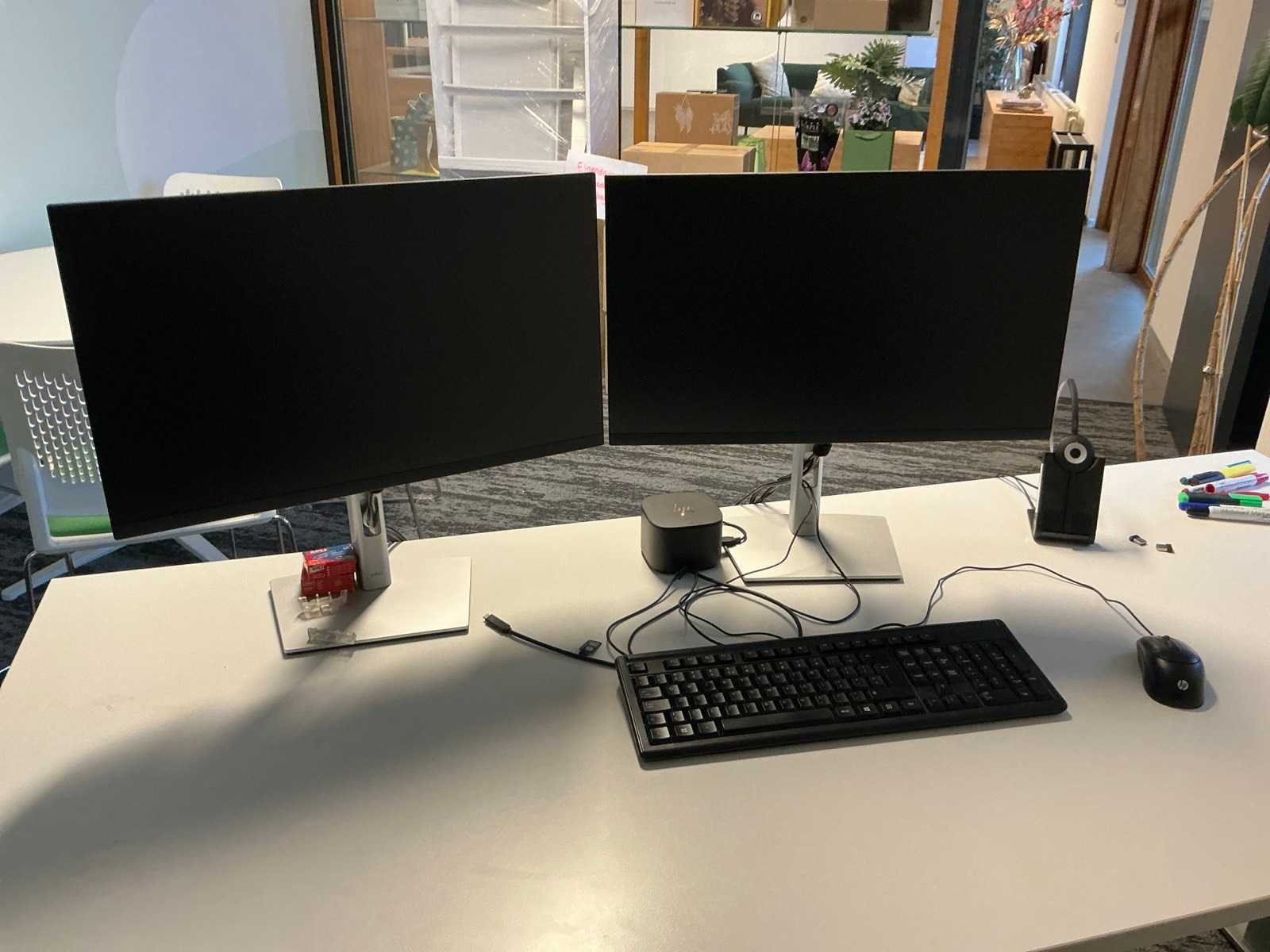 Bestaande uit: Vergadertafel (Ø 100x73 cm) met 4 vergaderstoelen, bureau in hoogte verstelbaar (180x80 cm), 2x Dell P2422HE monitor met HP Thunderbolt USB-C Dock, toetsenbord met muis, Jabra headset en wandgemonteerd whiteboard. Plant in pot niet inbegrepen.