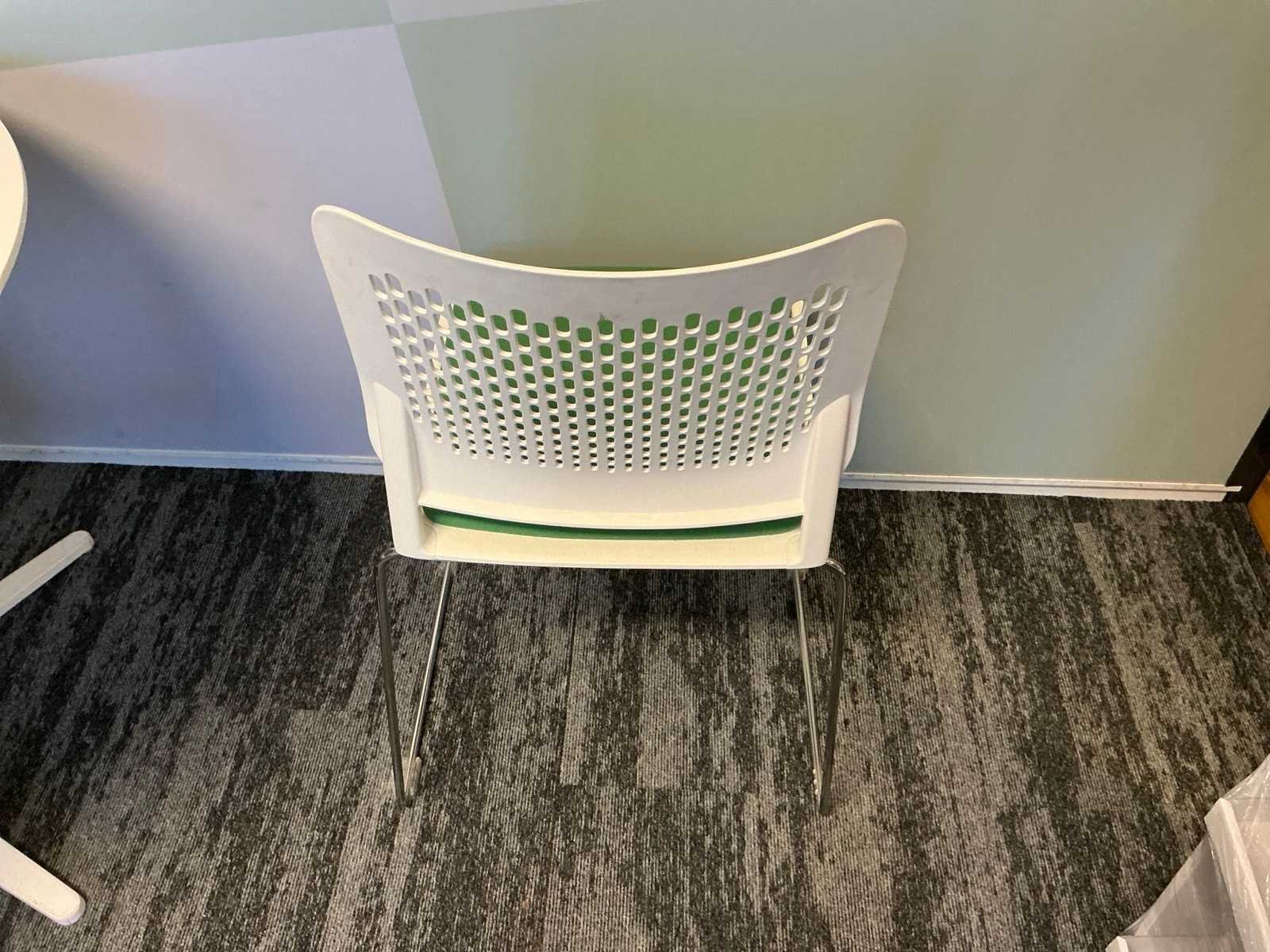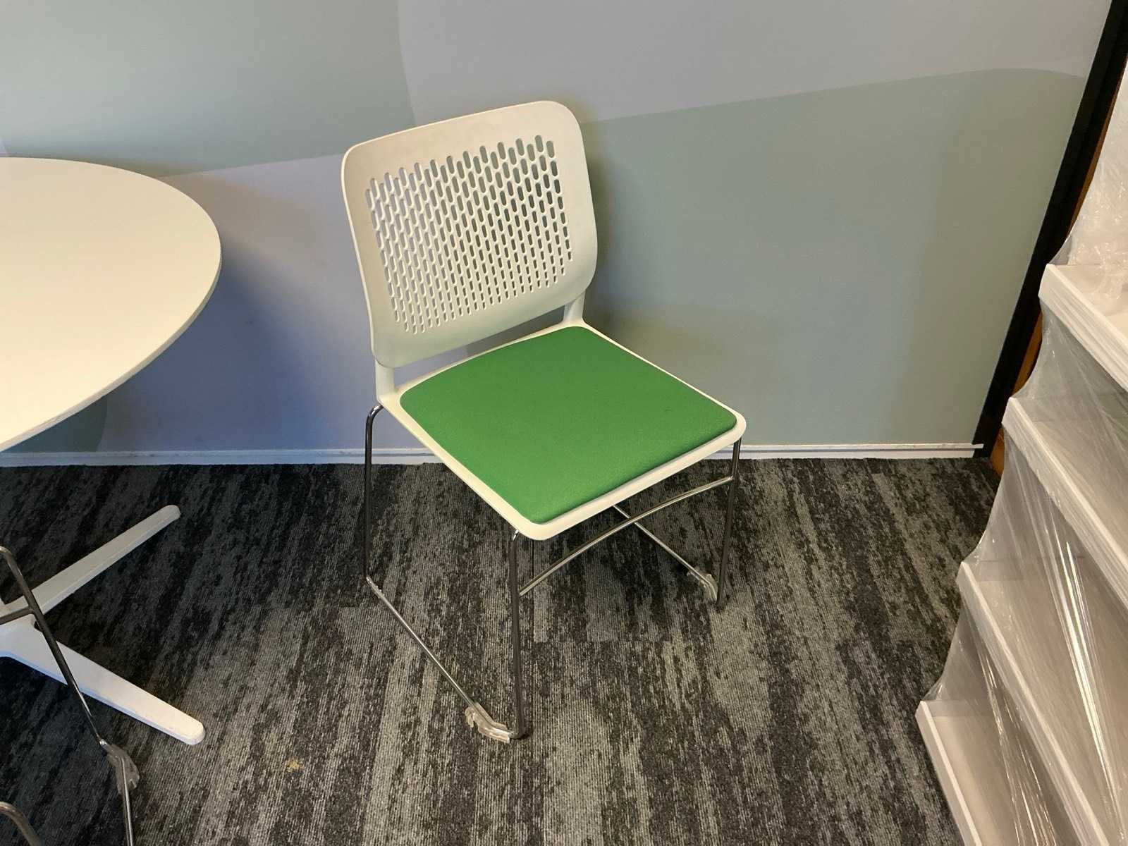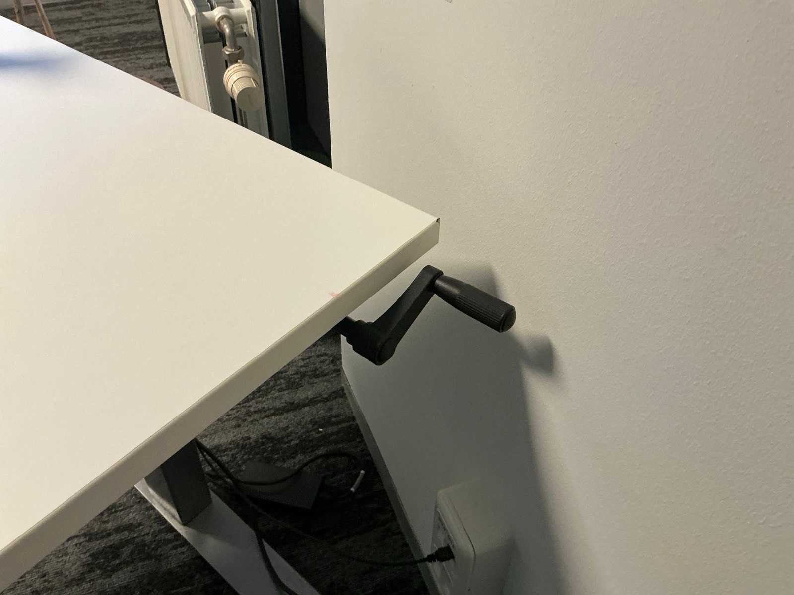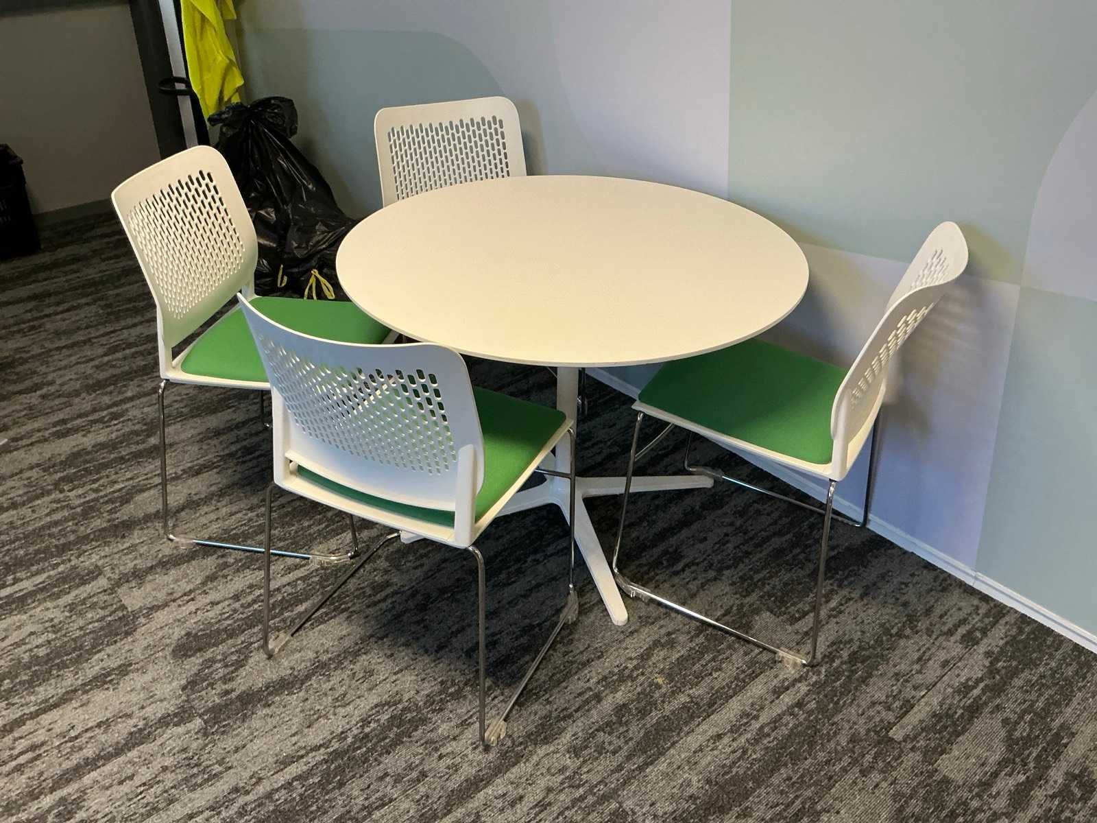 Bestaande uit: Vergadertafel (Ø 100x73 cm) met 4 vergaderstoelen, bureau in hoogte verstelbaar (180x80 cm), 2x Dell P2422HE monitor met HP Thunderbolt USB-C Dock, toetsenbord met muis, Jabra headset en wandgemonteerd whiteboard. Plant in pot niet inbegrepen.