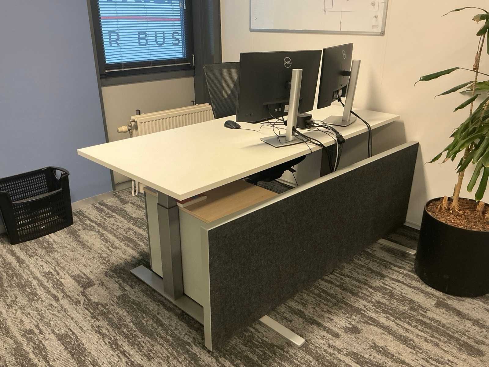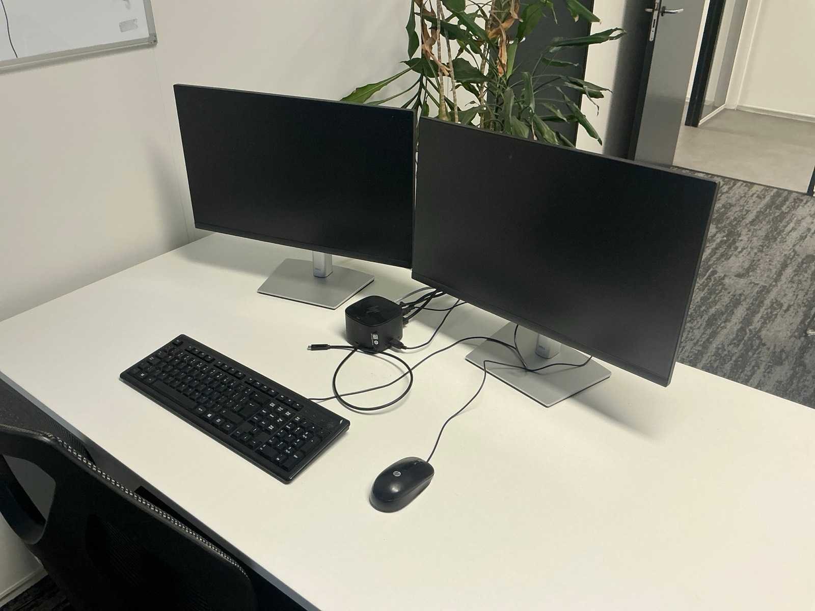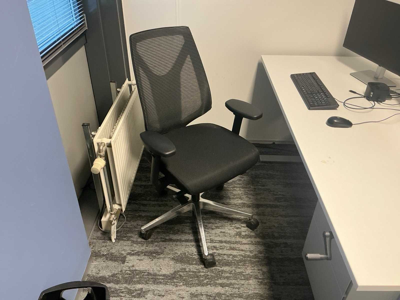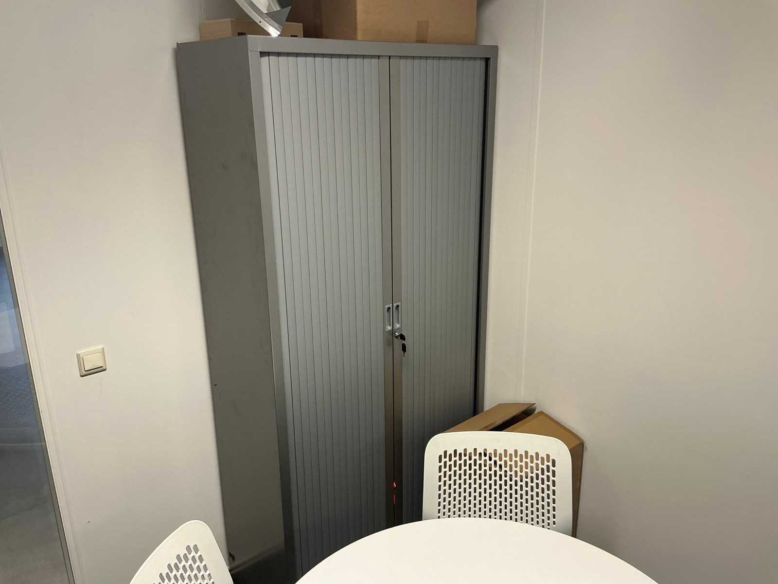 Bestaande uit: Vergadertafel (Ø 100x73 cm) met 4 vergaderstoelen, bureau in hoogte verstelbaar (180x80 cm), roldeurkast (100x43x198 cm), 1x bureaustoel, 2x Dell P2422HE monitor met HP Thunderbolt USB-C Dock, toetsenbord met muis, kapstok, afvalemmer en wandgemonteerd whiteboard. Plant in pot niet inbegrepen.