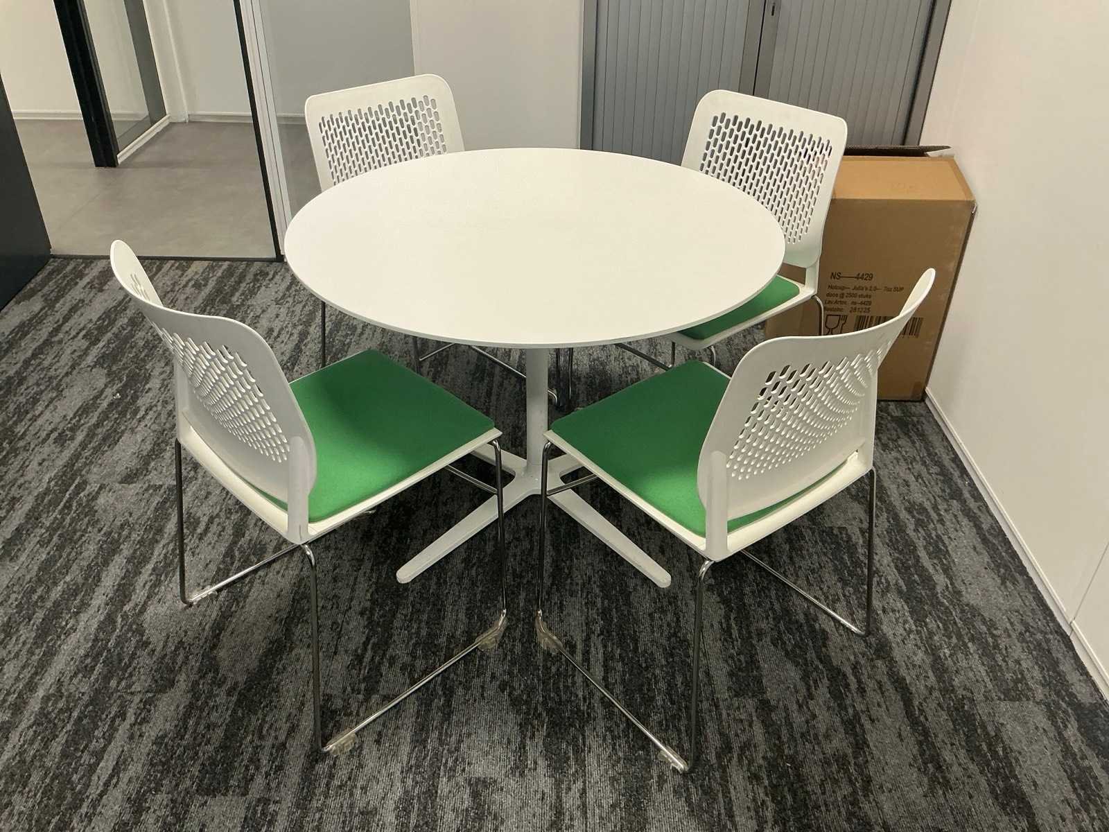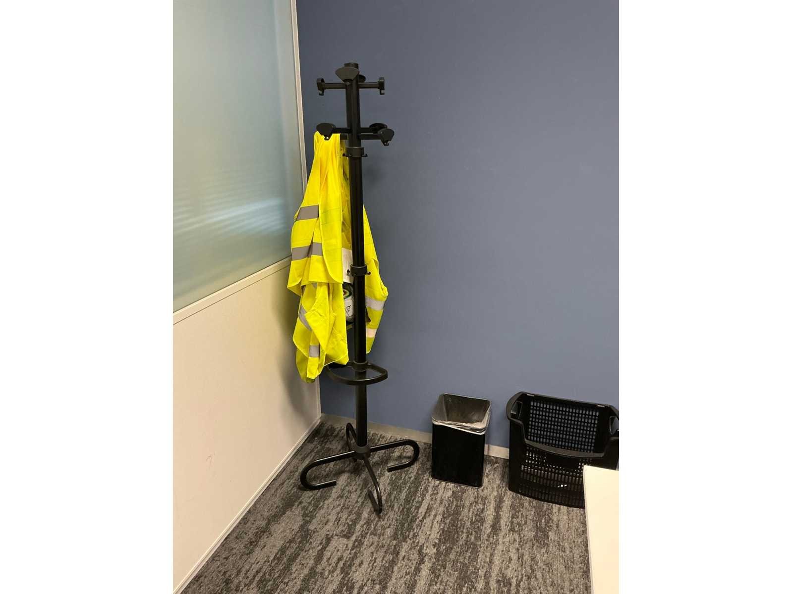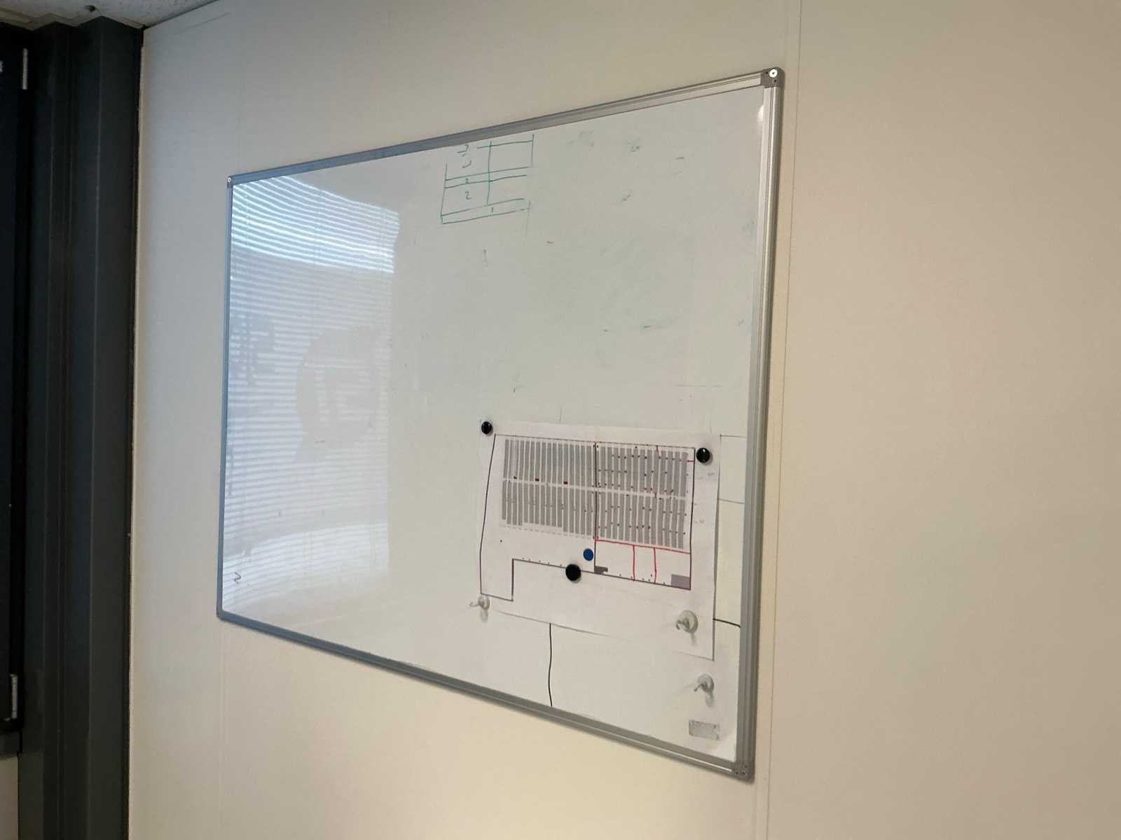 Bestaande uit: Vergadertafel (Ø 100x73 cm) met 4 vergaderstoelen, bureau in hoogte verstelbaar (180x80 cm), roldeurkast (100x43x198 cm), 1x bureaustoel, 2x Dell P2422HE monitor met HP Thunderbolt USB-C Dock, toetsenbord met muis, kapstok, afvalemmer en wandgemonteerd whiteboard. Plant in pot niet inbegrepen.