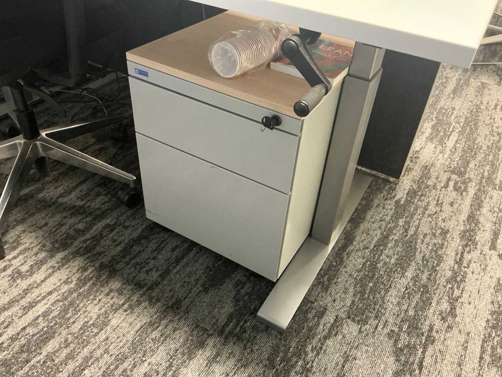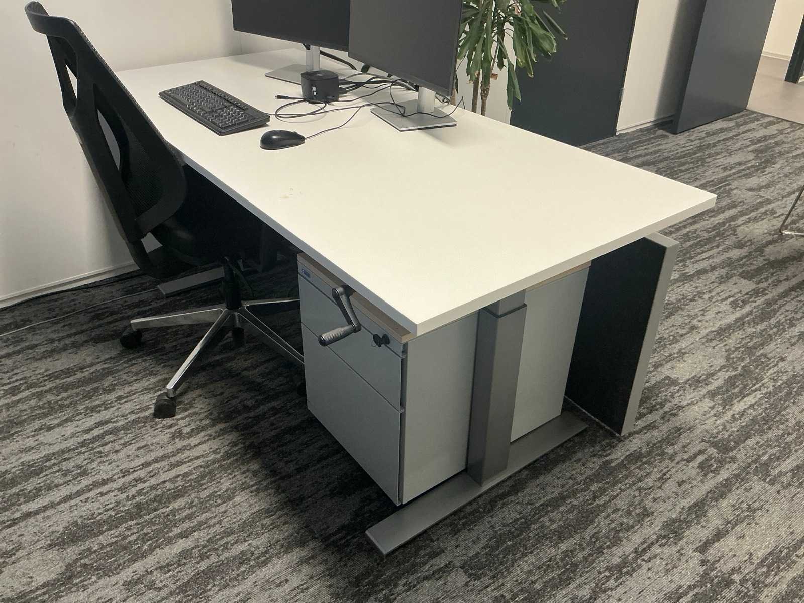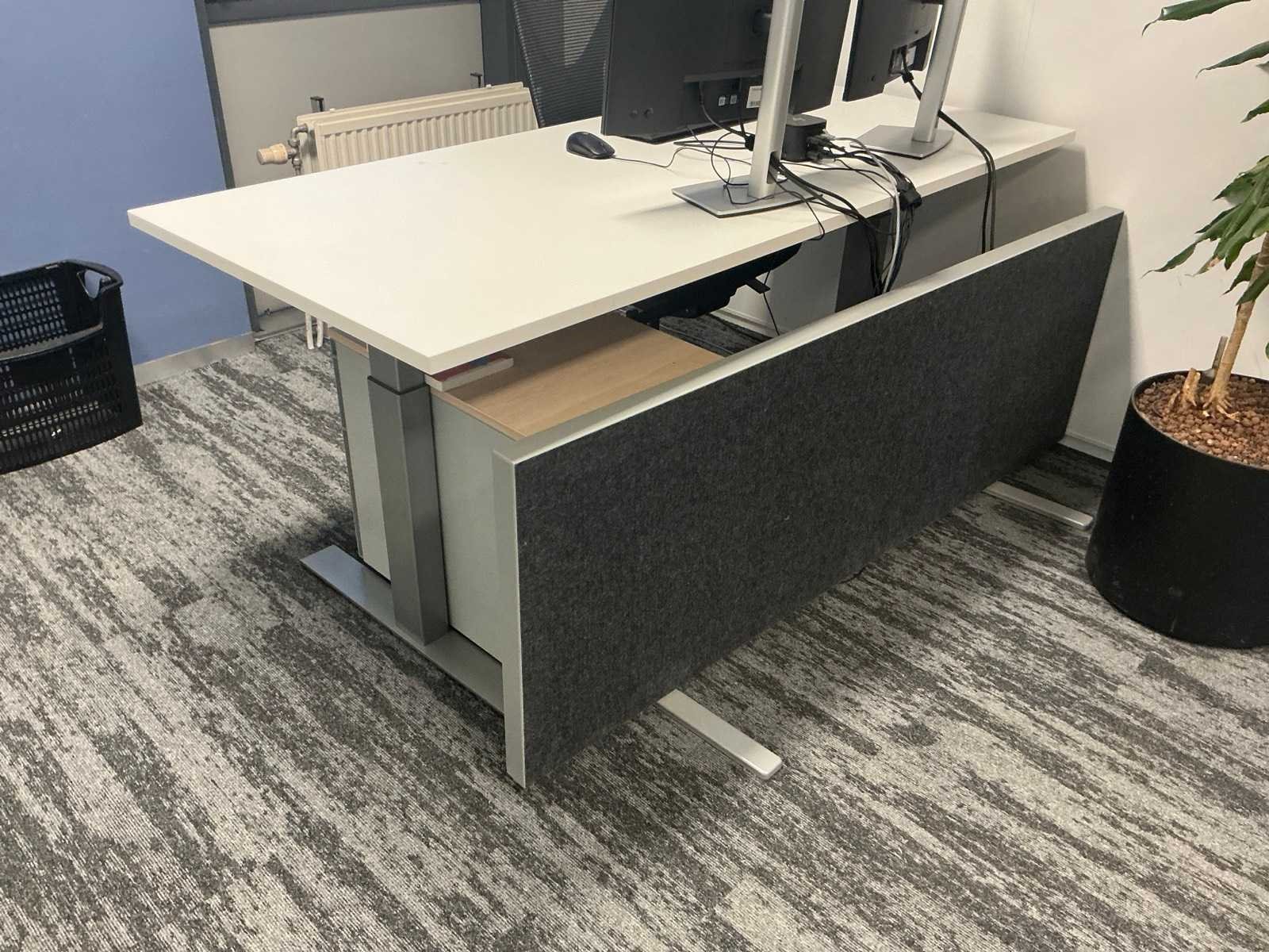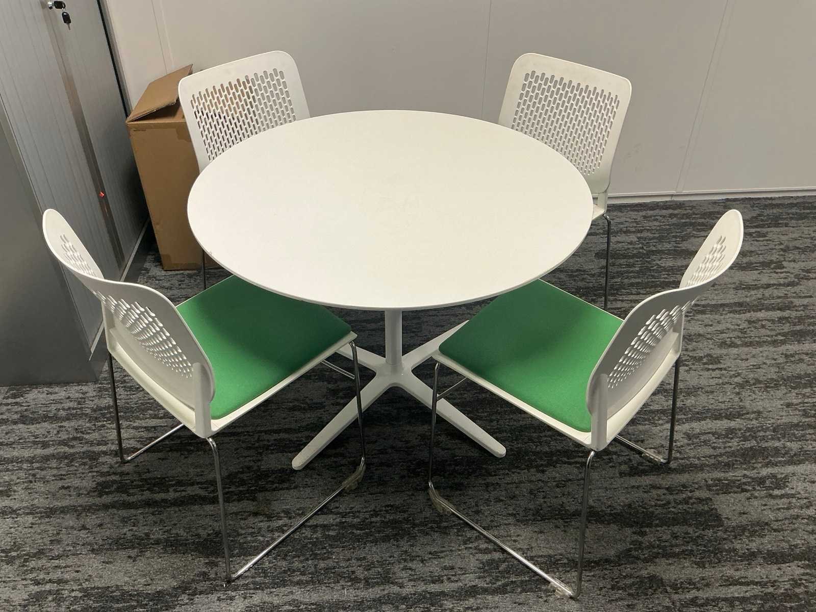 Bestaande uit: Vergadertafel (Ø 100x73 cm) met 4 vergaderstoelen, bureau in hoogte verstelbaar (180x80 cm), roldeurkast (100x43x198 cm), 1x bureaustoel, 2x Dell P2422HE monitor met HP Thunderbolt USB-C Dock, toetsenbord met muis, kapstok, afvalemmer en wandgemonteerd whiteboard. Plant in pot niet inbegrepen.