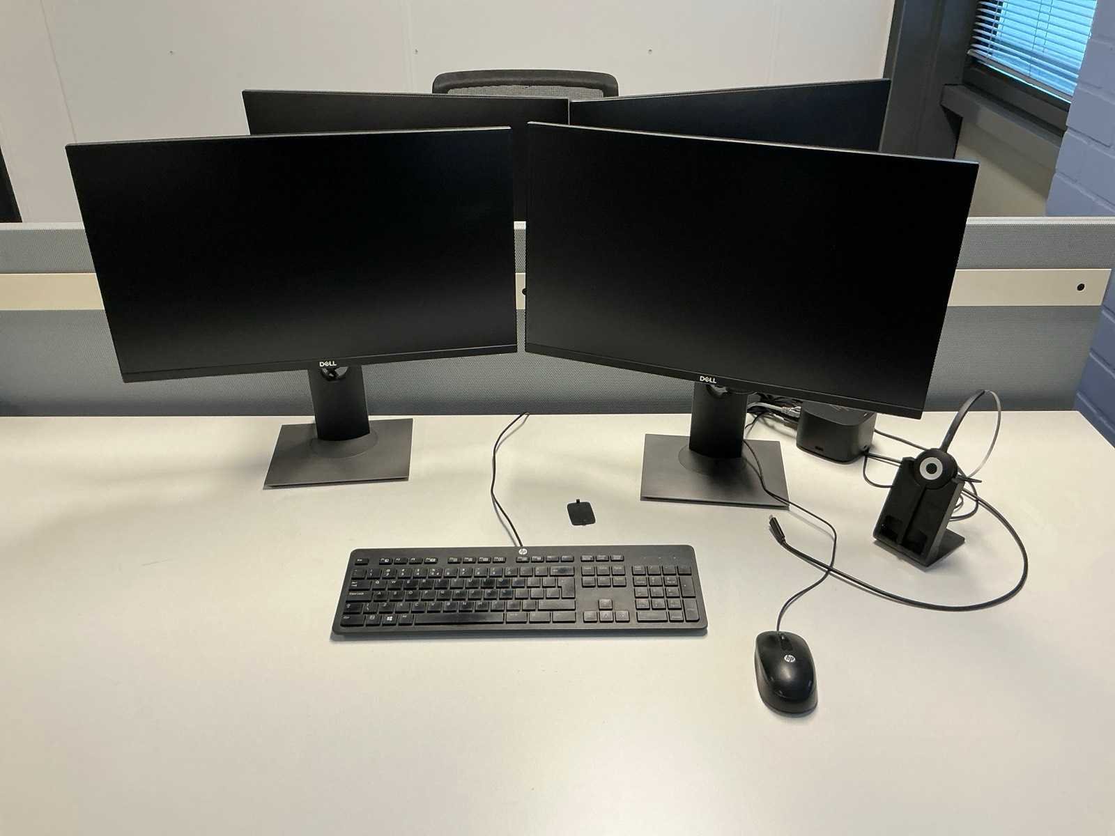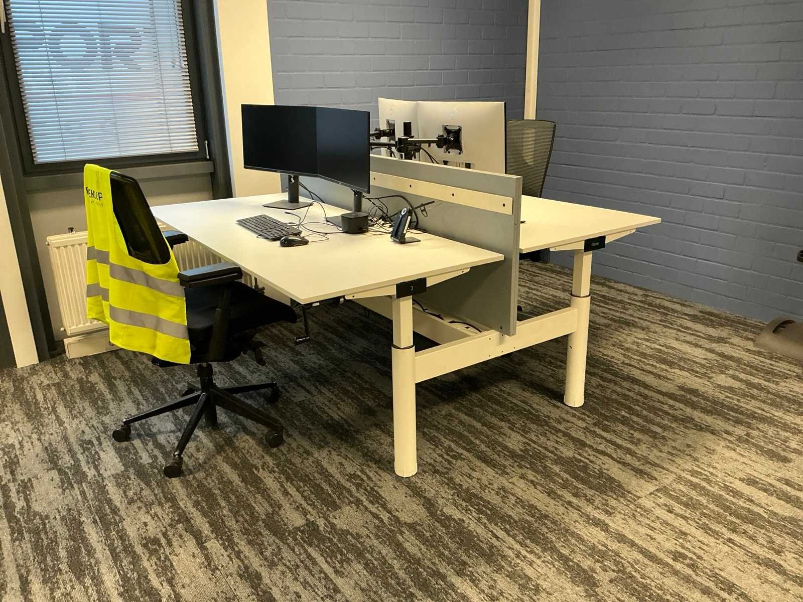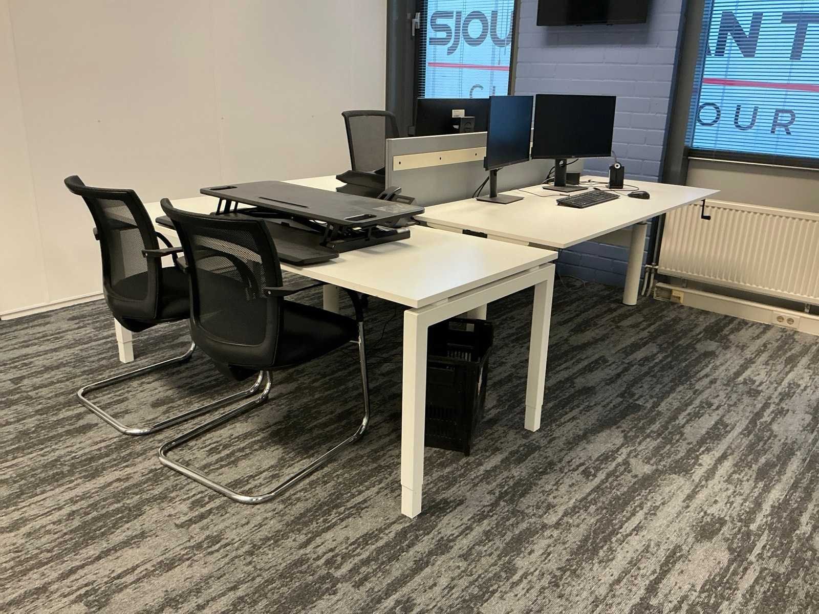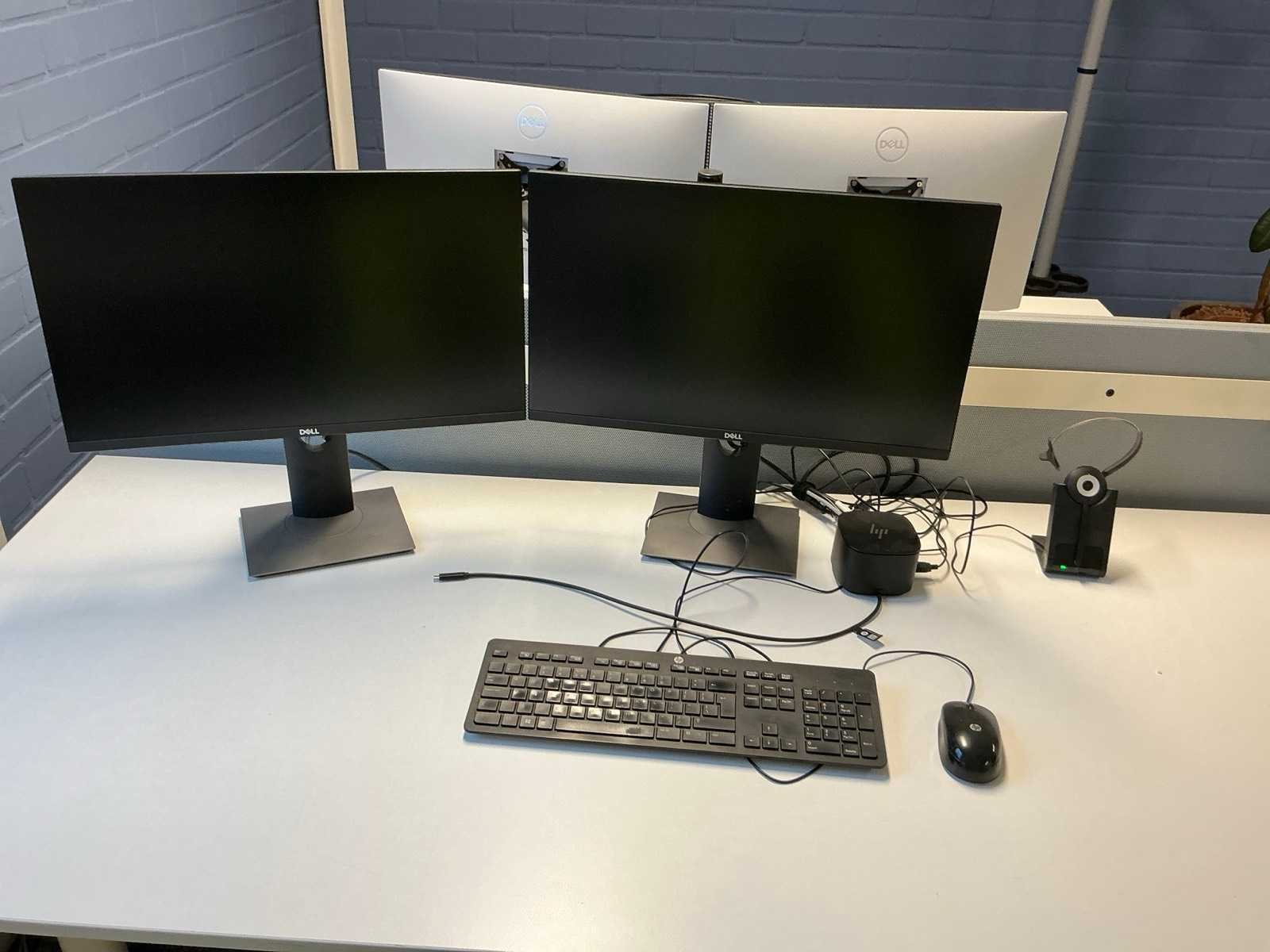 Bestaande uit: 2x Gispen duo-bureau in hoogte verstelbaar (180x80 cm), 1x bureautafel (180x80x70 cm) roldeurkast (120x40x190 cm), 3x bureaustoel, 2x vergaderstoel, 8x Dell monitor, 4x HP Thunderbolt USB-C dock met toetsenbord en muis, 2x Jabra headset. wandgemonteerde televisie en kapstok. Plant in pot niet inbegrepen.