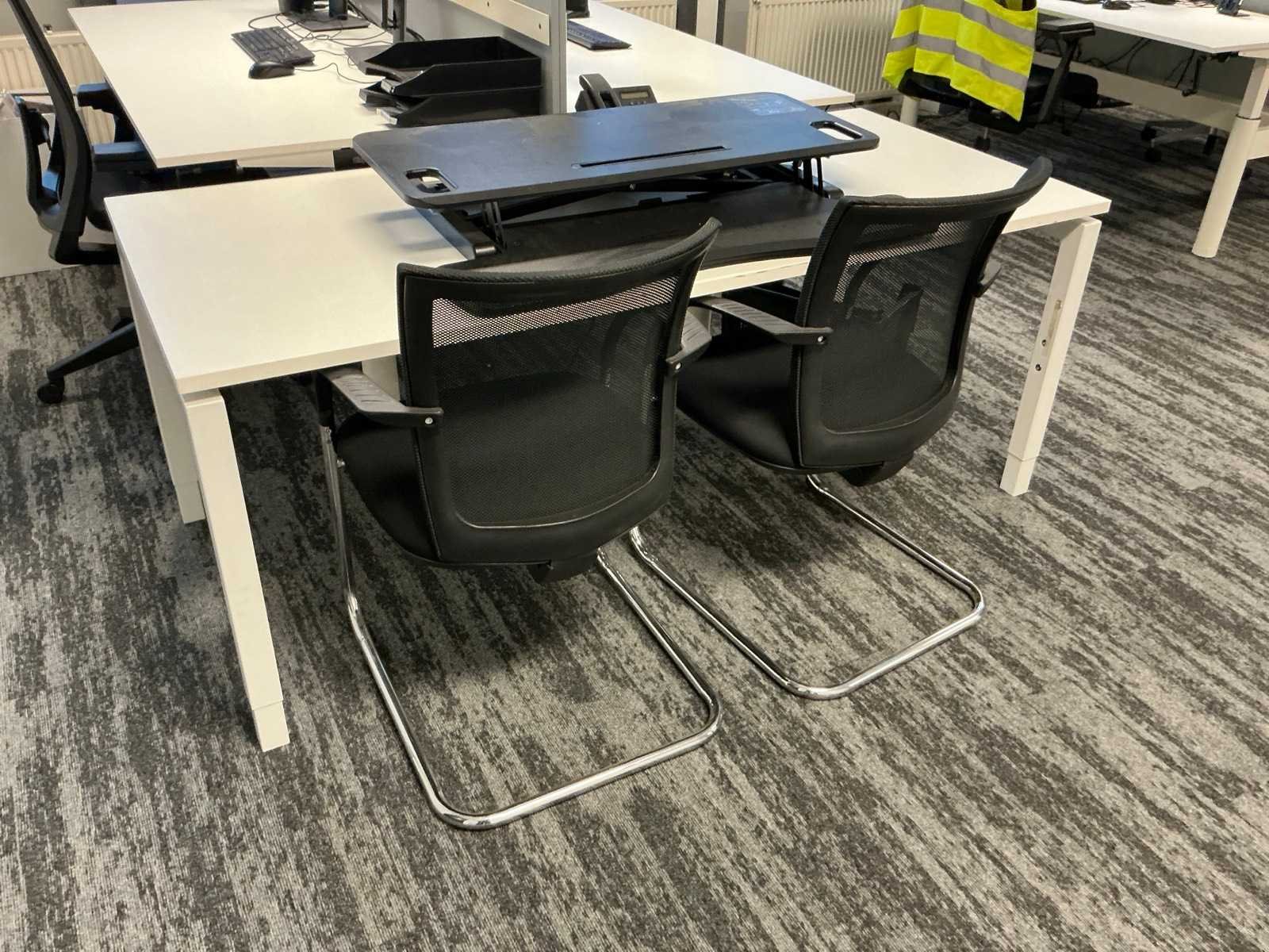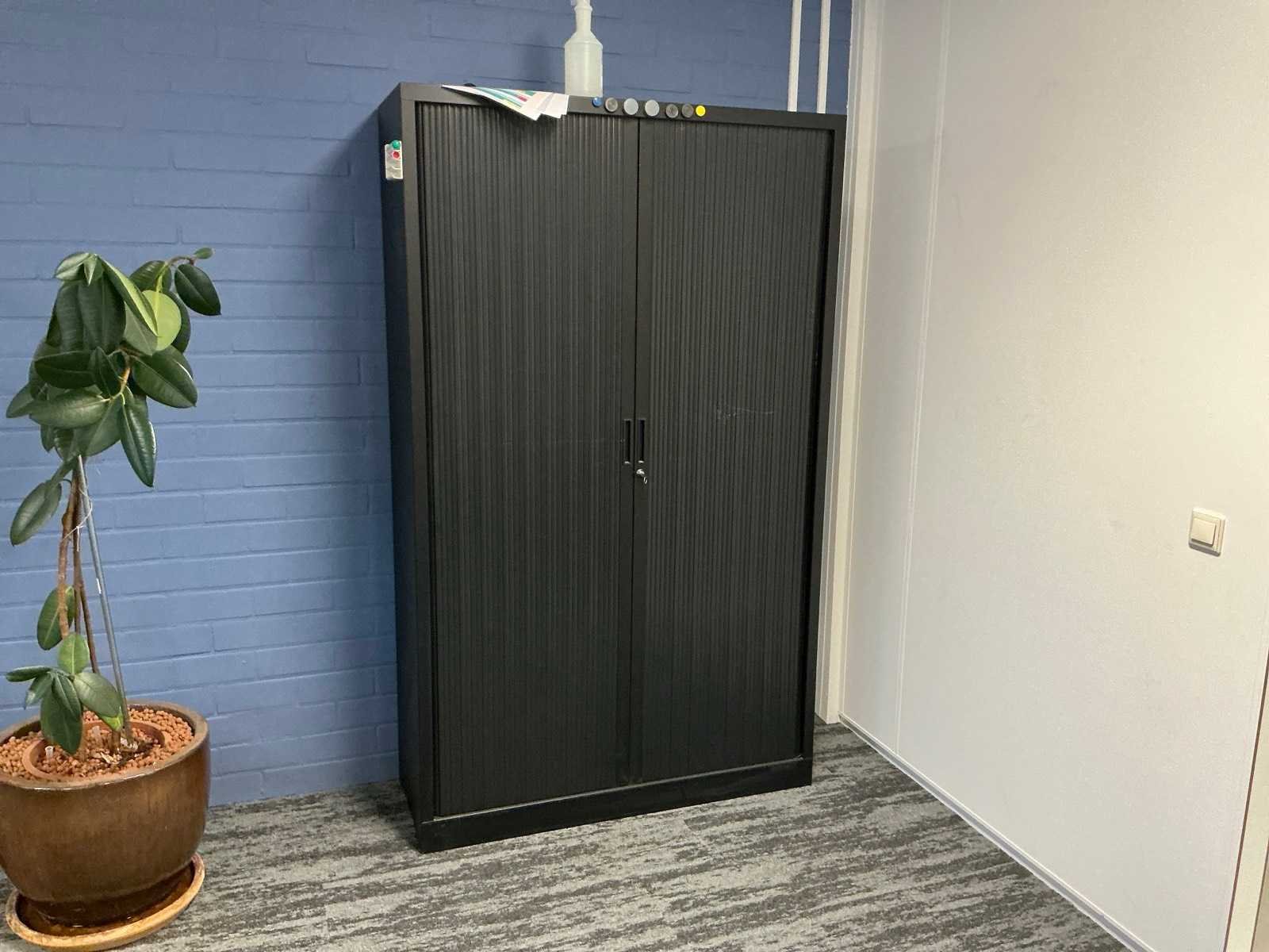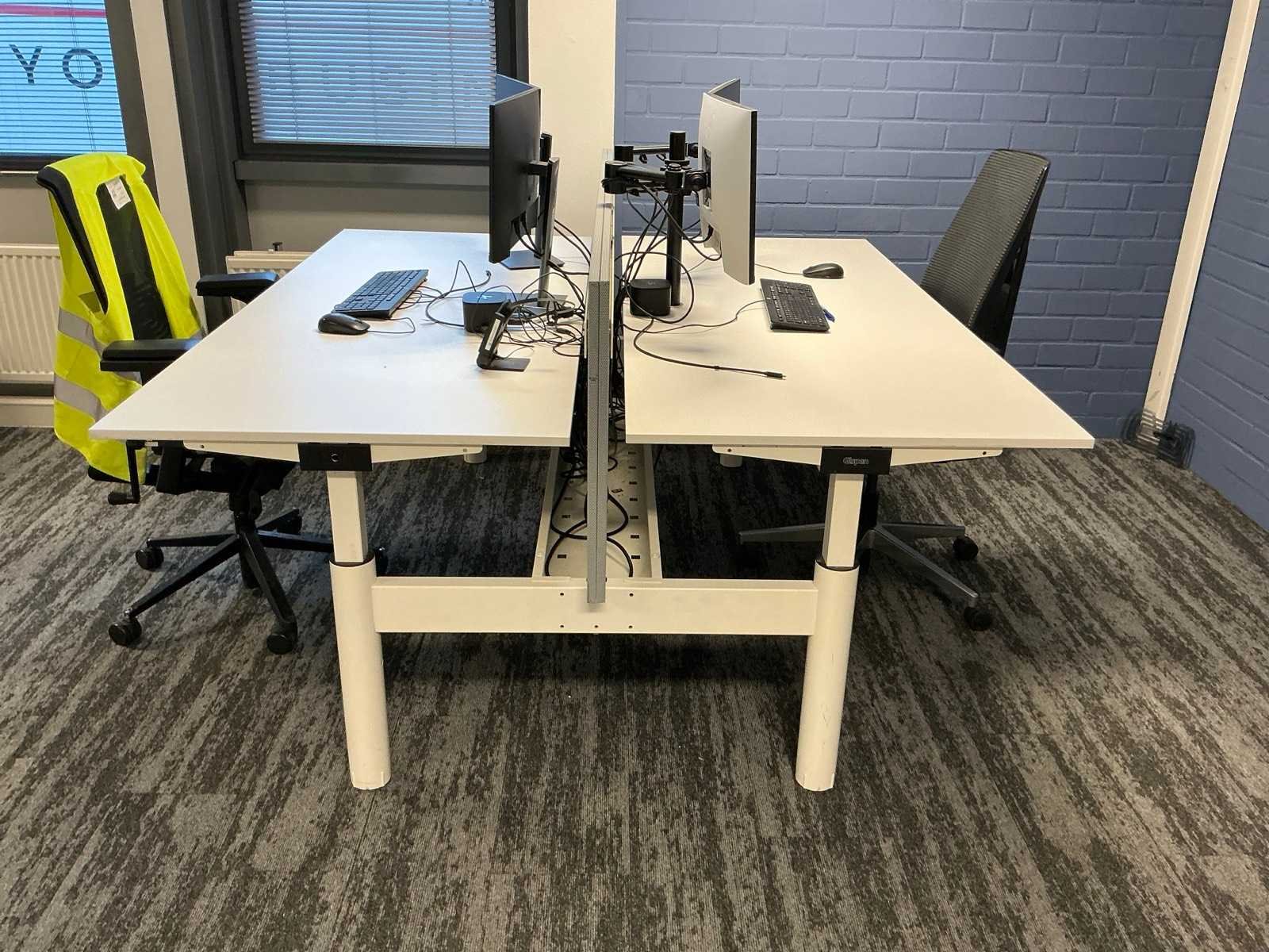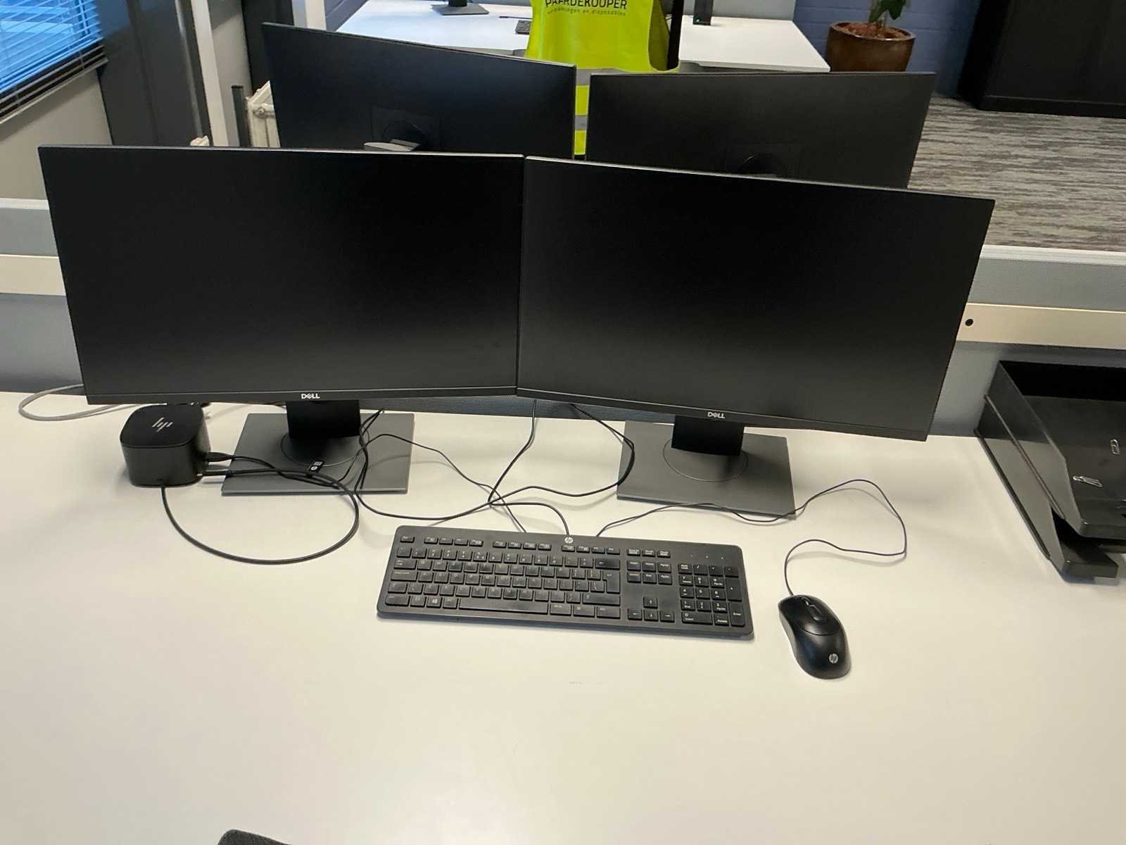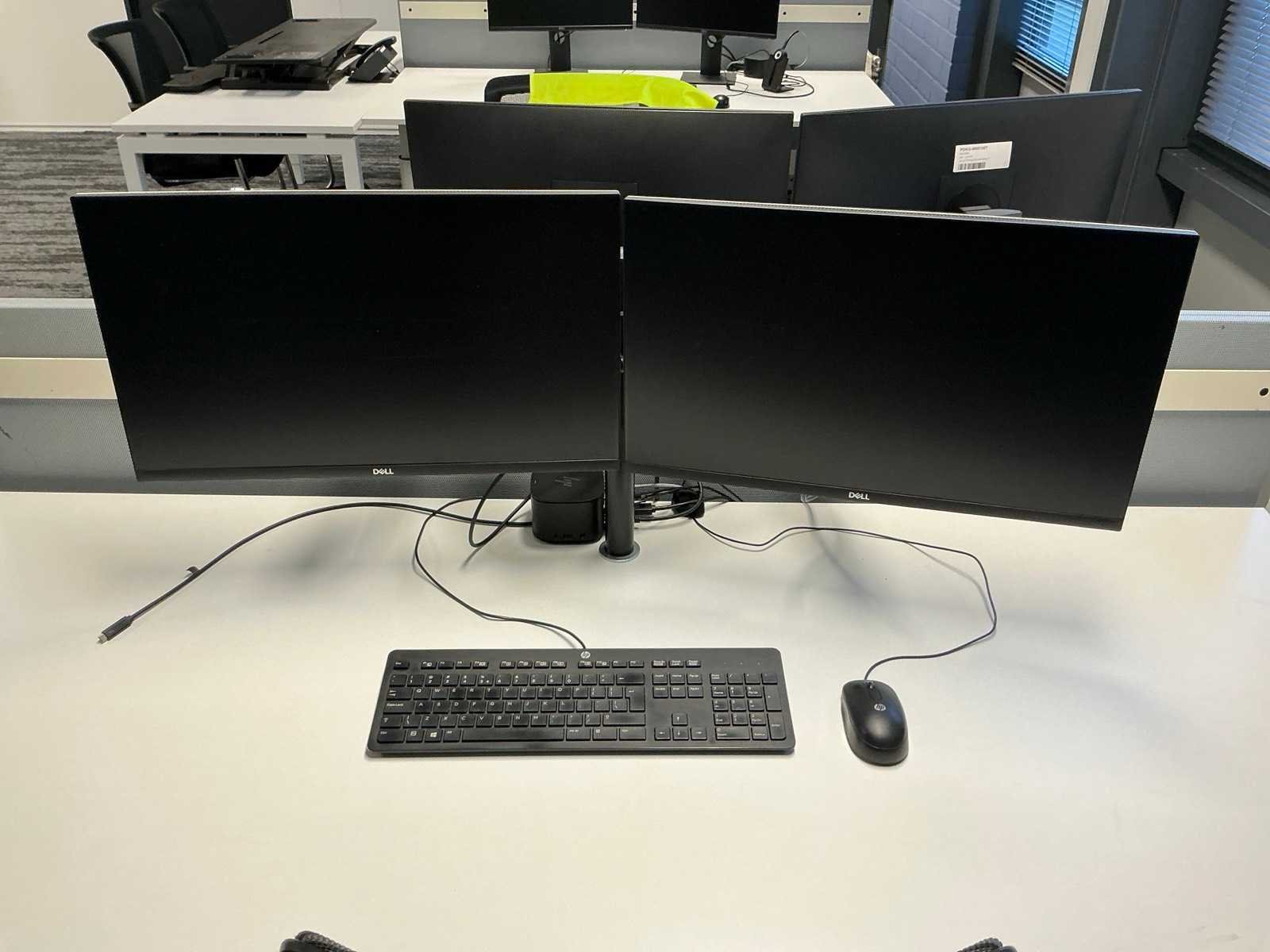 Bestaande uit: 2x Gispen duo-bureau in hoogte verstelbaar (180x80 cm), 1x bureautafel (180x80x70 cm) roldeurkast (120x40x190 cm), 3x bureaustoel, 2x vergaderstoel, 8x Dell monitor, 4x HP Thunderbolt USB-C dock met toetsenbord en muis, 2x Jabra headset. wandgemonteerde televisie en kapstok. Plant in pot niet inbegrepen.
