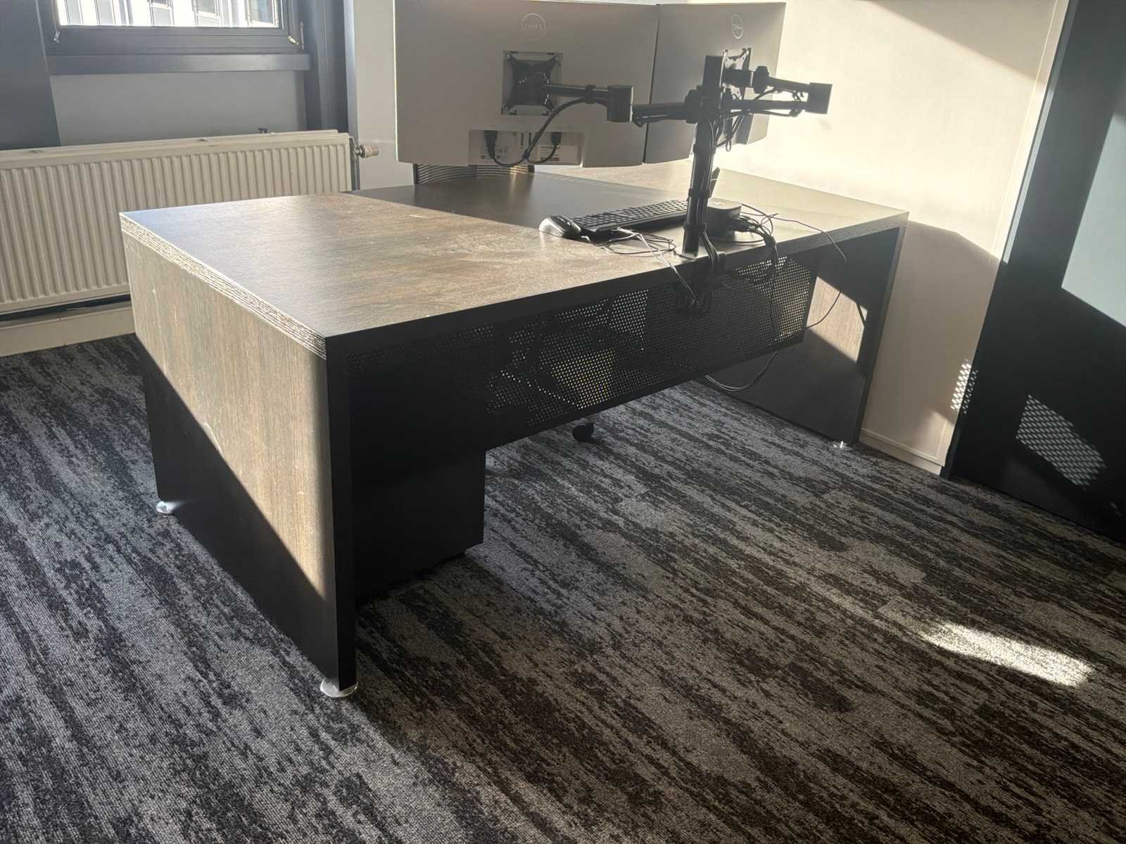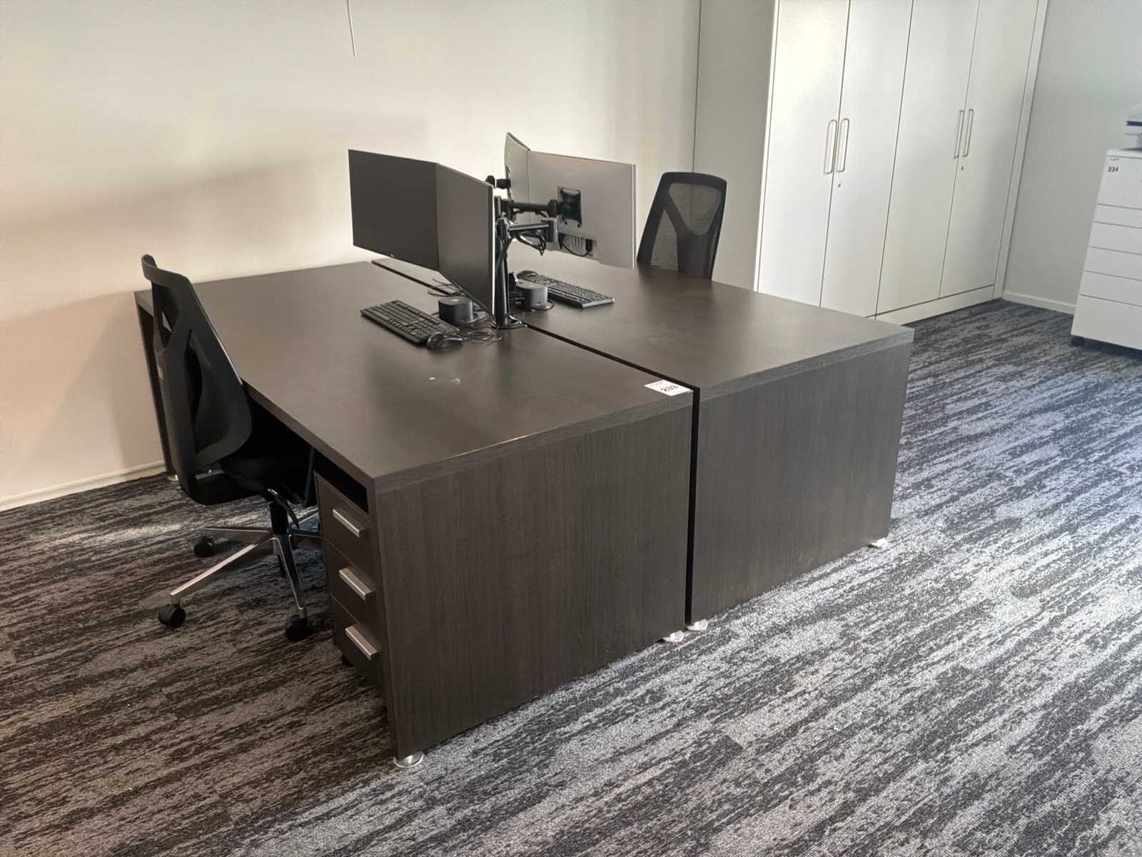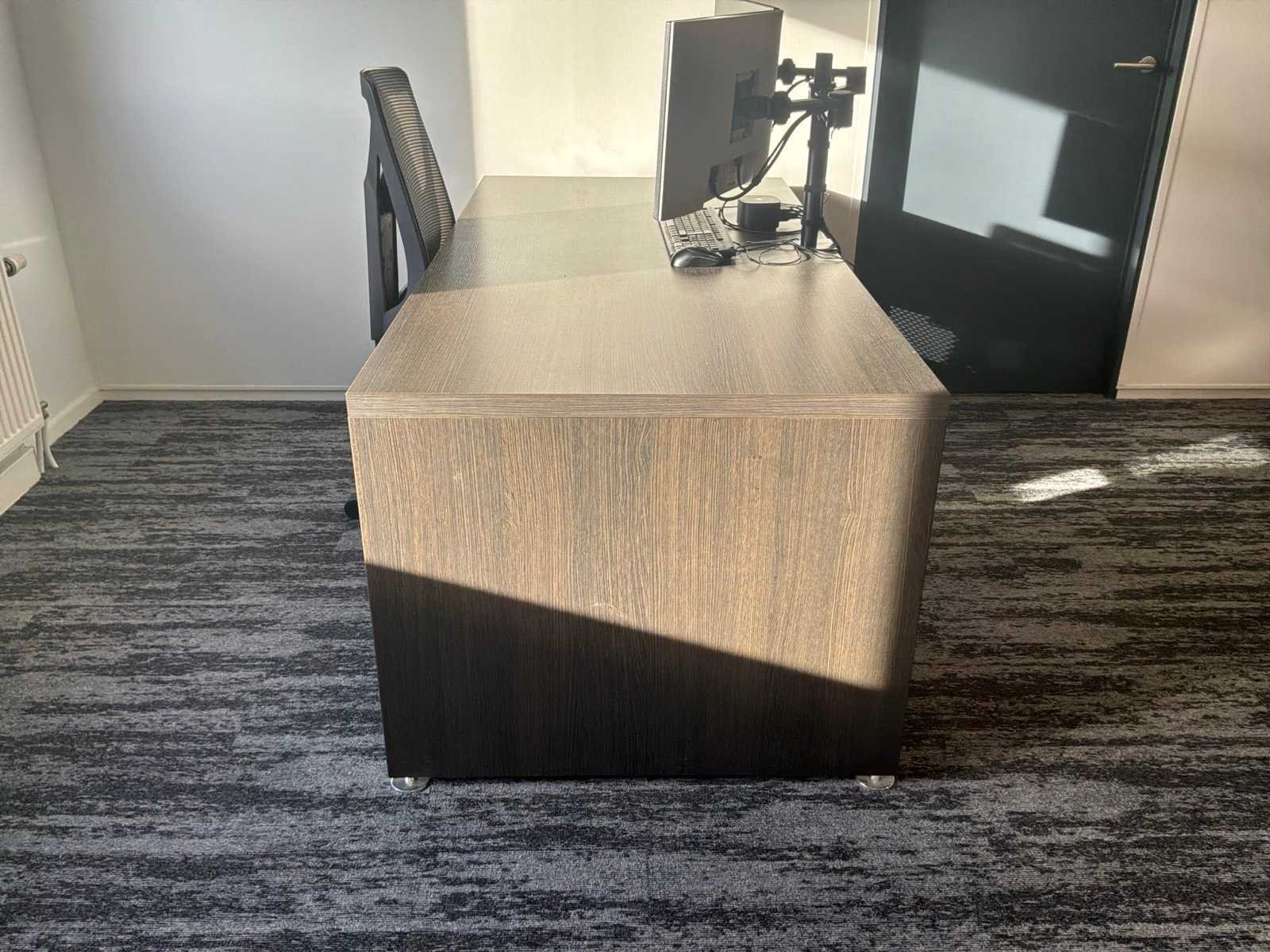 Bestaande uit : 3x bureau (2x 200x90x75 cm, 1x 80x90x75 cm), 3x bureaukast (60x45x60 cm), 3x bureaustoel in hoogte verstelbaar, 1x opbergkast (93x50x120 cm). Monitoren, dockingstations ,toetsenbord en muis niet inbegrepen.