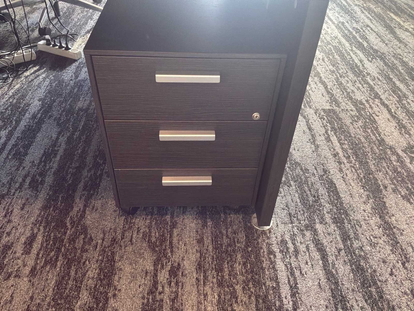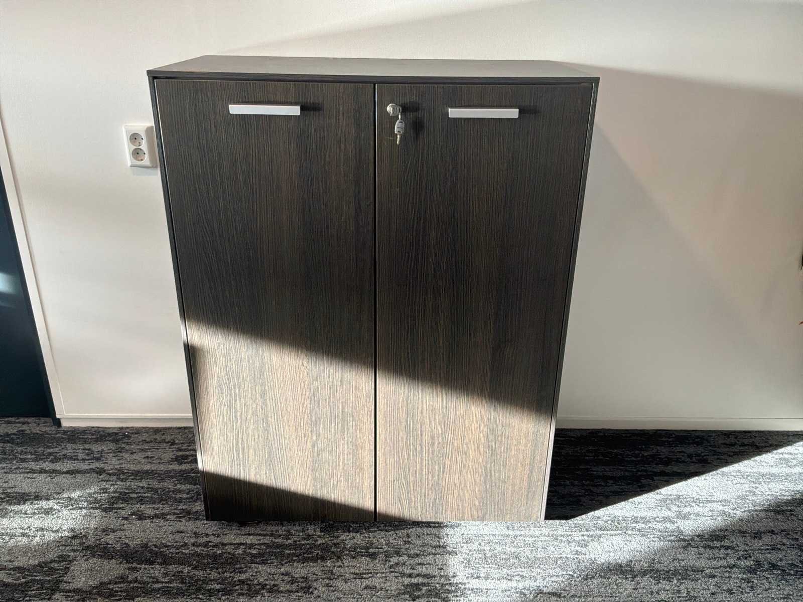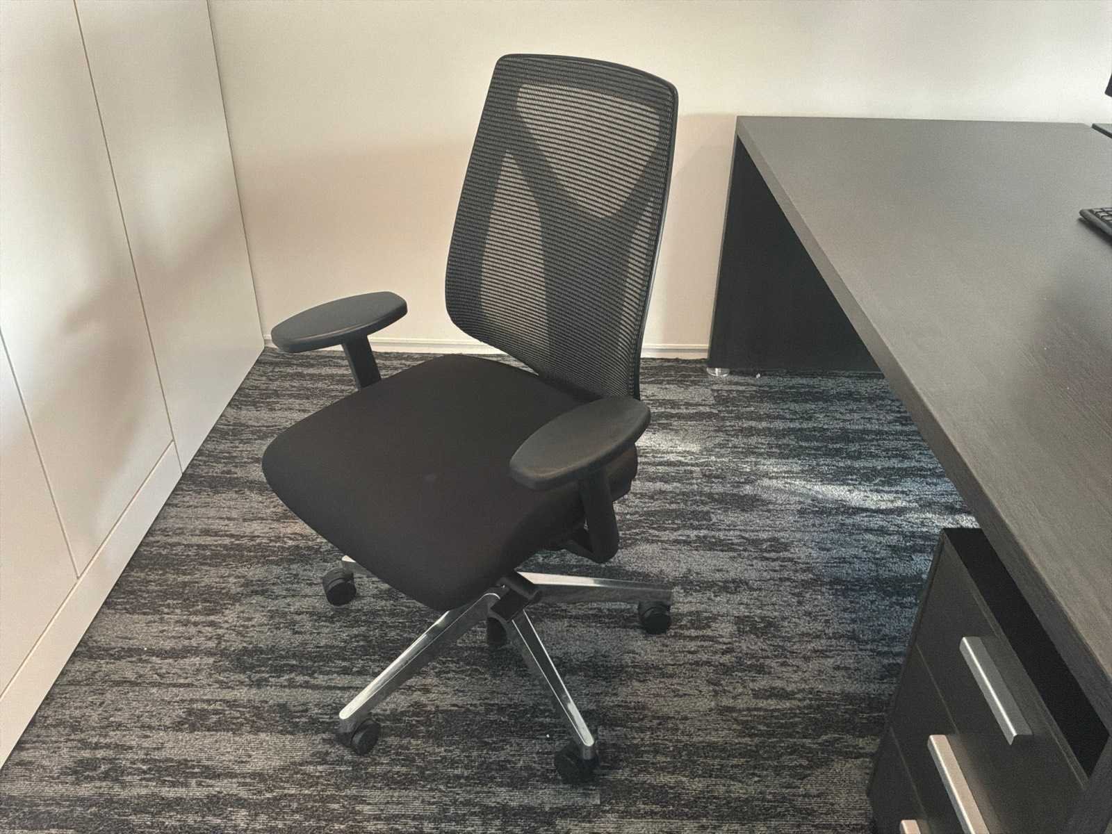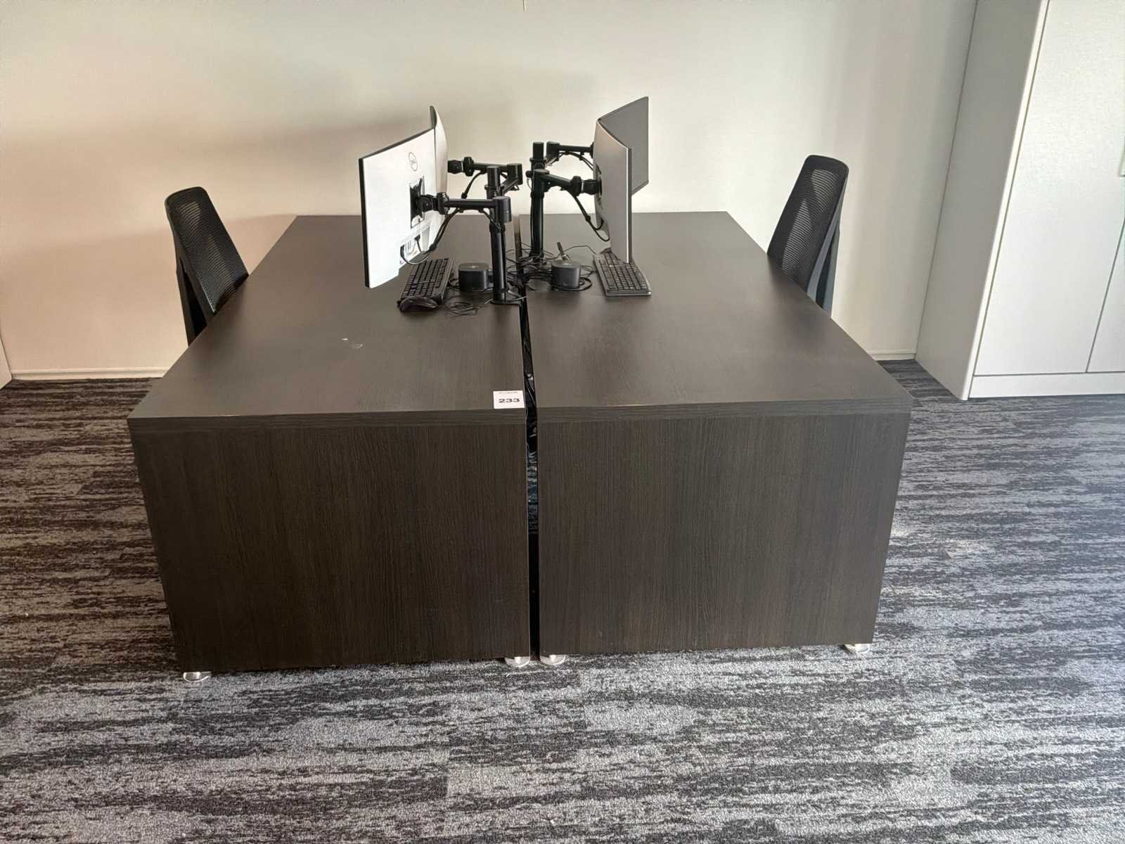 Bestaande uit : 3x bureau (2x 200x90x75 cm, 1x 80x90x75 cm), 3x bureaukast (60x45x60 cm), 3x bureaustoel in hoogte verstelbaar, 1x opbergkast (93x50x120 cm). Monitoren, dockingstations ,toetsenbord en muis niet inbegrepen.