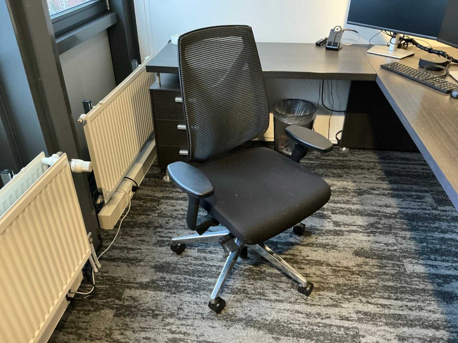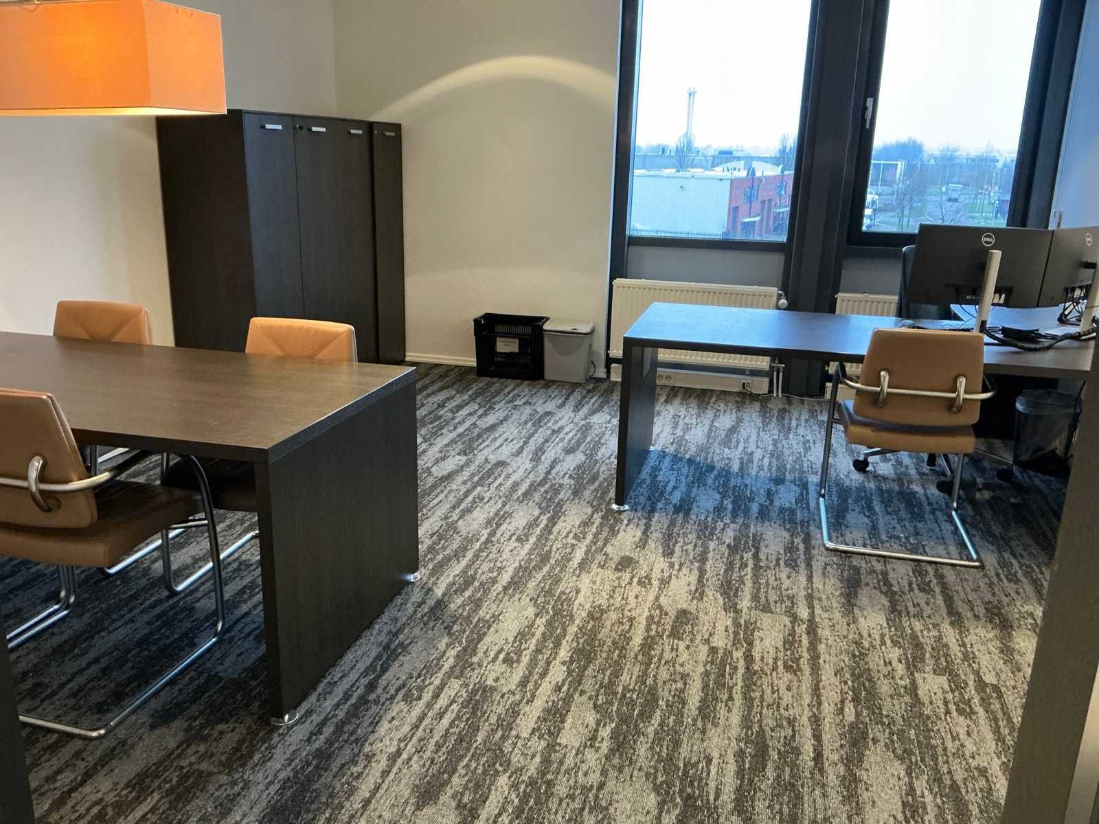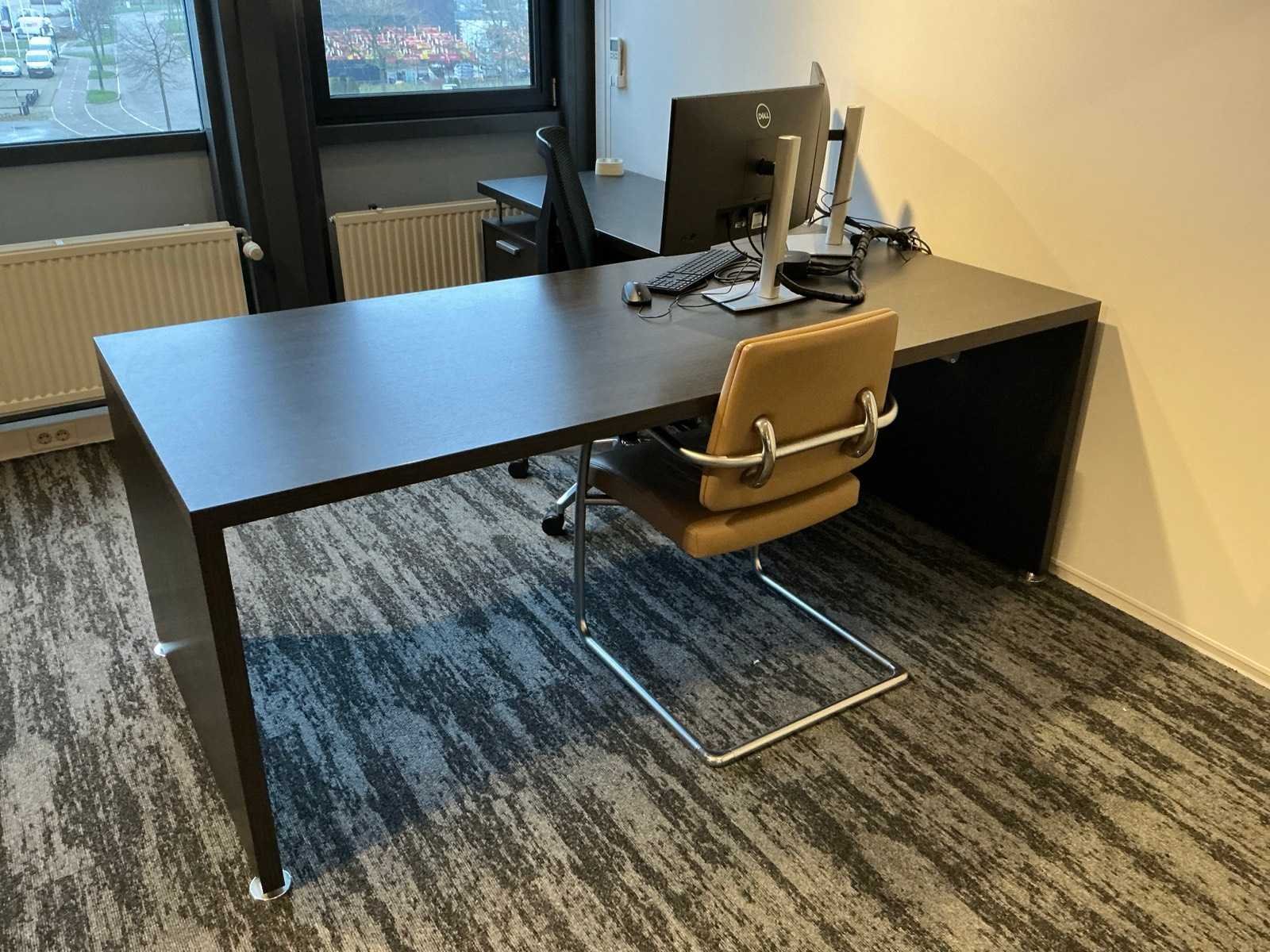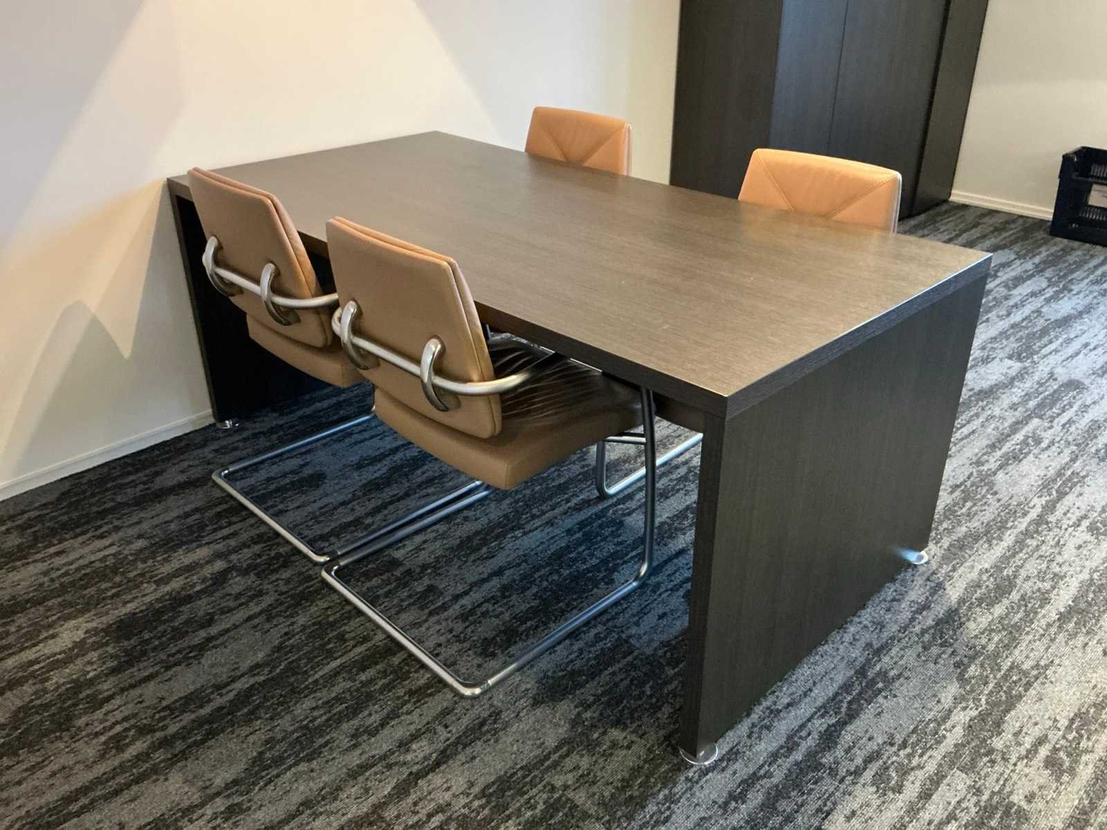 Inhoud van 1 kantoorruimte, bestaande uit een vergadertafel 180x90cm met 4 slede stoelen v.v. lederen bekleding, 1 Hoekbureau 210x200x74cm met ladeblok en bureaustoel, een 4deurs kast 183x46x157cm, 1 hanglamp 3 lichts met stoffen kap.