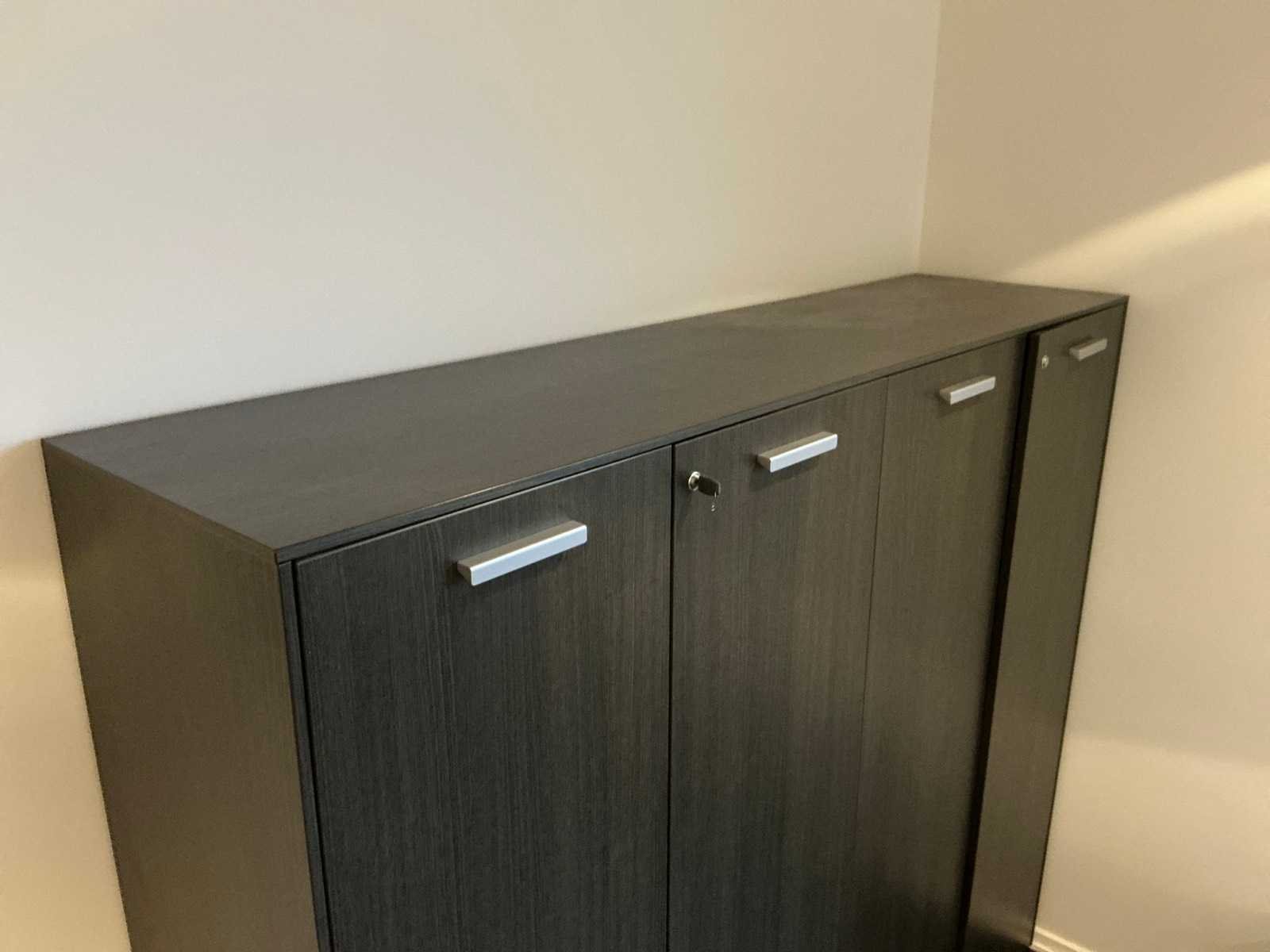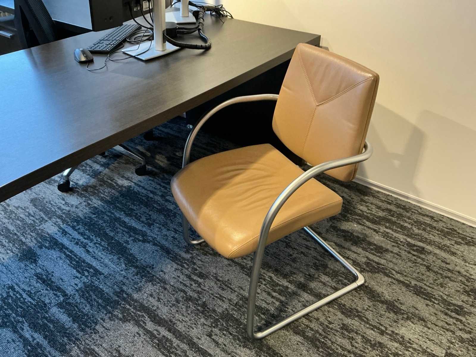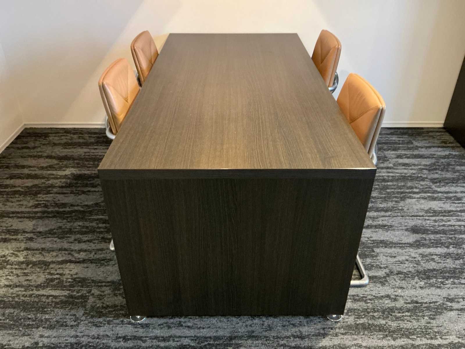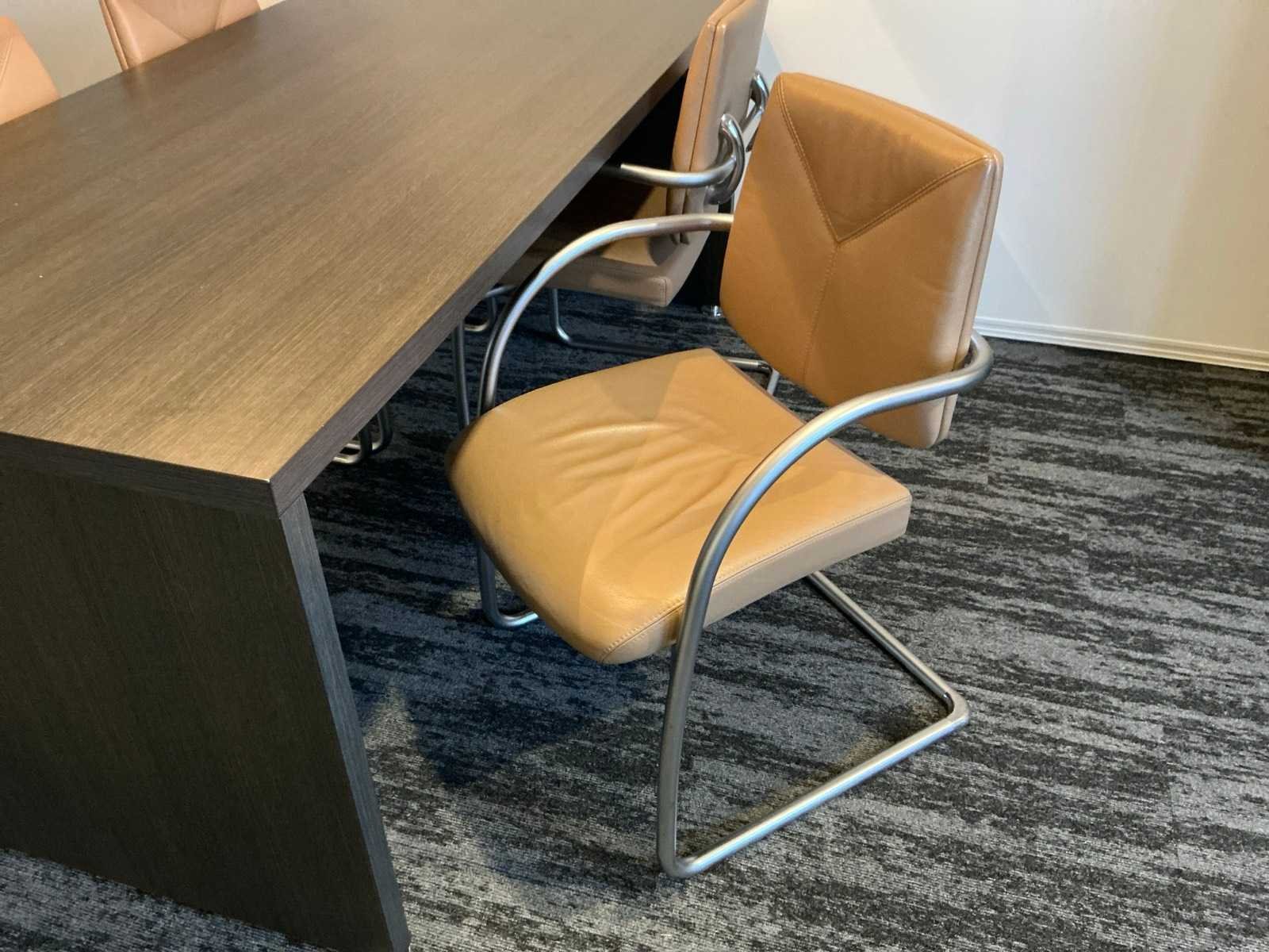 Inhoud van 1 kantoorruimte, bestaande uit een vergadertafel 180x90cm met 4 slede stoelen v.v. lederen bekleding, 1 Hoekbureau 210x200x74cm met ladeblok en bureaustoel, een 4deurs kast 183x46x157cm, 1 hanglamp 3 lichts met stoffen kap.